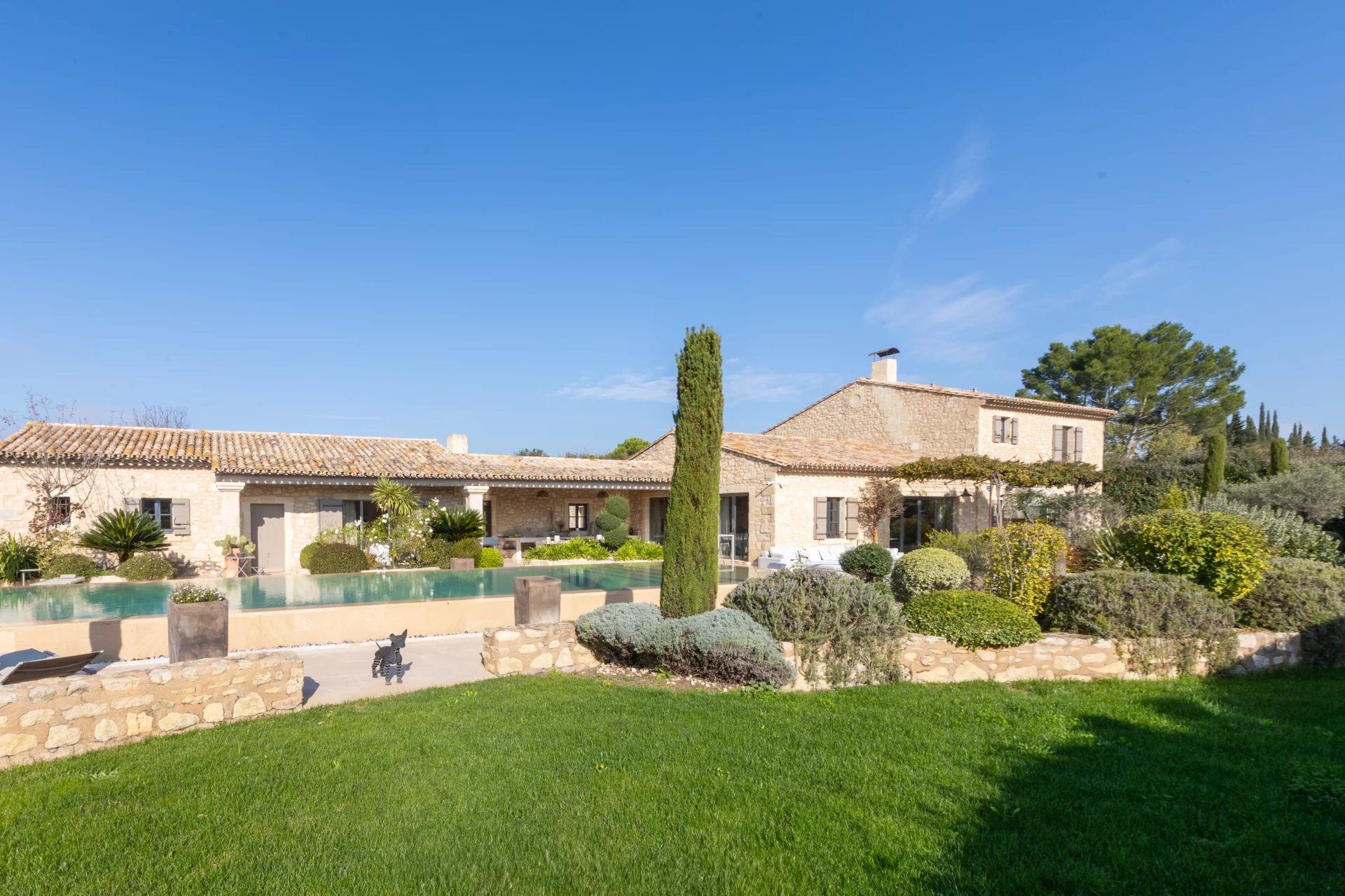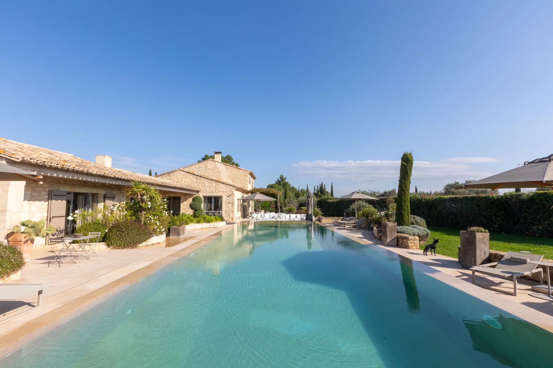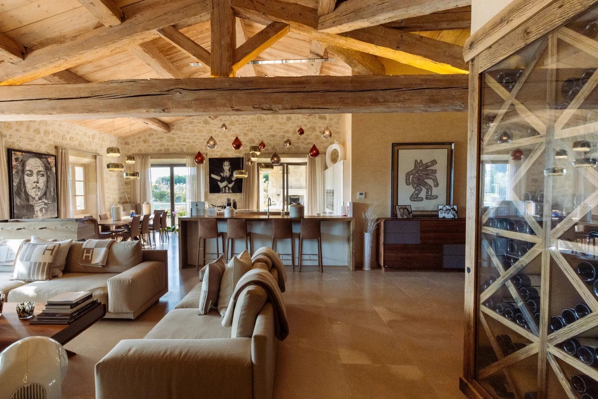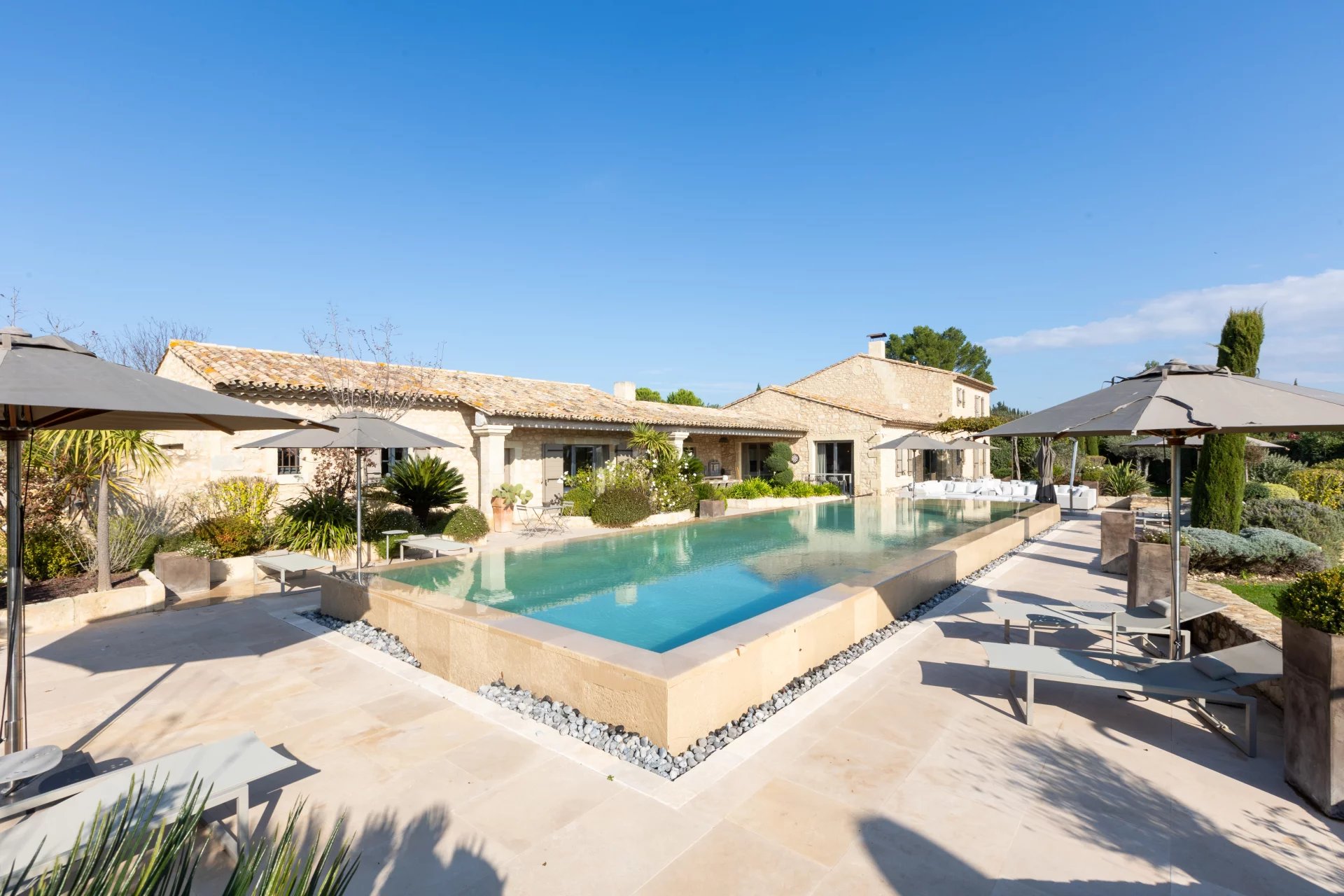 Exposed stonework, spaciousness, luminosity and the choice of natural materials give a feeling of well-being and quality. There are 5 en suite bedrooms, 2 of which are on one level. The 80m2 living room is warm and inviting, opening onto the terrace with its backdrop of the Alpilles mountains.