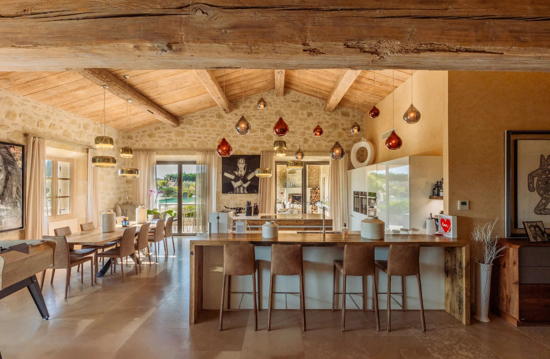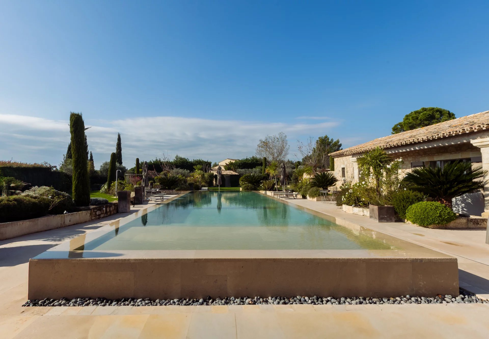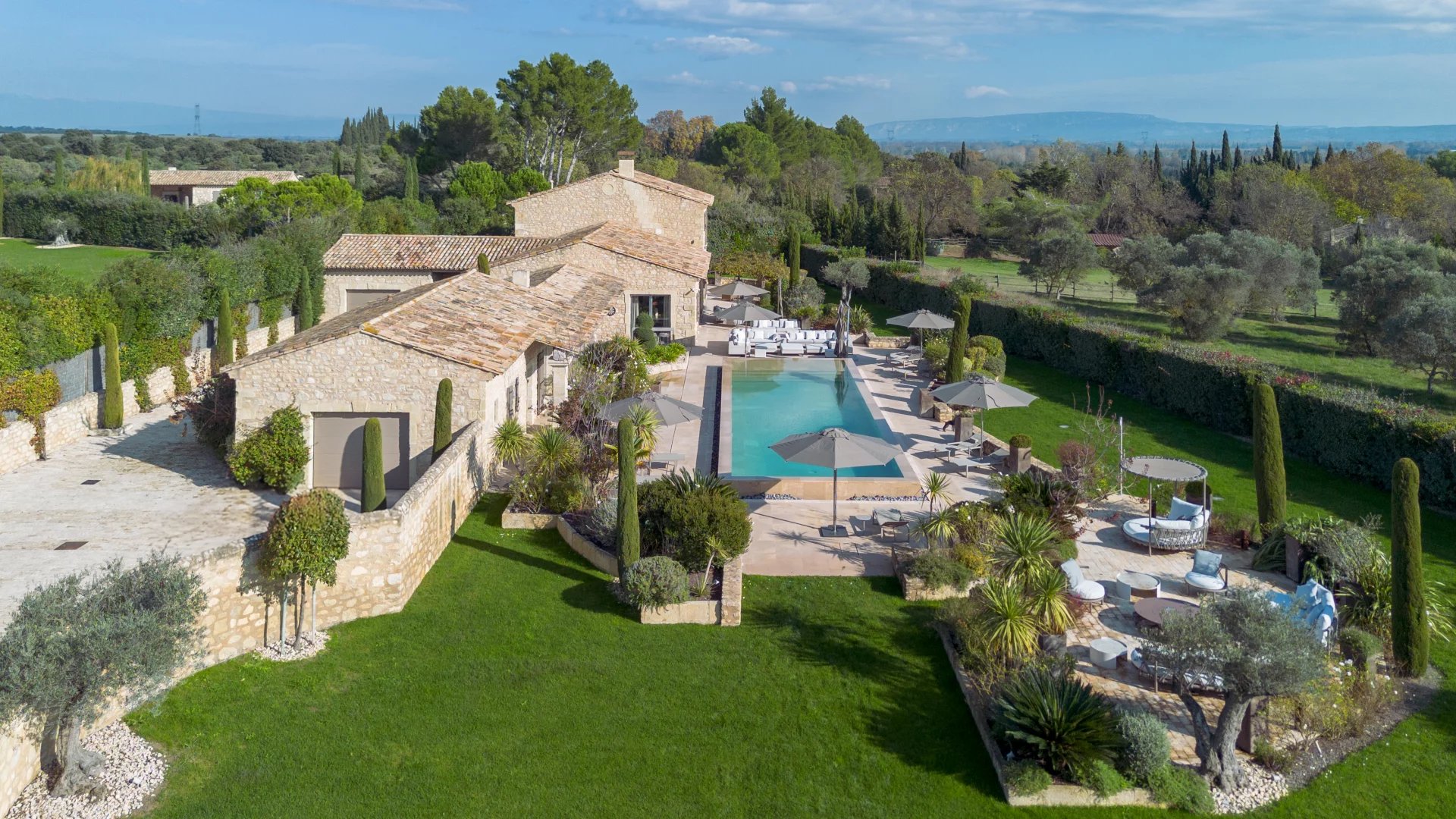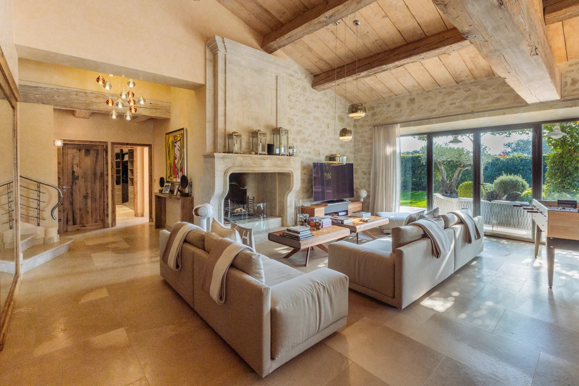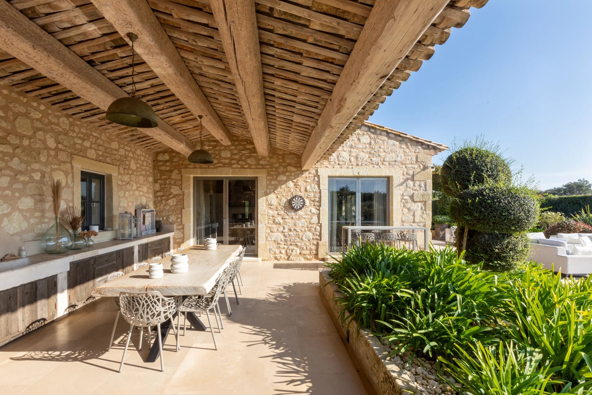 Exposed stonework, spaciousness, luminosity and the choice of natural materials give a feeling of well-being and quality. There are 5 en suite bedrooms, 2 of which are on one level. The 80m2 living room is warm and inviting, opening onto the terrace with its backdrop of the Alpilles mountains.