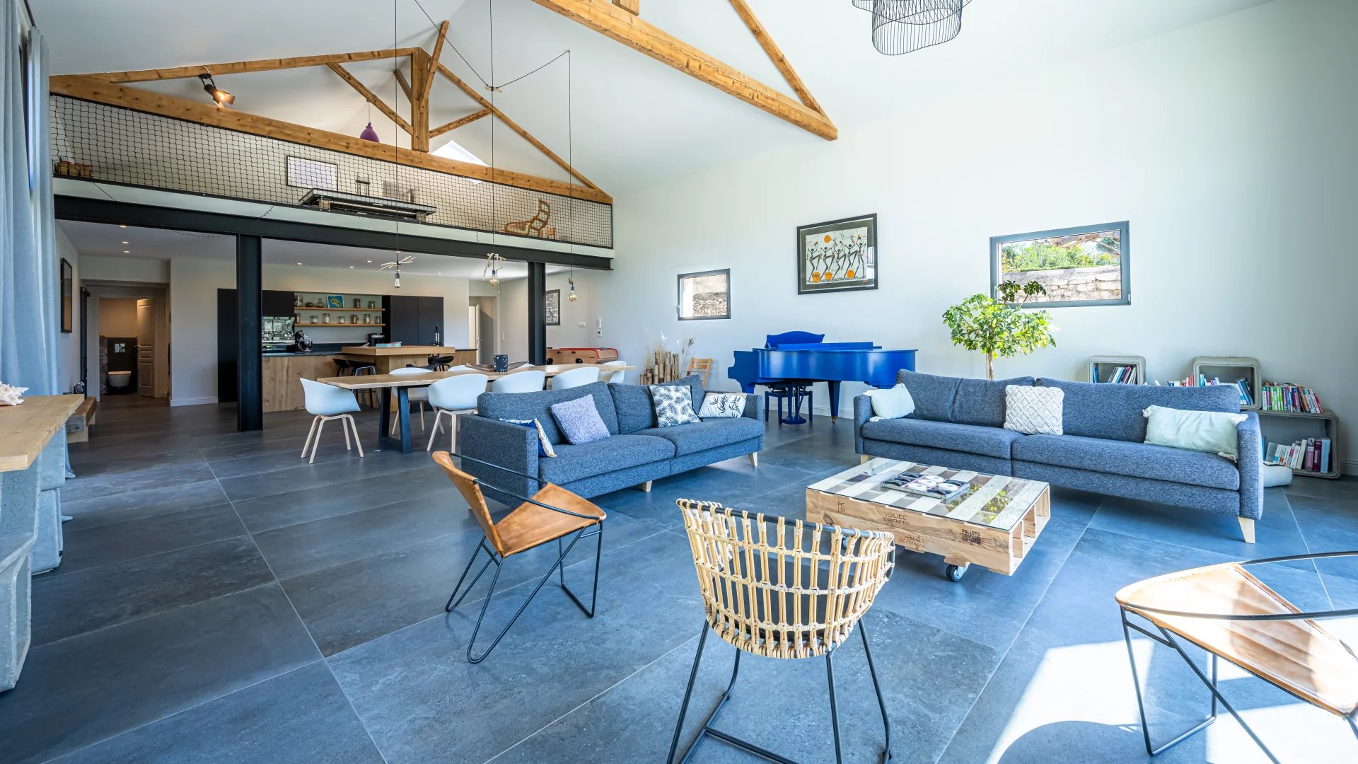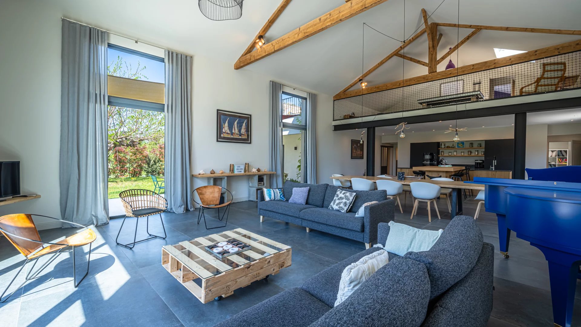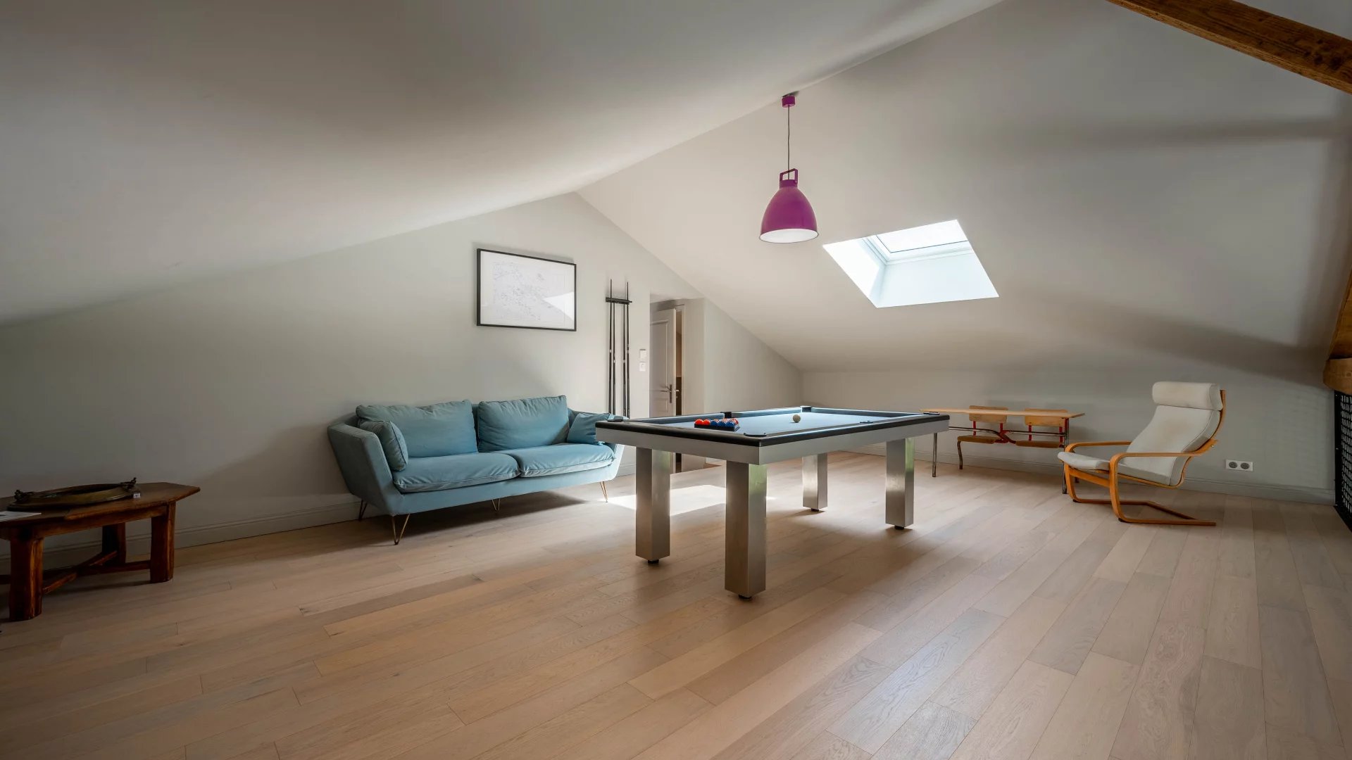 The convivial open-plan living room comprises a well-equipped kitchen, a dining area and a lounge with large doors that give on to the south facing garden. Also on the ground floor are 4 bedrooms, 3 of which being generously sized master-suites. Up on the first floor are 2 further bedrooms with en-suite shower rooms, and a second reception area on the mezzanine, which is currently used as a billiard room.