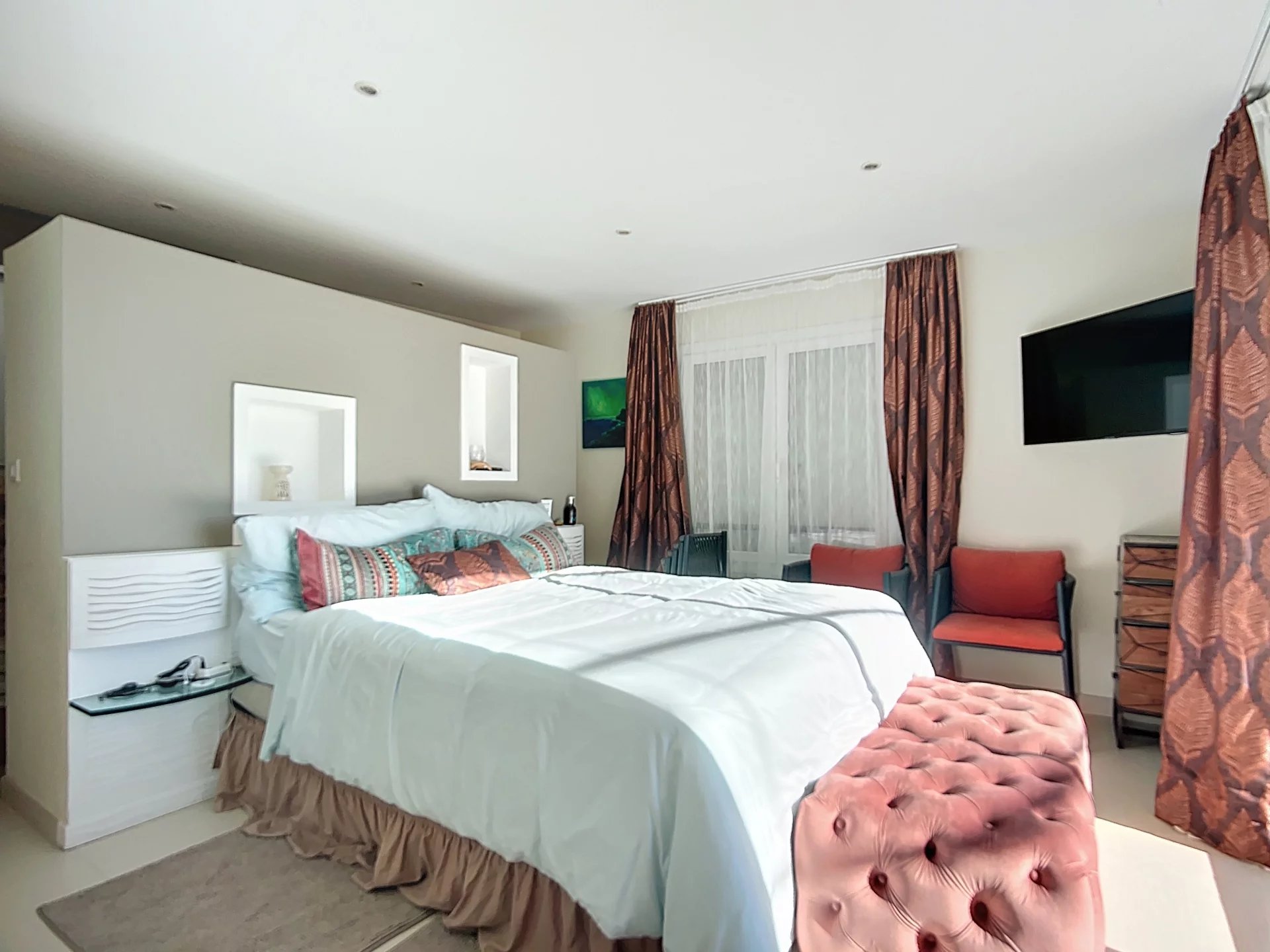 Located on the last floor of a building with a digital entry code in the centre town, splendid flat about 103 m2 which offers a big lounge with an equipped American kitchen, pantry, bedroom with en-suite bathroom and dressing area, toilets, 2 bedrooms, shower room, toilet, a wonderful vast terrace of about 50 m2 with panoramic view over the town and out over the gulf of St Tropez.