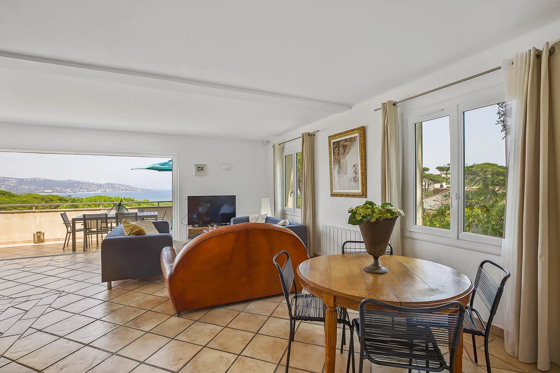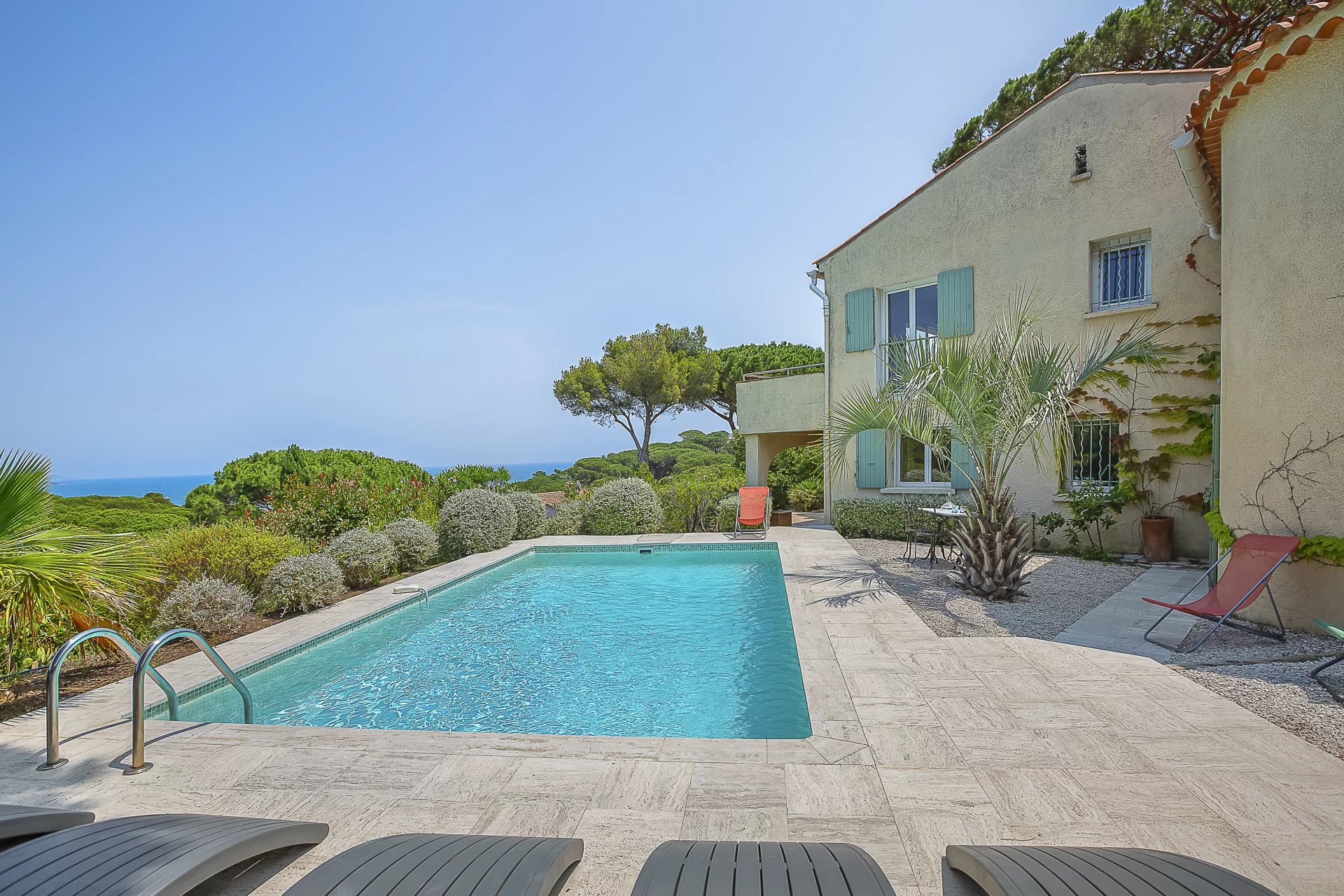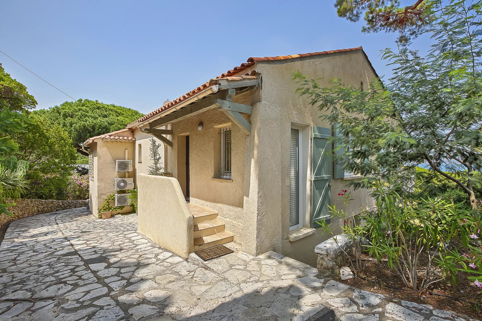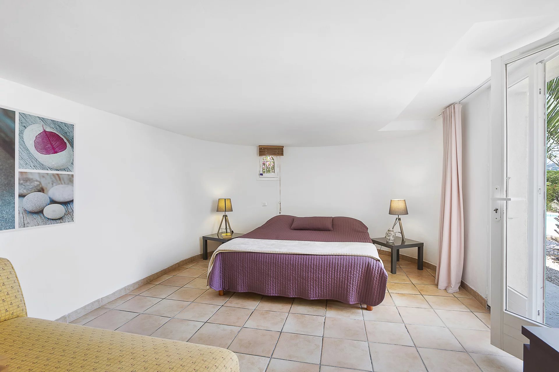 The lower level includes three bedrooms, all with exits to the garden, bathroom with toilet, shower room with toilet, guest toilet, laundry room, as well as a covered terrace with beautiful views of the Esterel Mountain Range and the sea.