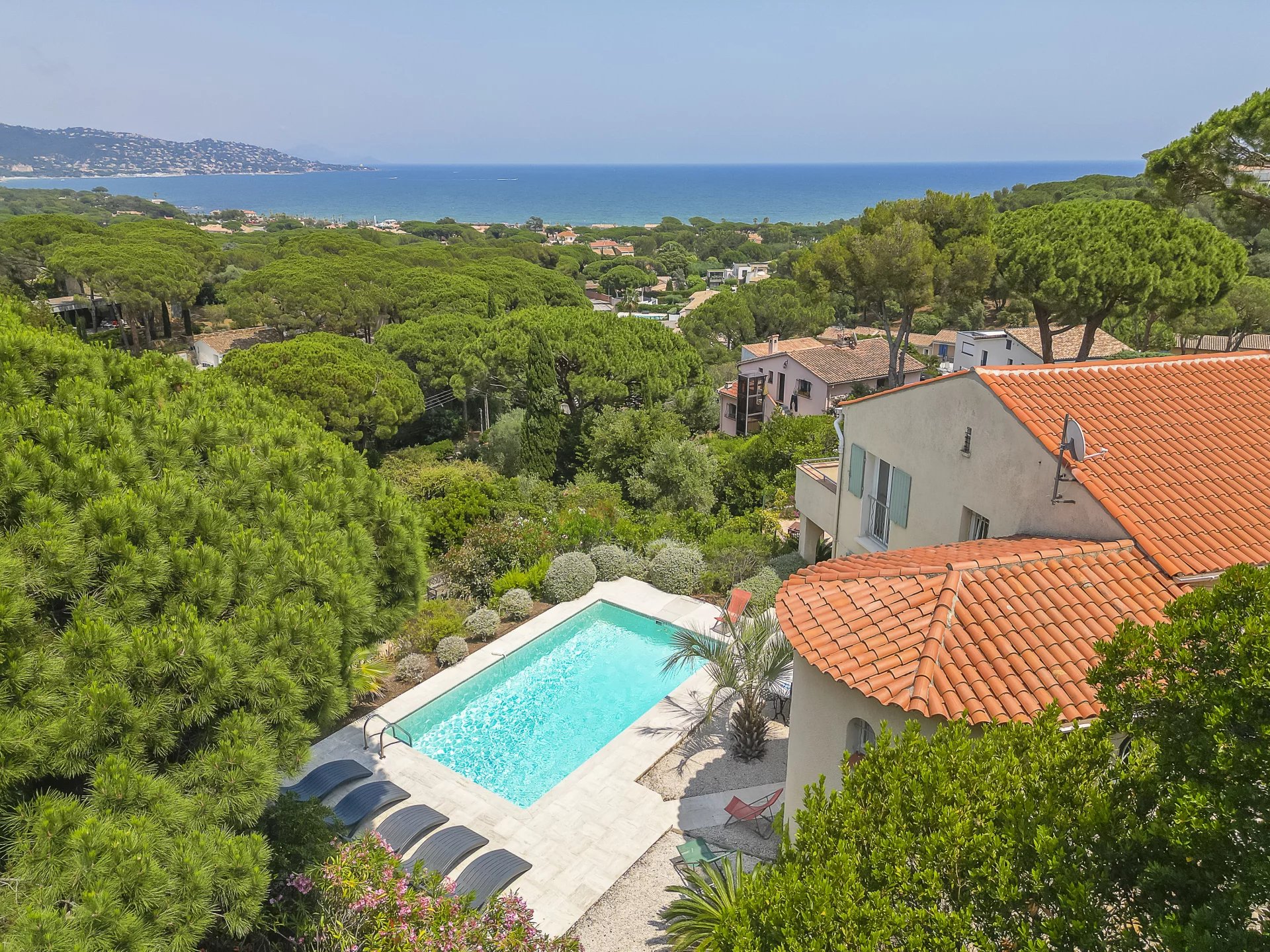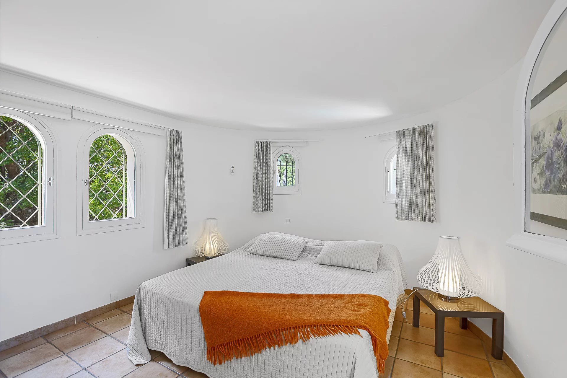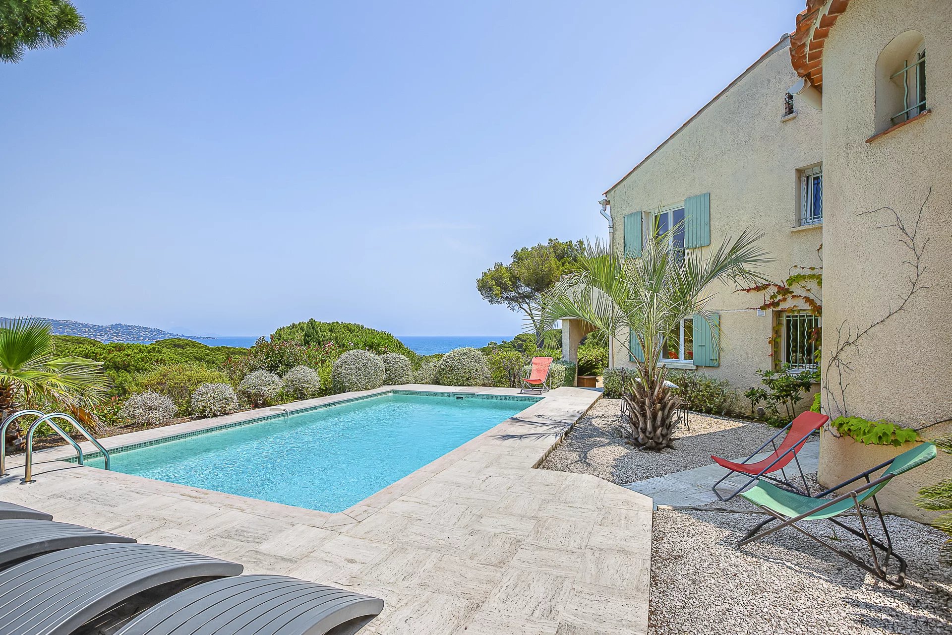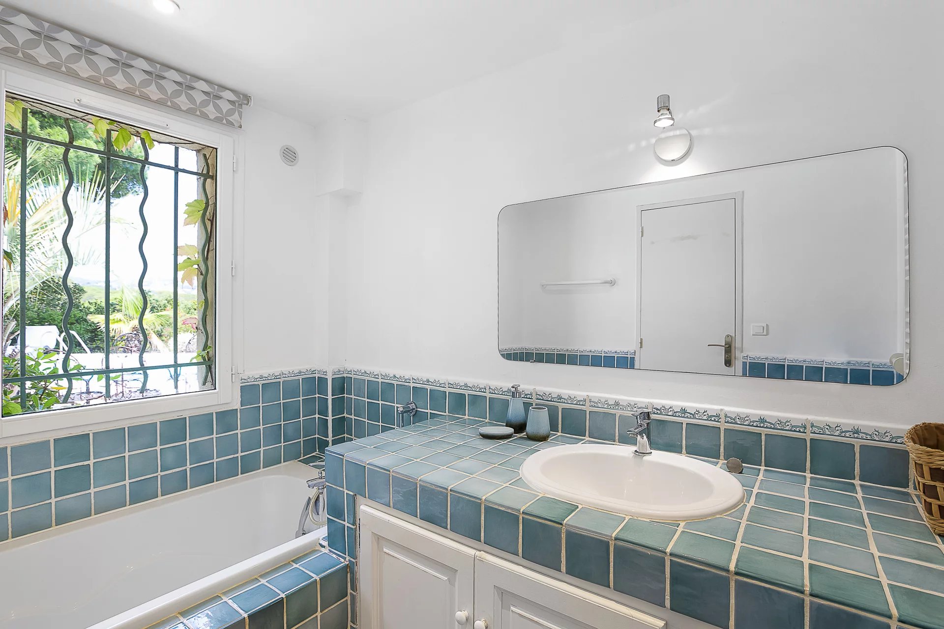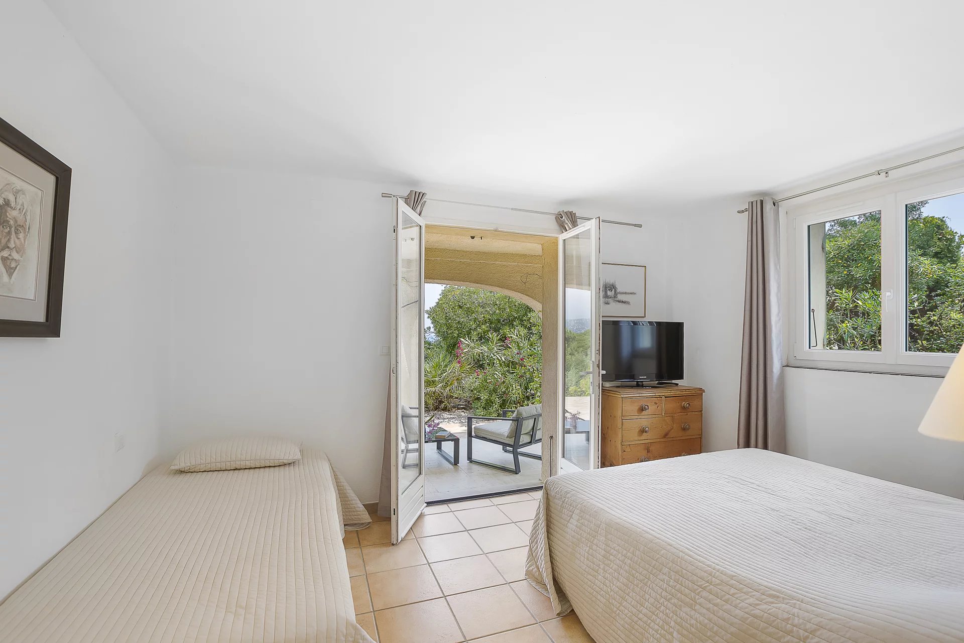 The lower level includes three bedrooms, all with exits to the garden, bathroom with toilet, shower room with toilet, guest toilet, laundry room, as well as a covered terrace with beautiful views of the Esterel Mountain Range and the sea.