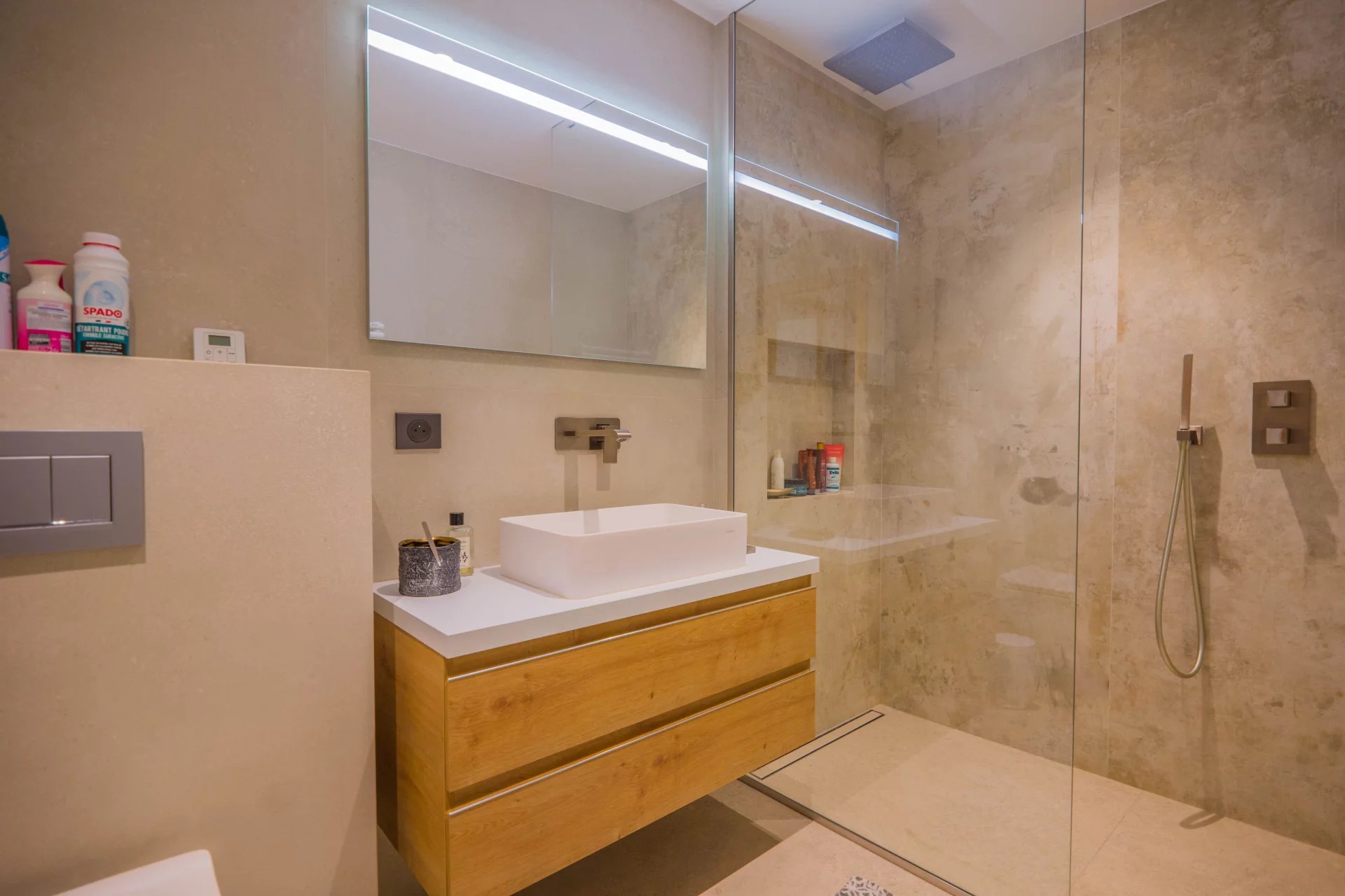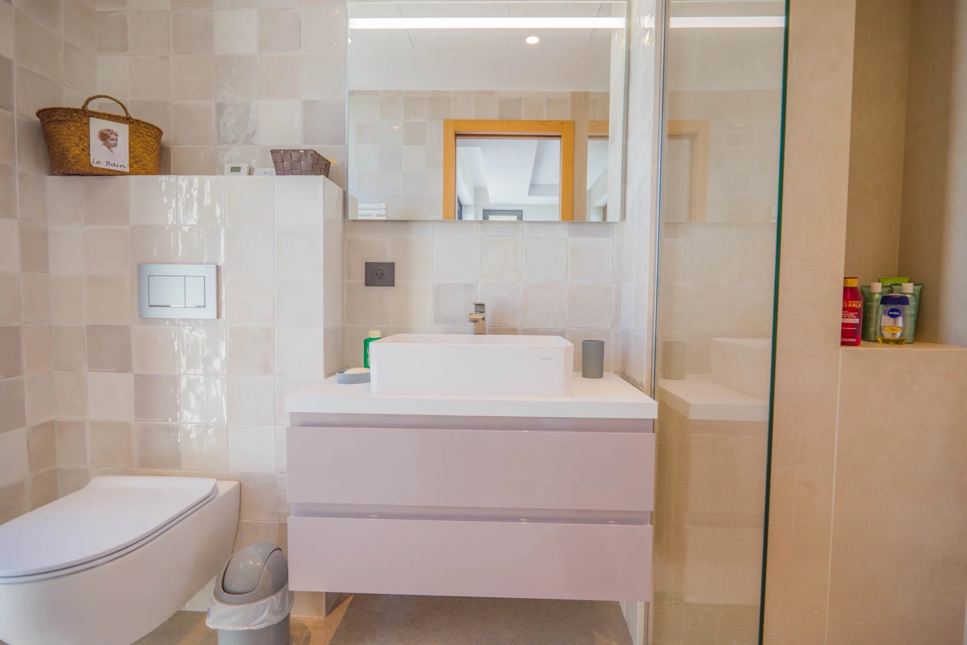 The interior comprises a large living room with an open, modern equipped kitchen, 5 spacious bedrooms, each with its own bathroom/shower.