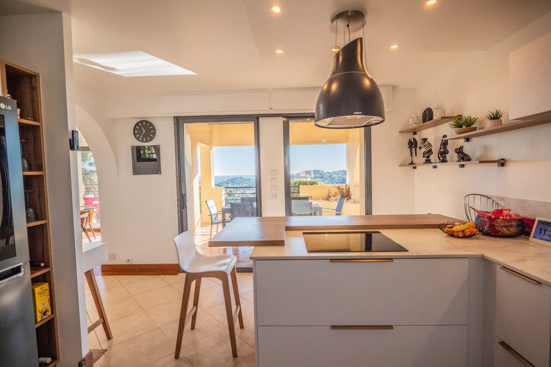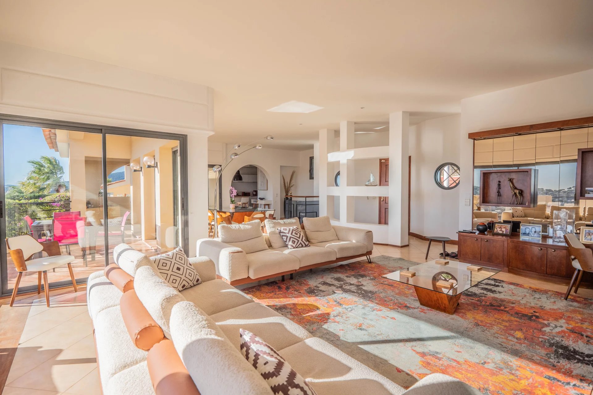 This grand family sized property benefits from a double sea view and has a living area of 249 m2 and is composed of a spacious and bright living room with large bay windows, a fully equipped open kitchen, and 4 bedrooms en suite.