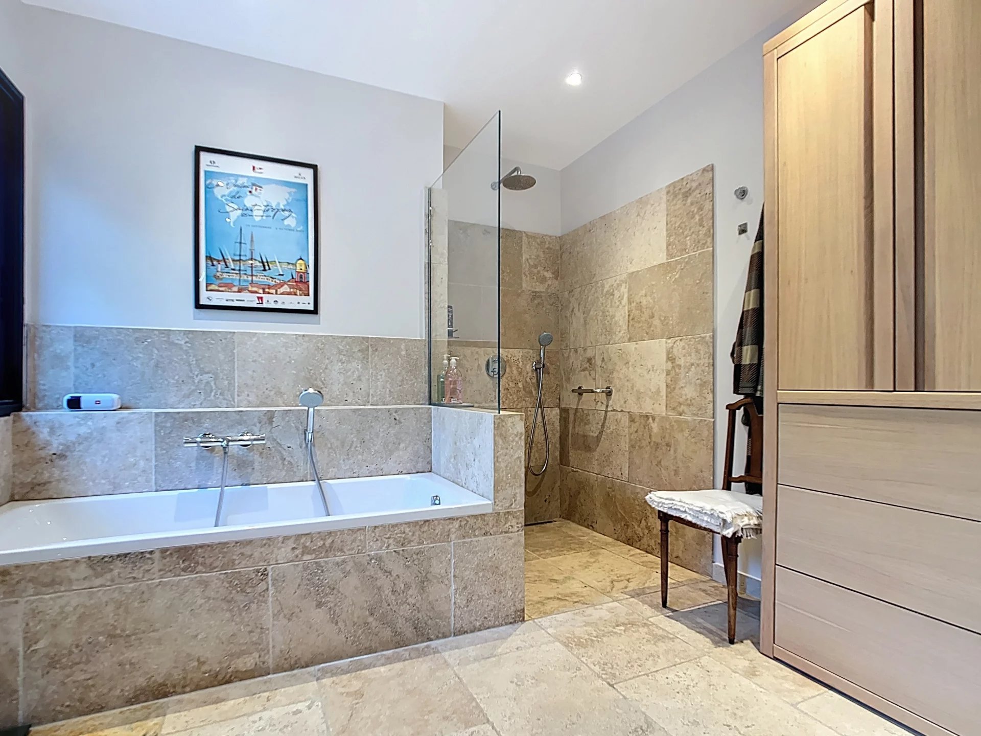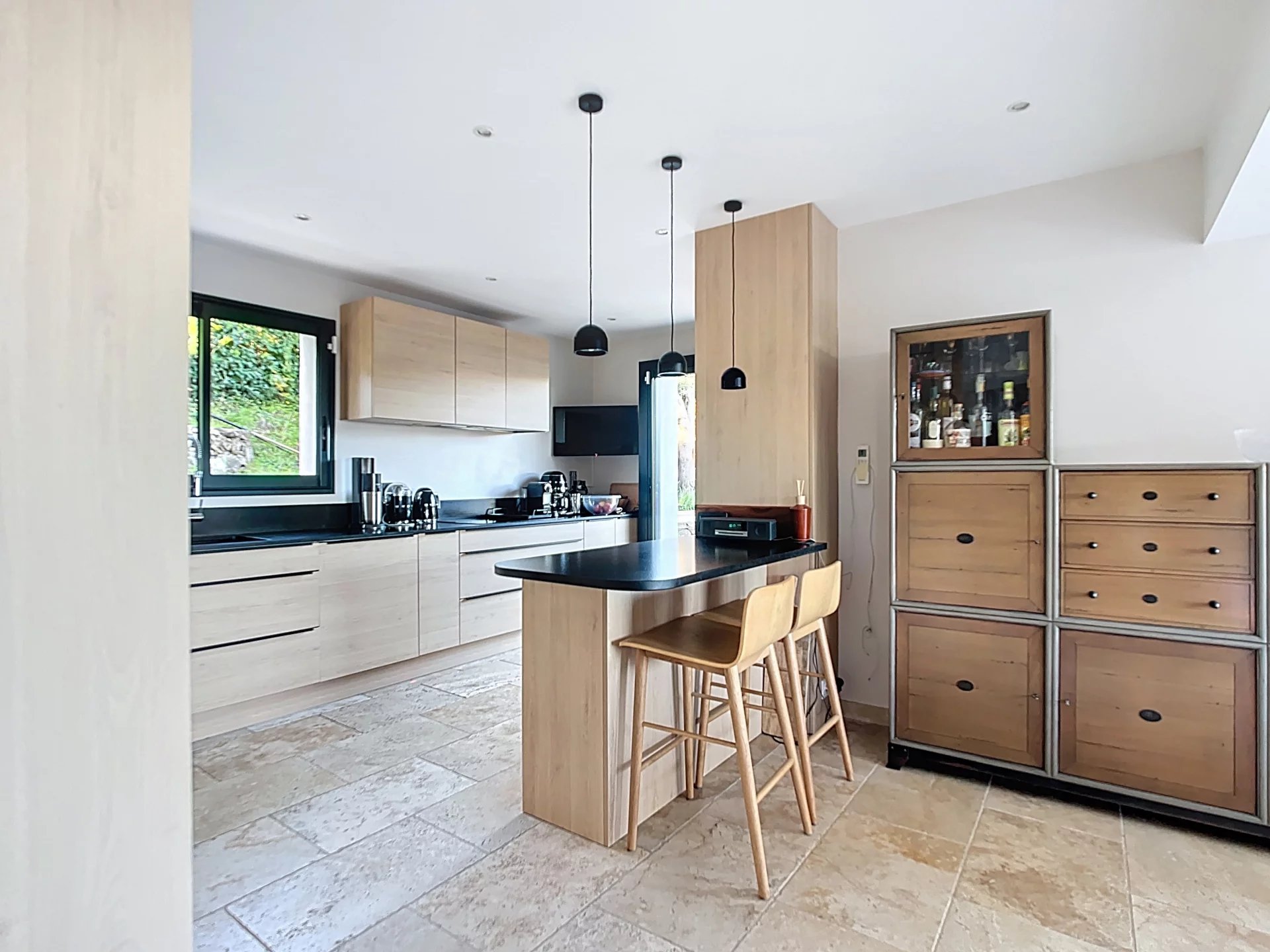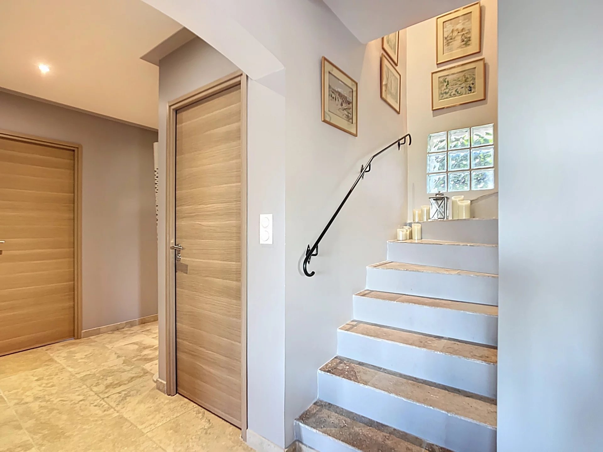 This modern and cosy villa has been beautifully renovated. Total surface area of approximately 270m2, quiet neighbourhood. Spacious 6-bedroom villa (including a one-bedroom apartment on the ground floor). The house offers an office, mezzanine TV room, garage, 2 cellars, carport, garden shed, heated swimming pool.