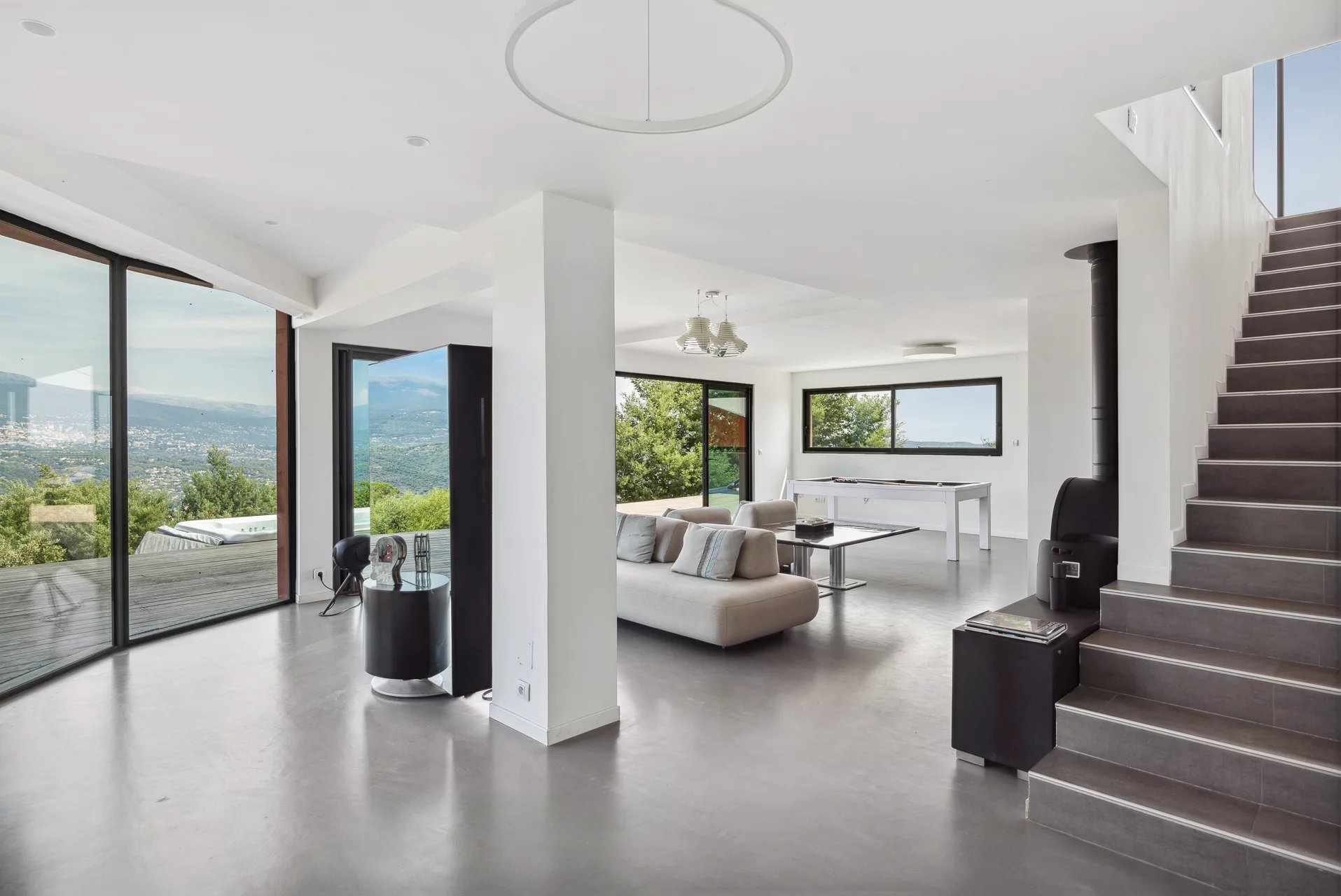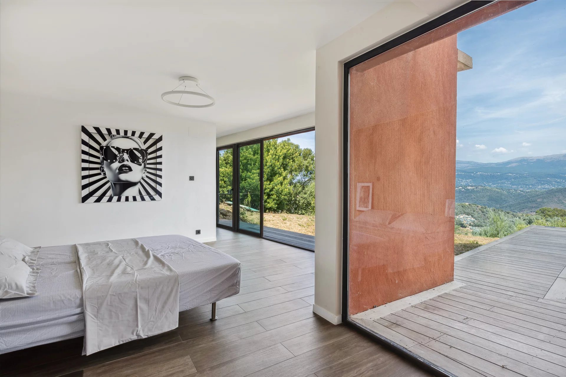 Just 15 minutes from Mandelieu, nestled in an exceptional natural setting, in the Var countryside, this contemporary villa offers breathtaking panoramic views from the mountains to the sea.