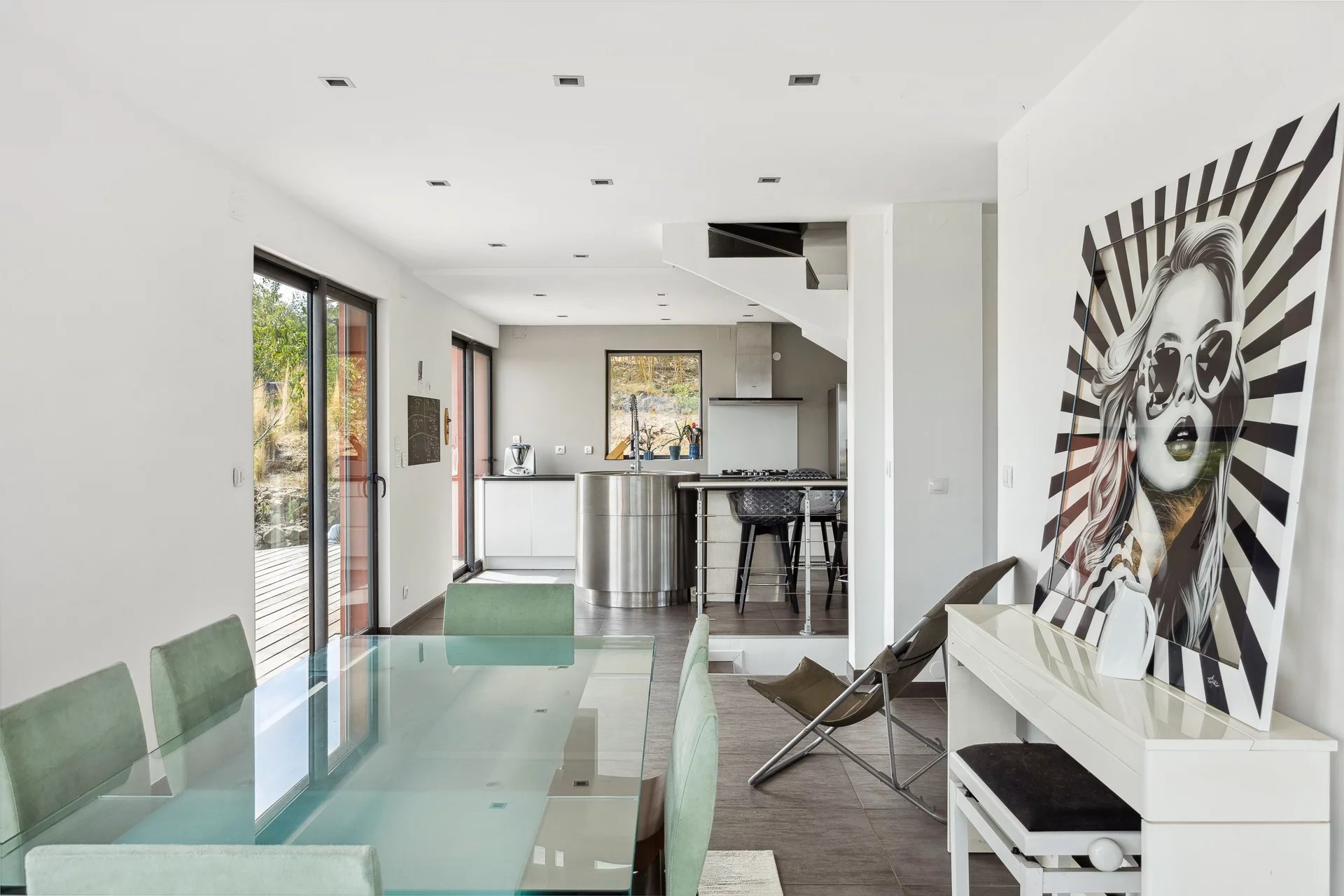 – Additional garden-level lounge opening onto a large terrace