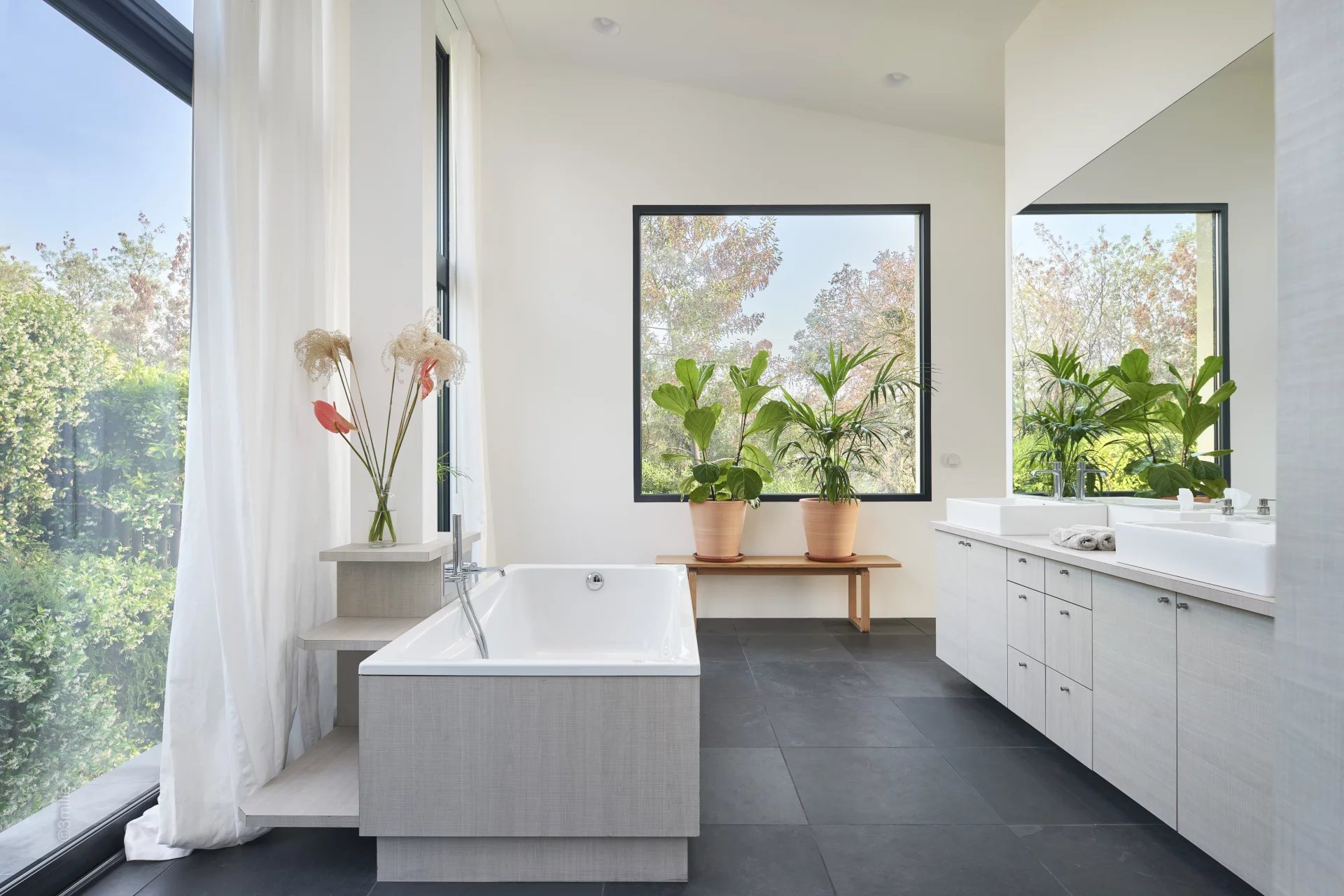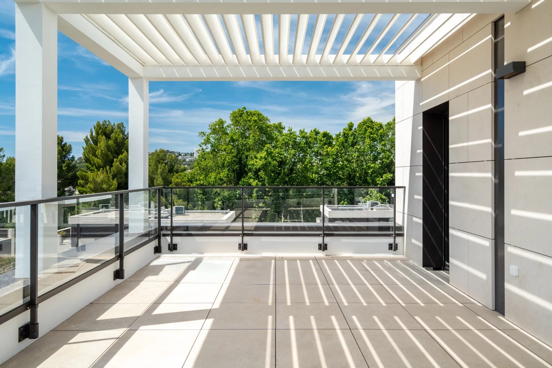 On its lower level, the property is planted with olive trees, pines and fruit trees whose scents spread pleasantly with the breeze, the living/dining room with large bay windows offers great volumes and beautiful heights under ceiling additionally a bright mezzanine with a quiet office and a reading area. The dining room next to the kitchen offers a pleasant space of conviviality with family or friends.