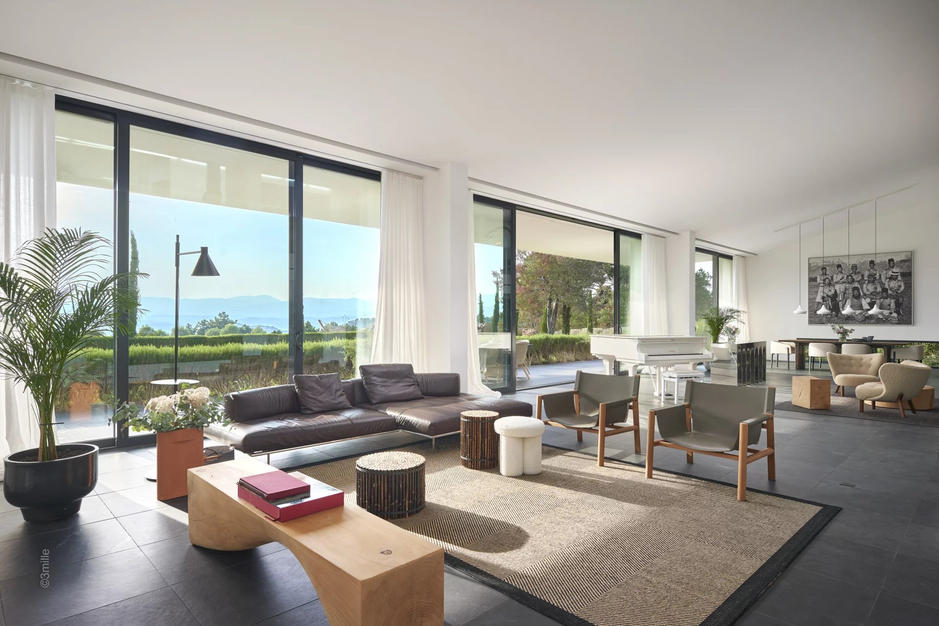 This property with luxurious fixtures and fittings, advanced surveillance system, offers the possibility of landing by helicopter. This home will, without doubt seduce lovers of contemporary architecture who are looking for large spaces and peace, whilst being close to Cannes and the Riviera beaches.