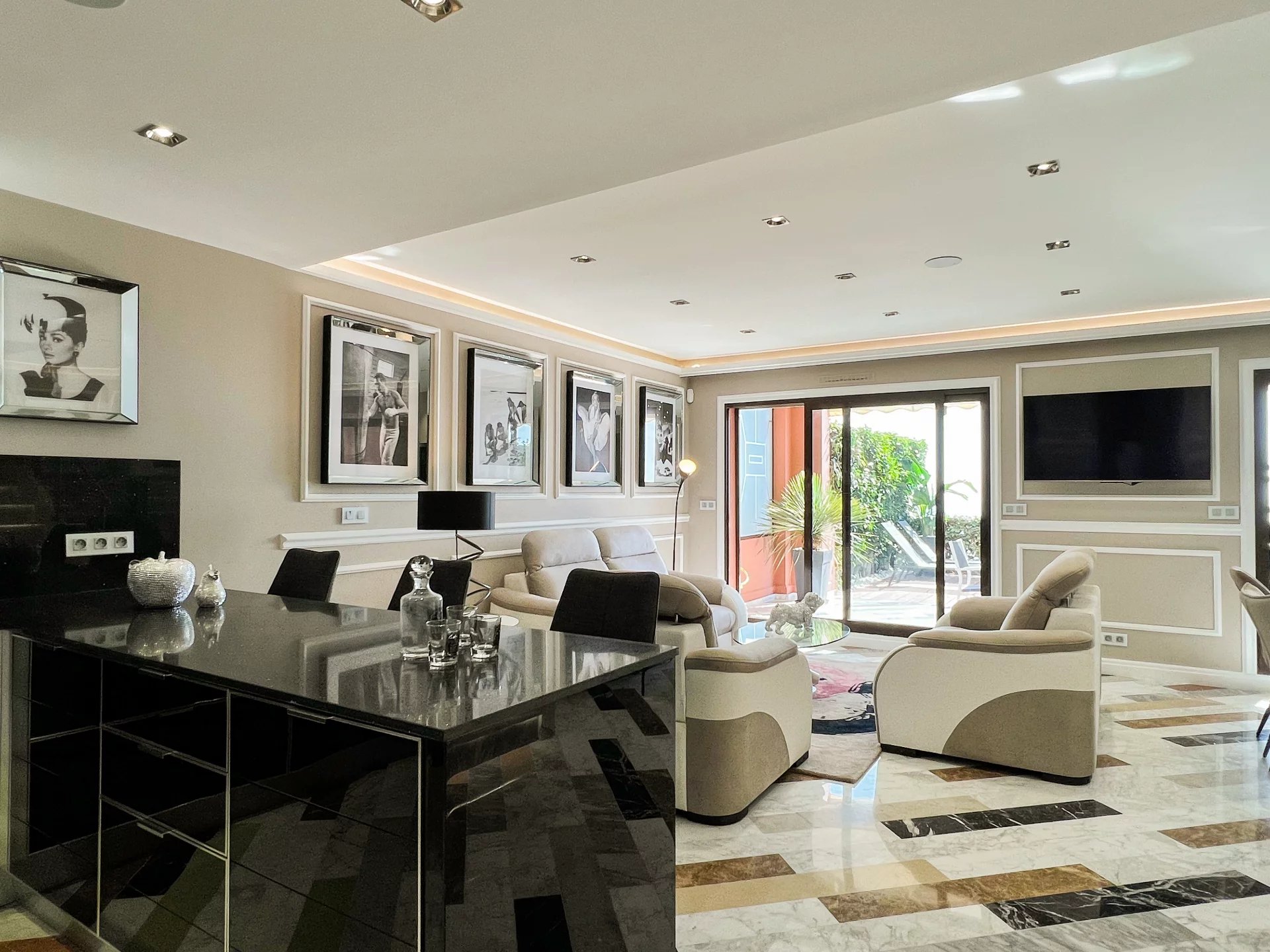 Renovated with taste, the apartment consists of an entrance with cupboard, a living/dining room with an open-plan kitchen, all opening onto the terrace with garden of 30sqm with sea view. Laundry room and a guest WC on same level.