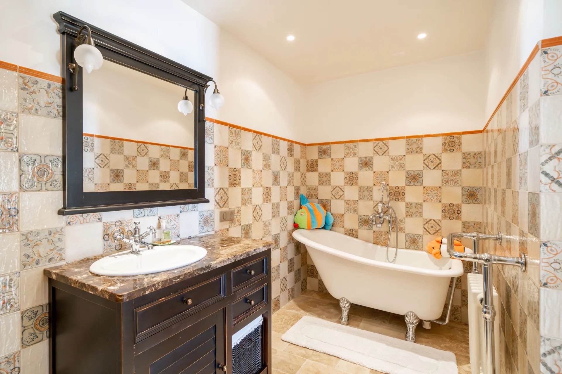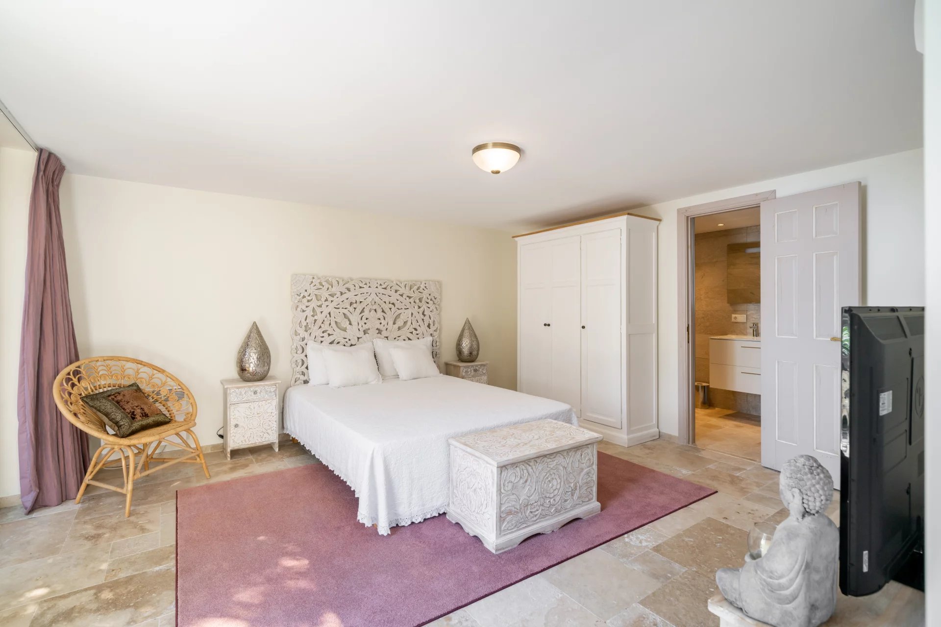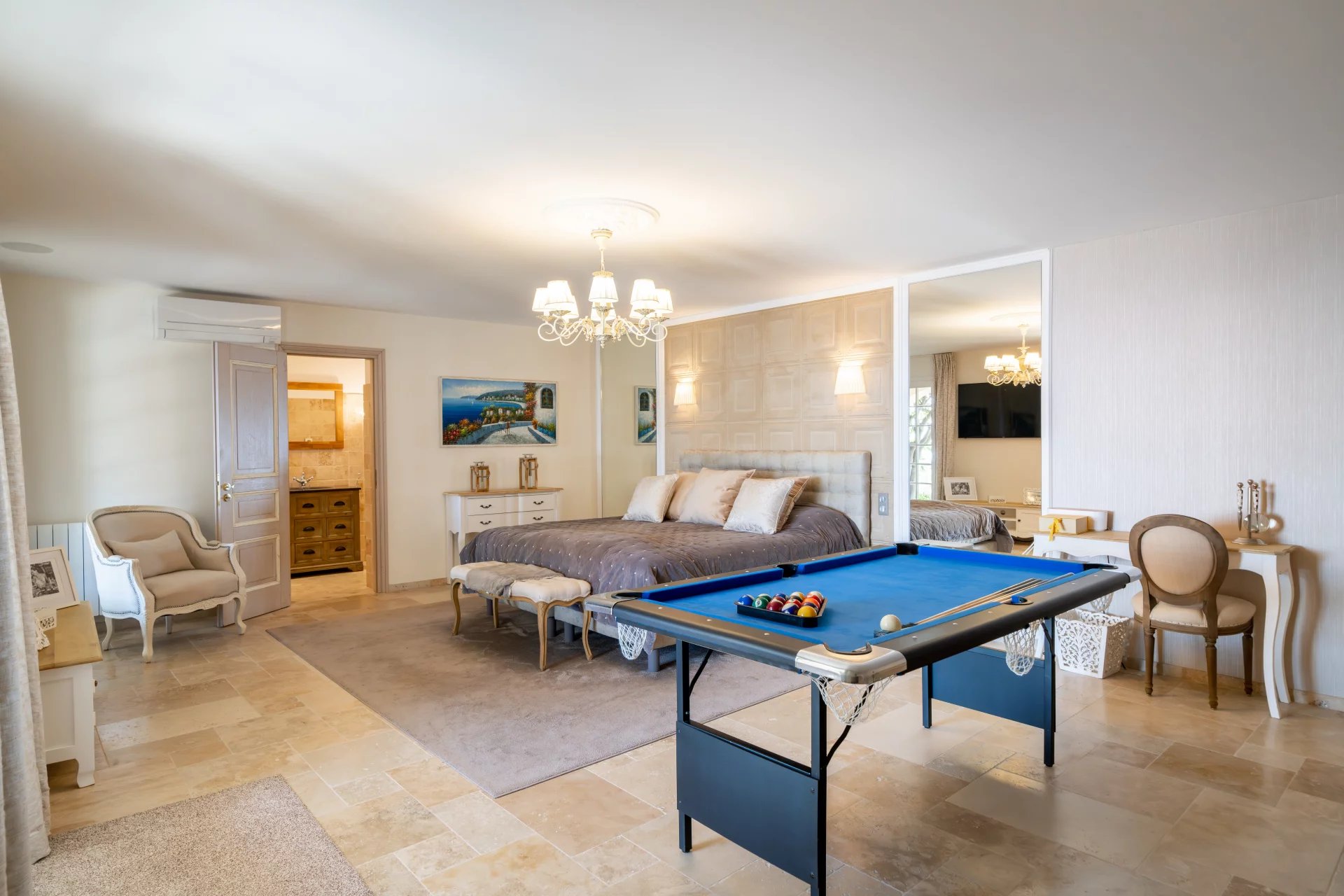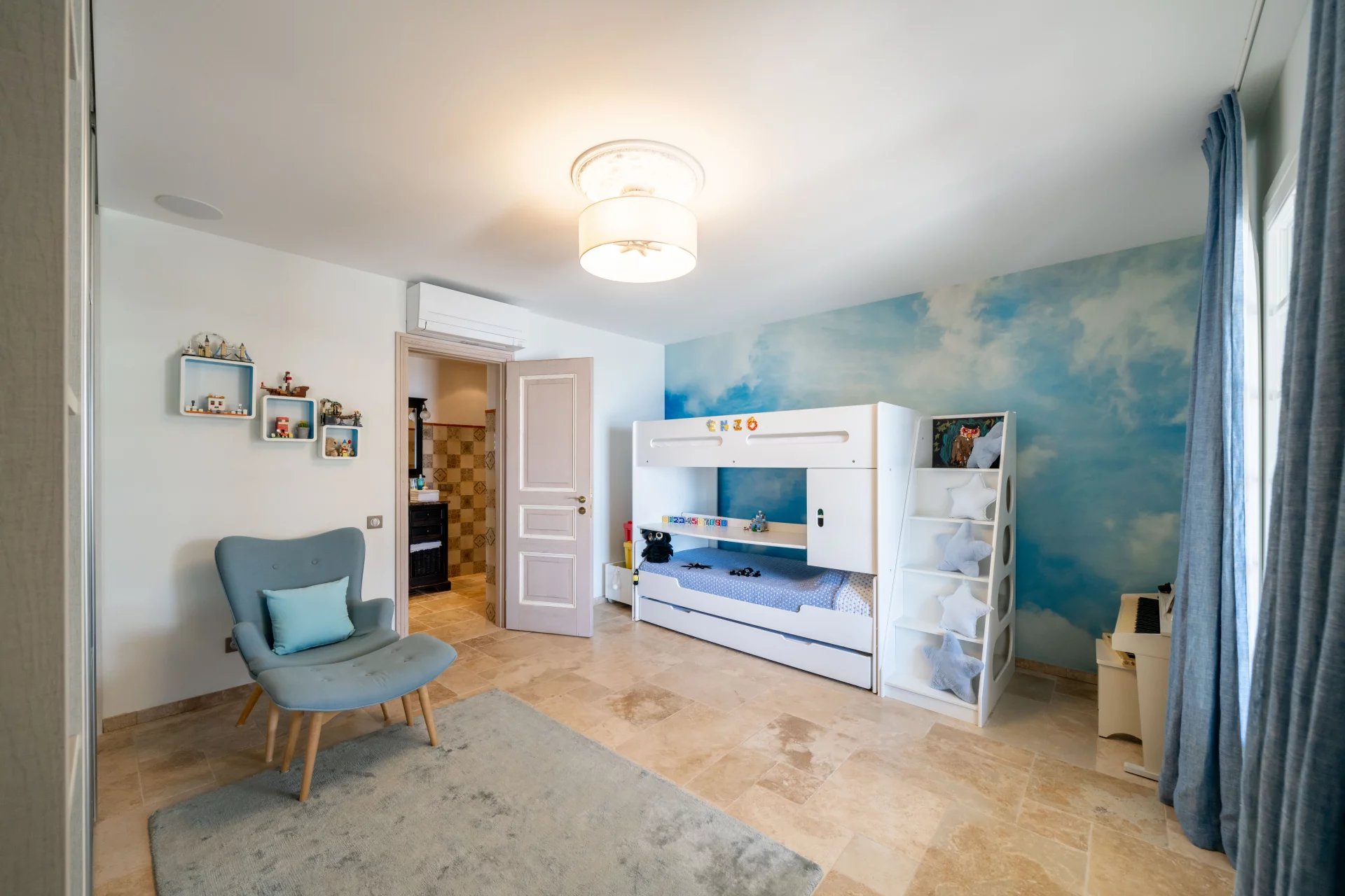 On the lower level (garden level), there is another en-suite bedroom with a bathroom, a laundry room, and a spacious master bedroom with a bathroom and dressing room. All rooms on this level open onto the terraces and the pool area.