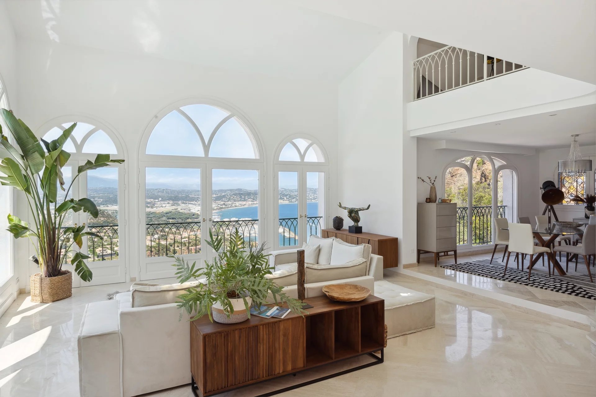 Facing the Bay of Cannes, on a hillside and out of sight, in the heart of the most sought-after gated estate in Theoule, this elegant, fully-renovated property offers exceptional views of the sea and the Estérel.