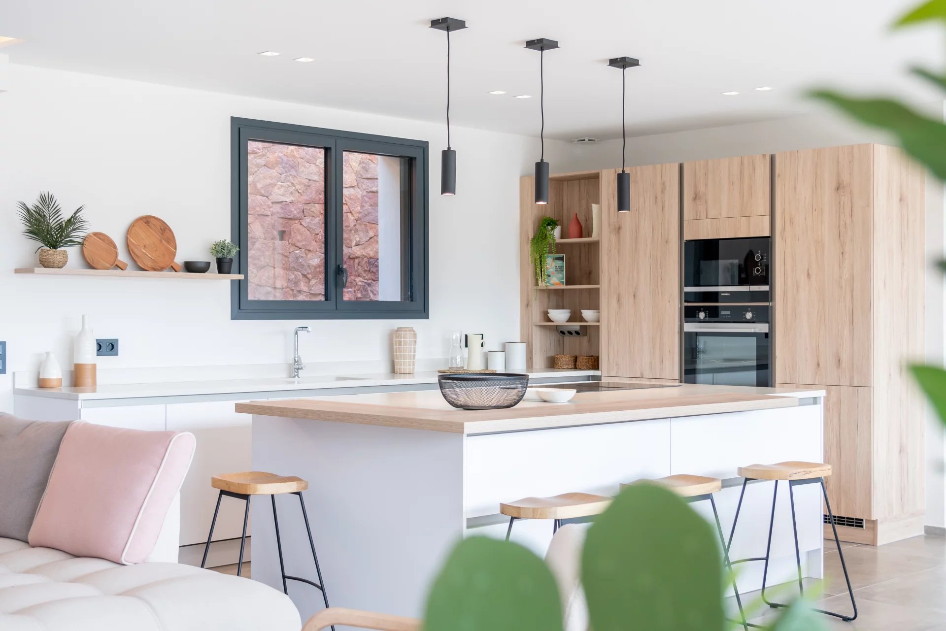 This contemporary new villa, just 5 minutes from the town center, features a bright double living room with a breathtaking view of the Pointe de l’Aiguille and the Lerins islands, and a fully-equipped open-plan kitchen.
