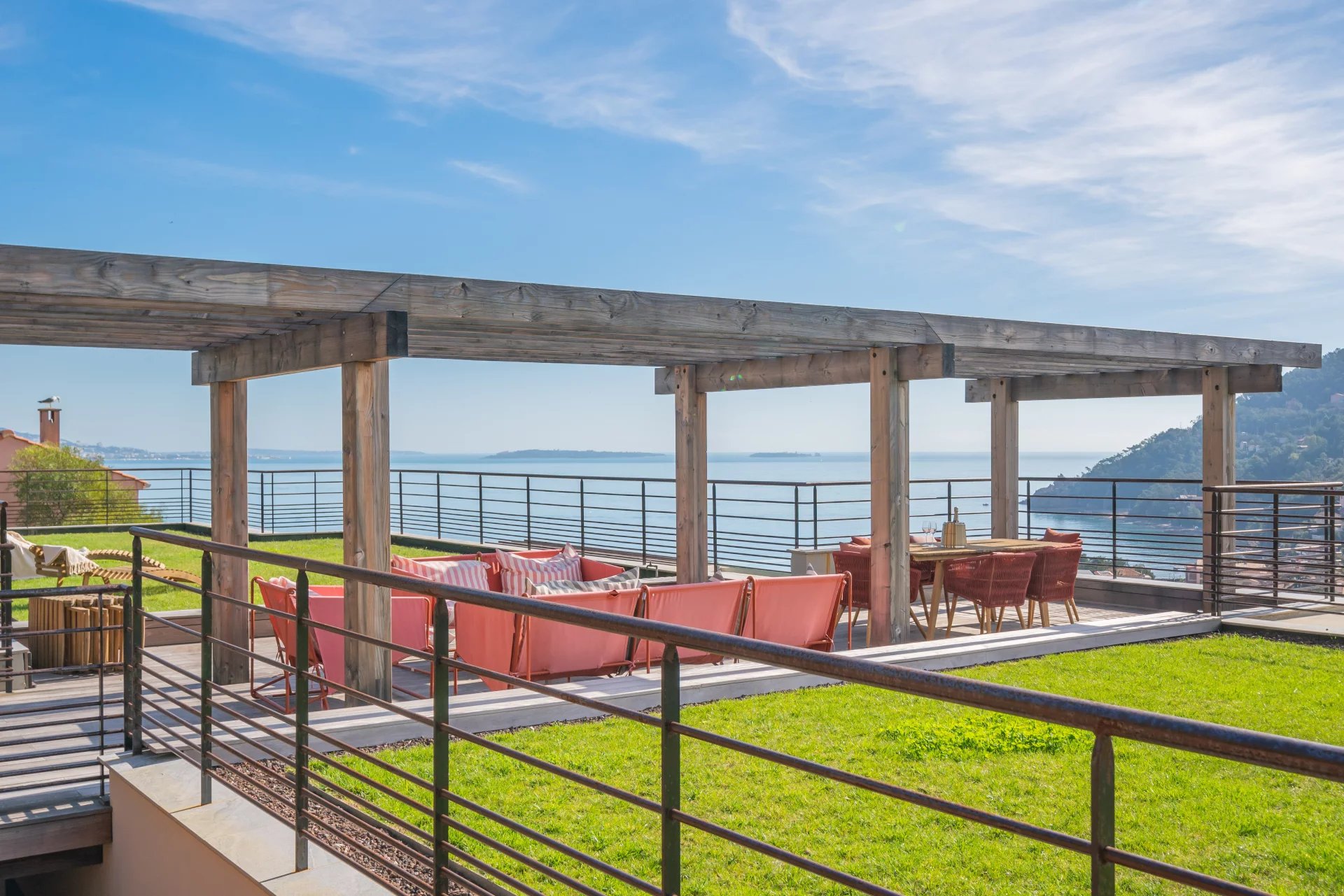 The modern architecture of this house features a superb roof garden and an offset swimming pool offering panoramic views of the Mediterranean.