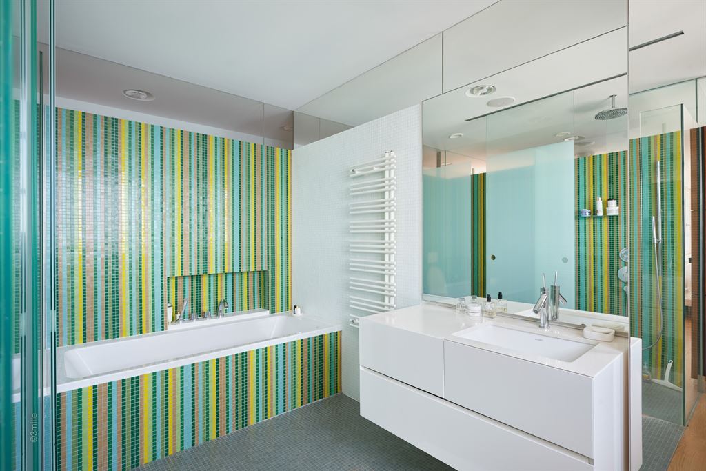 Outdoors, several terraces lead to the sea, complemented by a swimming pool, private beach, and rooftop terrace.