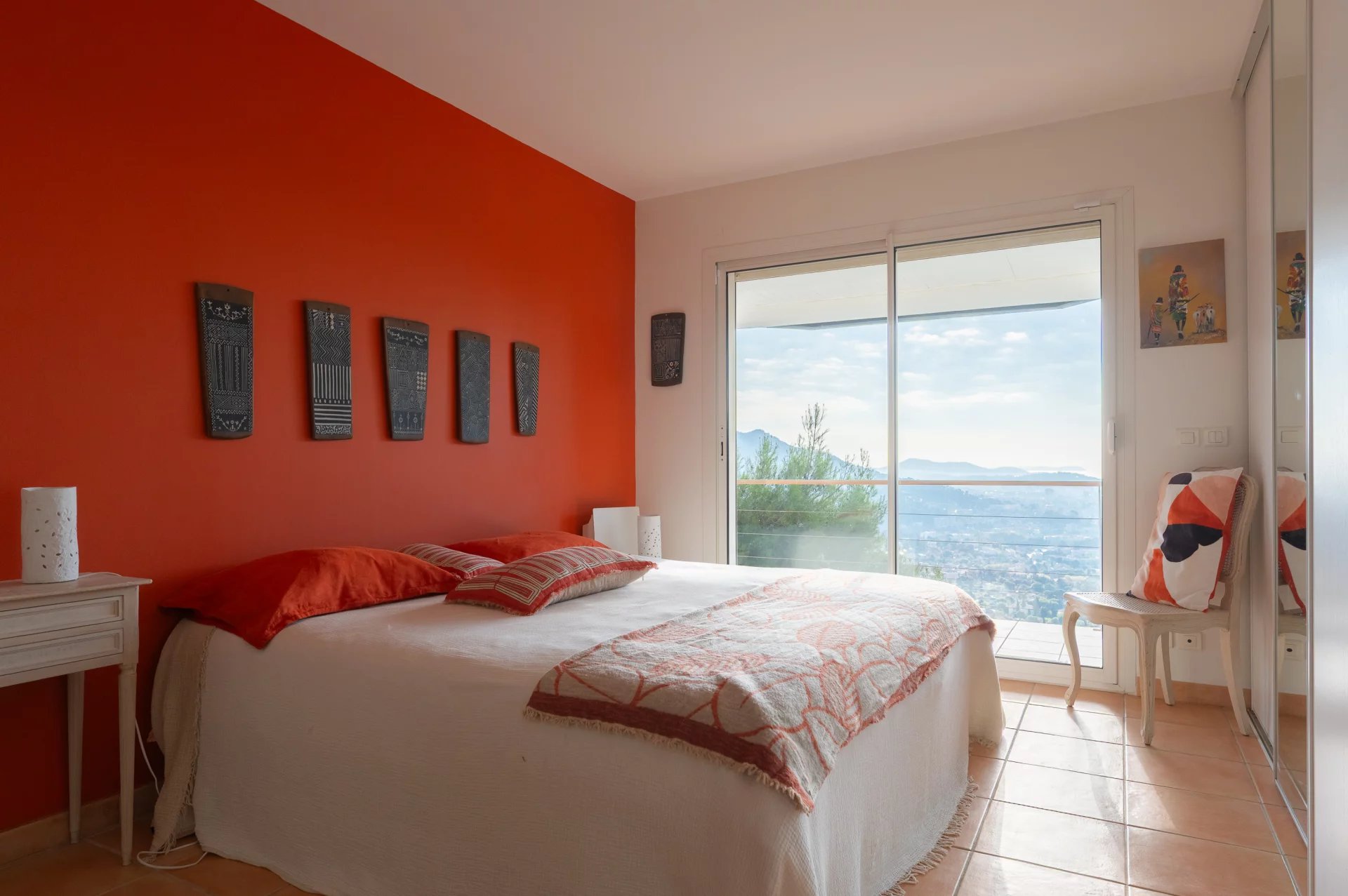The lower level houses two bedrooms with large built-in closets, each with access to a terrace, as well as a bathroom.