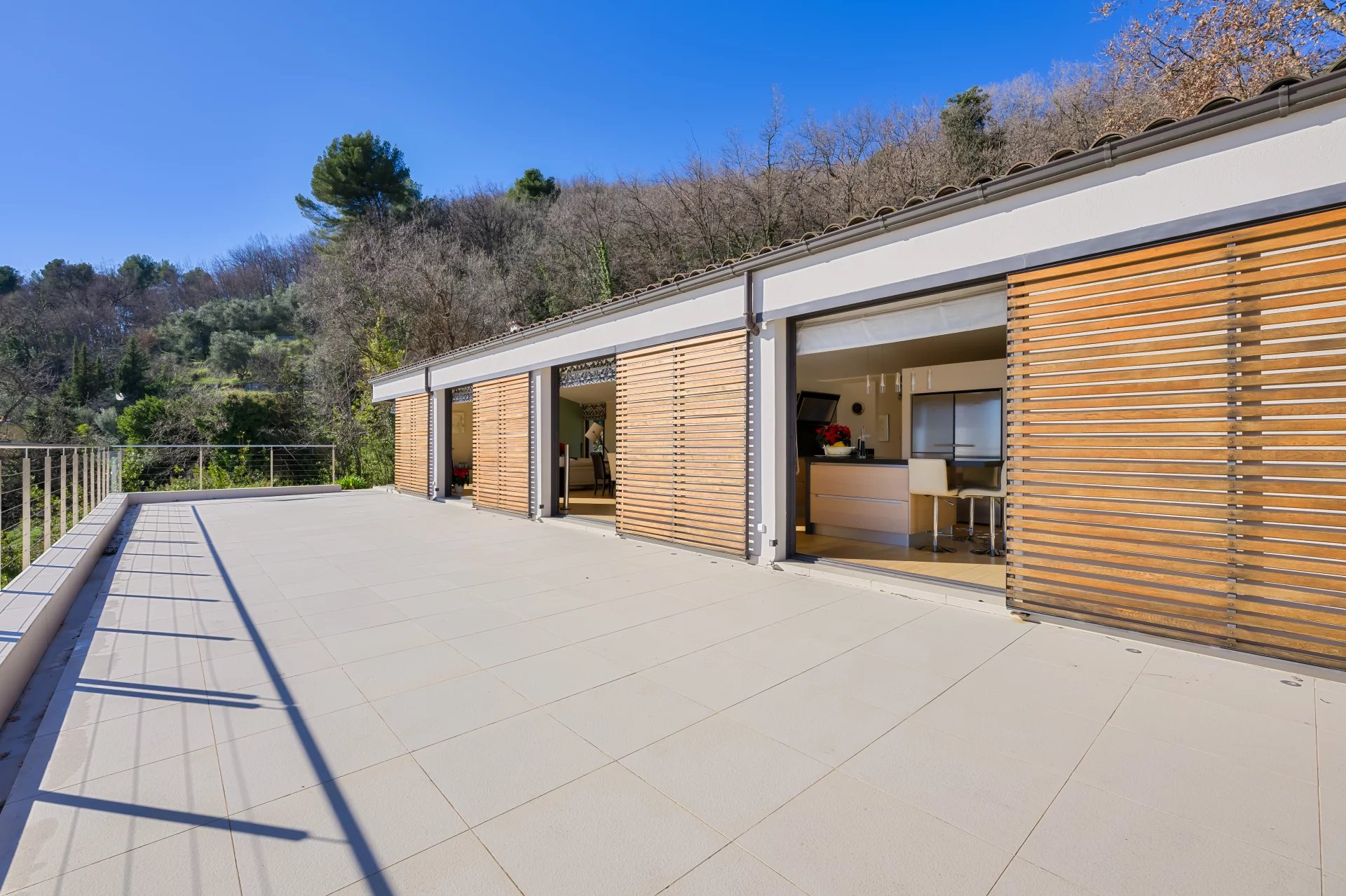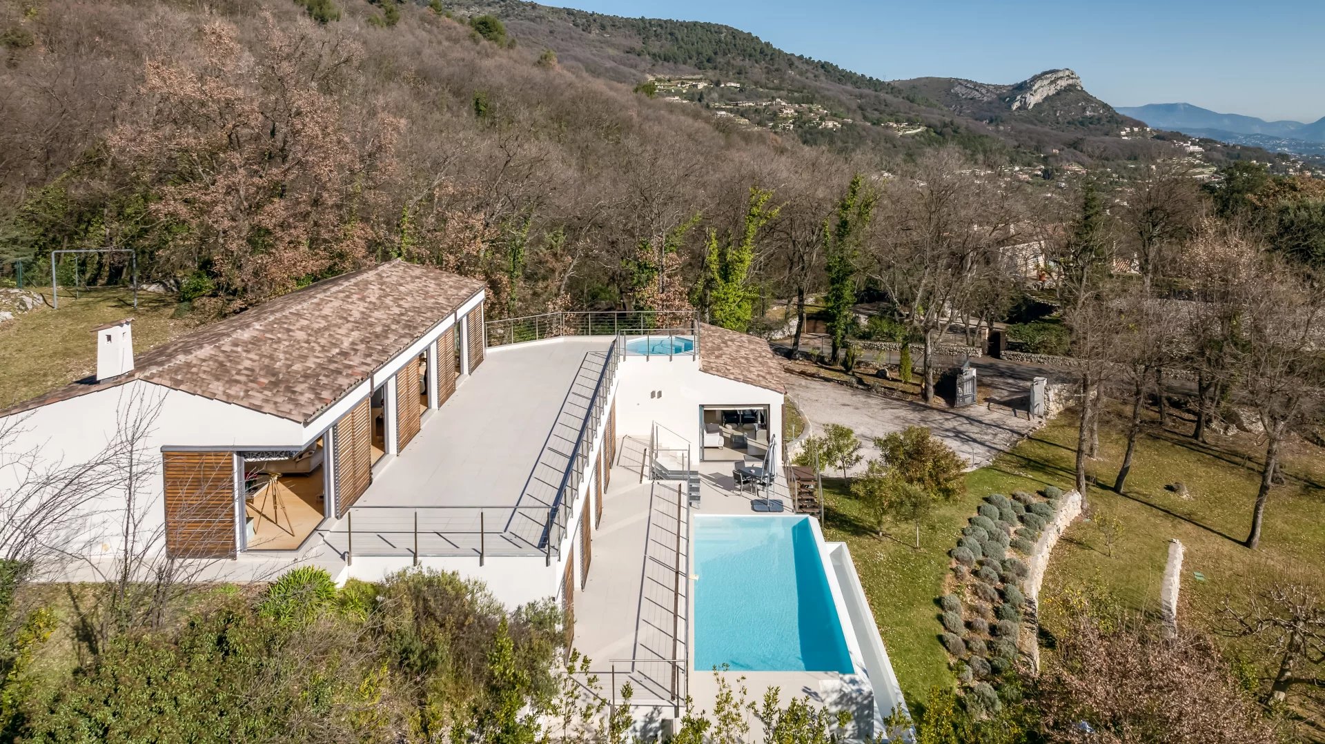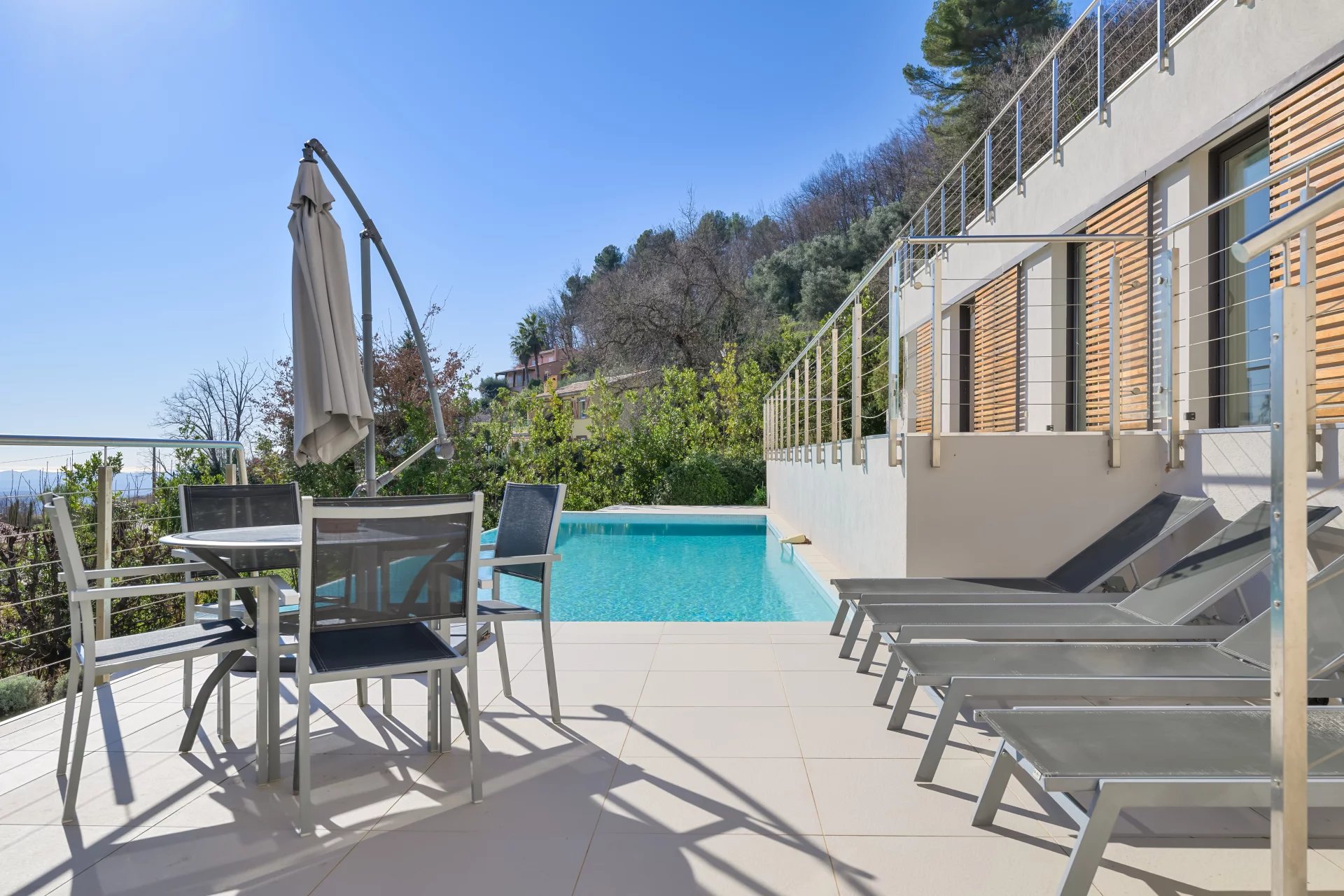 Located near the charming village of Tourrettes-sur-Loup, this stunning modern villa combines contemporary elegance with high-quality materials.