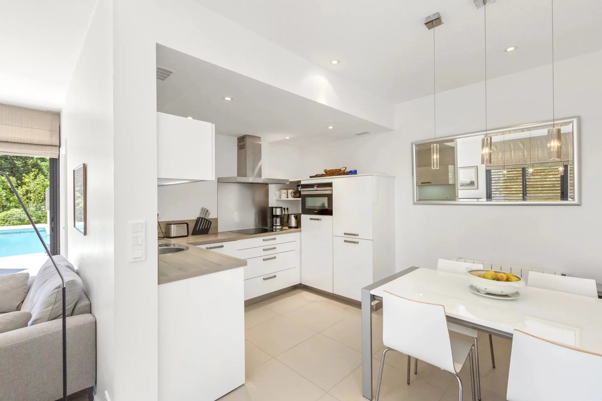 The independent guest apartment is ideal for visitors and includes two bedrooms, a living room, a dining area, a fully equipped kitchen, and a shower room with toilets. It also has direct access to a private terrace and the pool.
