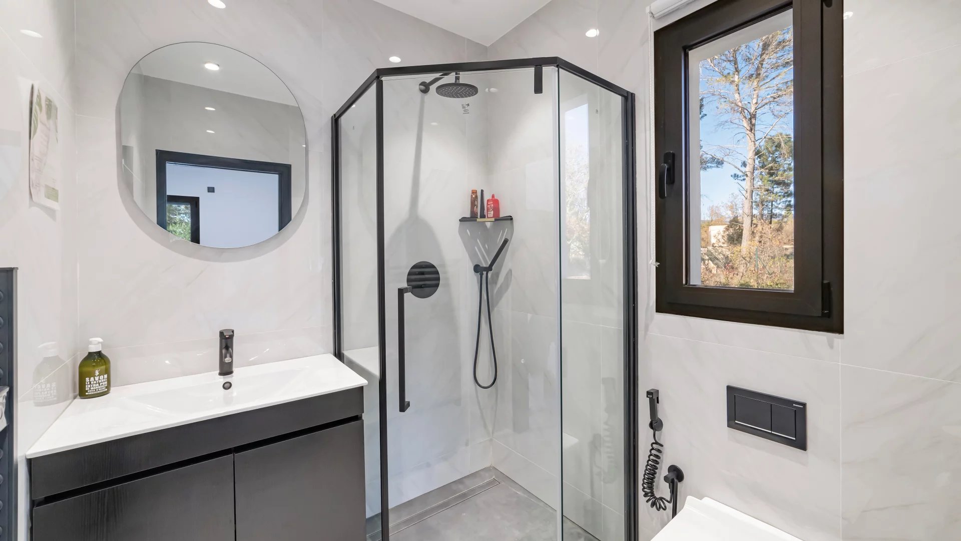 The second, the main part of the villa, offers a vast reception room comprising a living room, dining room and top-of-the-range fitted kitchen, all opening onto a covered terrace. A bedroom with shower room completes this level.