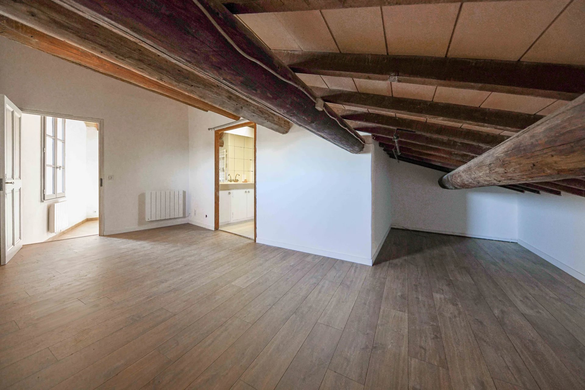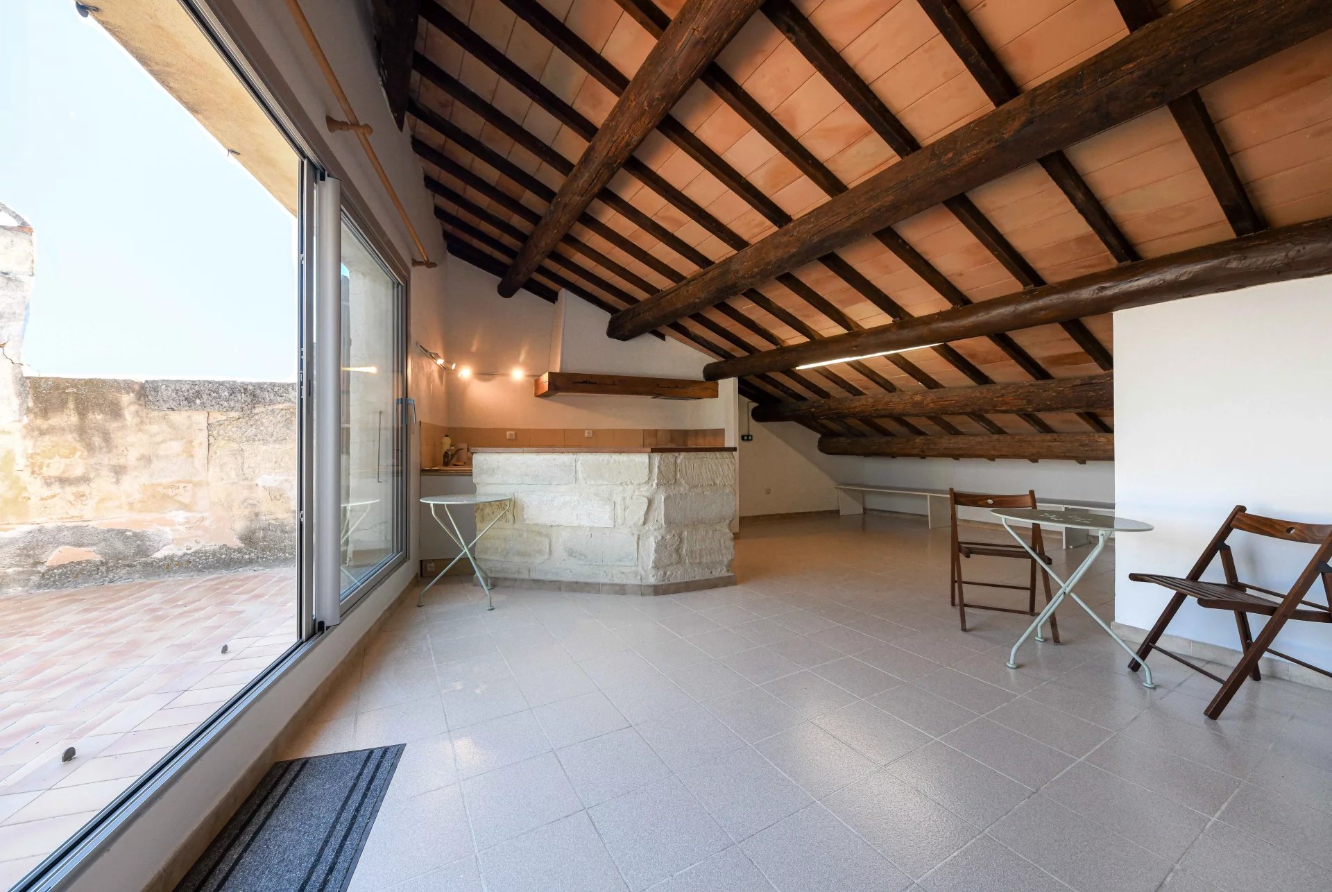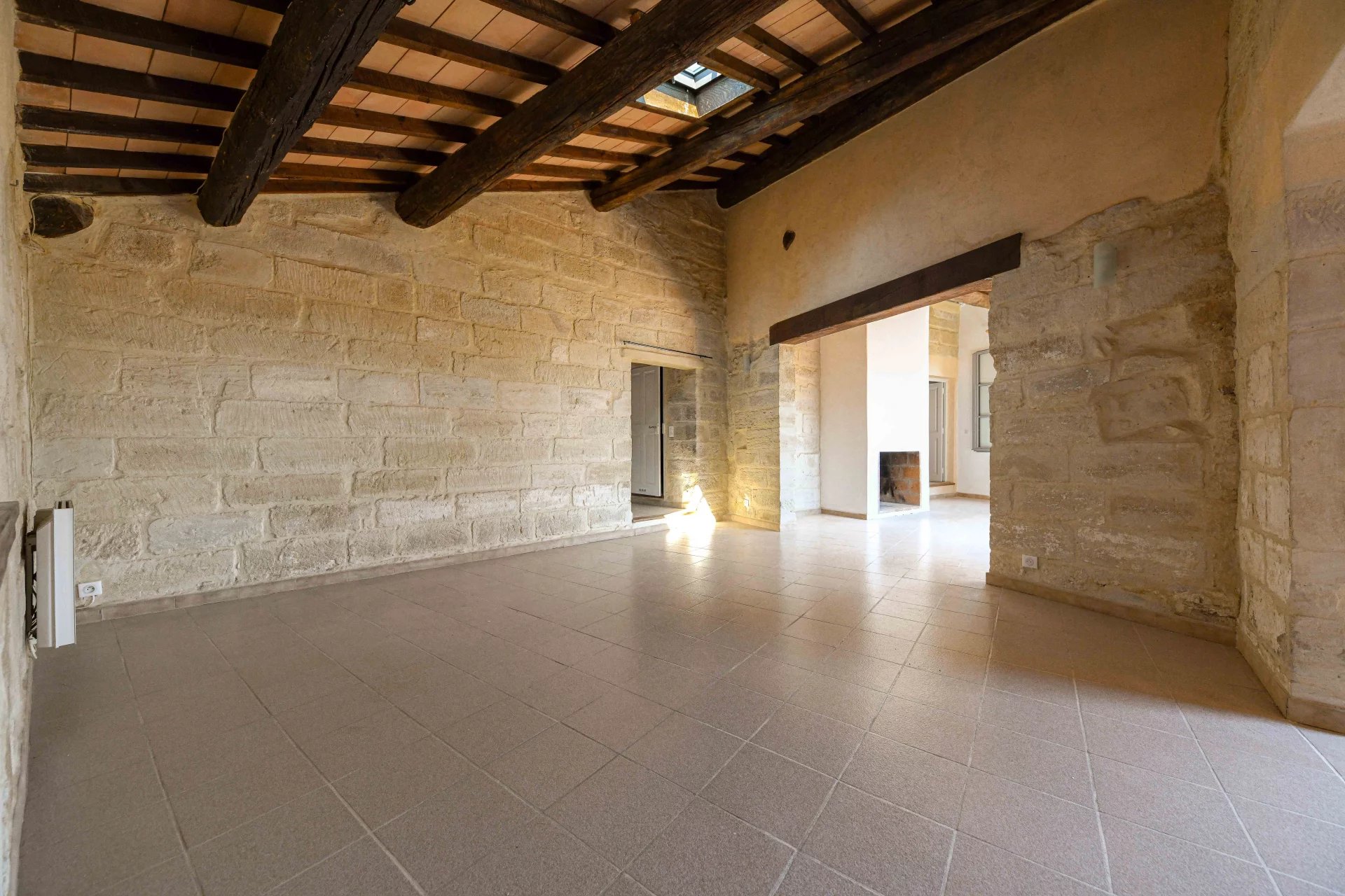 The 62 m2 living area opens onto a superb, intimate terrace overlooking the town and countryside, offering enchanting views of the various iconic and historic sites of Uzes. The large roof structure provides double height ceilings in most of the living areas and extends into the attic to provide storage space in the kitchen.