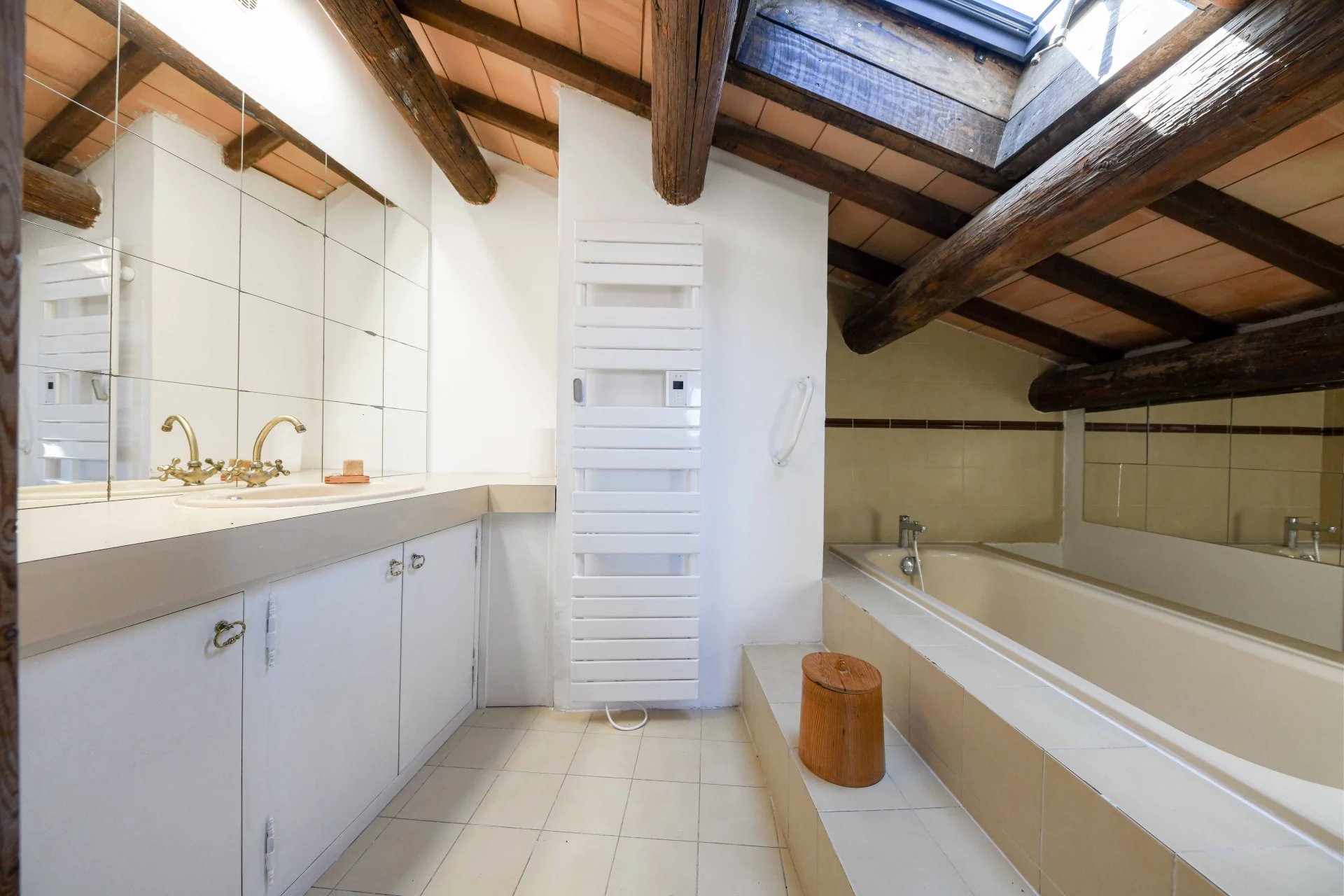 The first suite offers a bedroom and a bathroom, totalling 28 m2 of floor space, partly mansard, which is particularly useful for creating dressing areas. The second sleeping area offers a bedroom, an office and a bathroom.