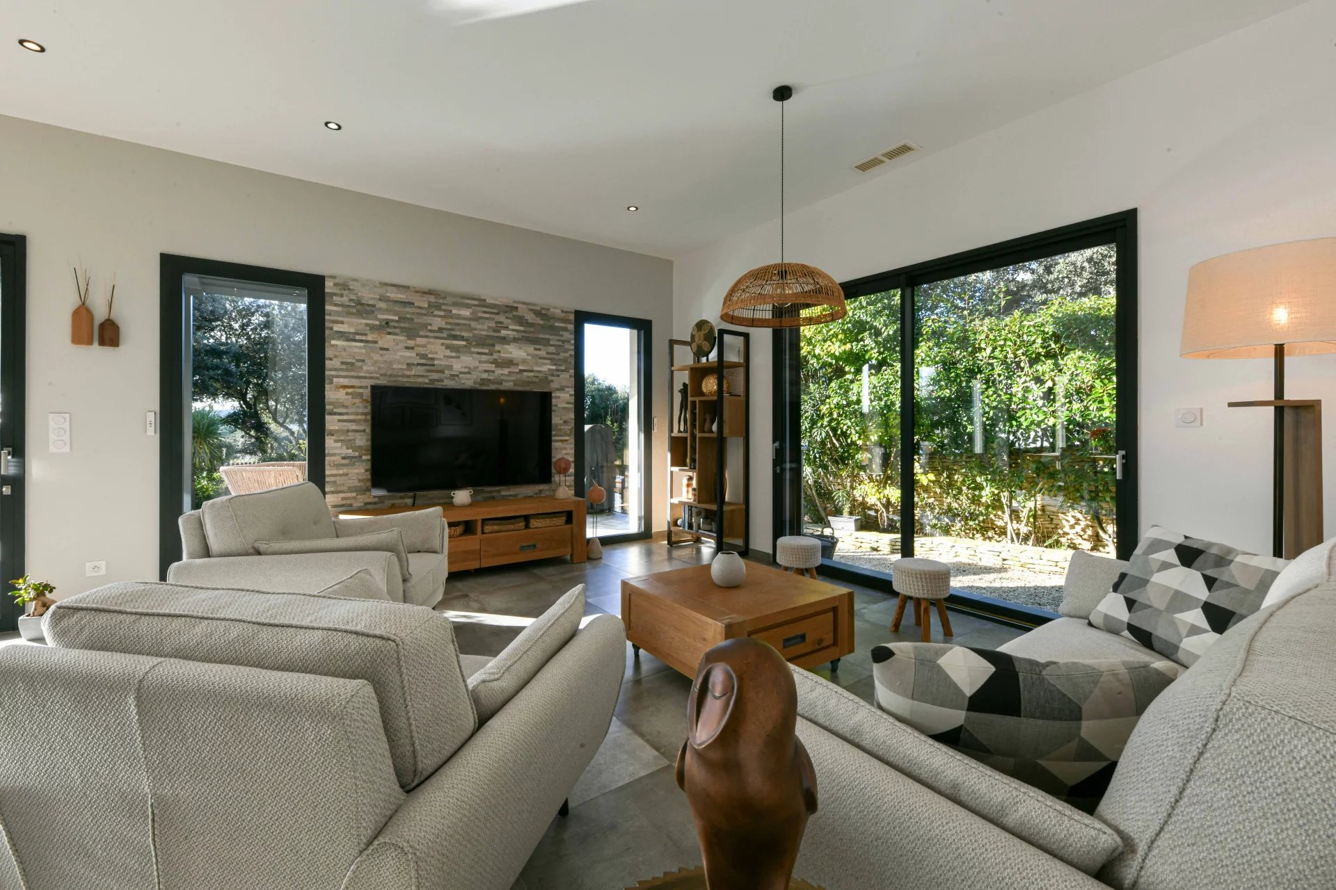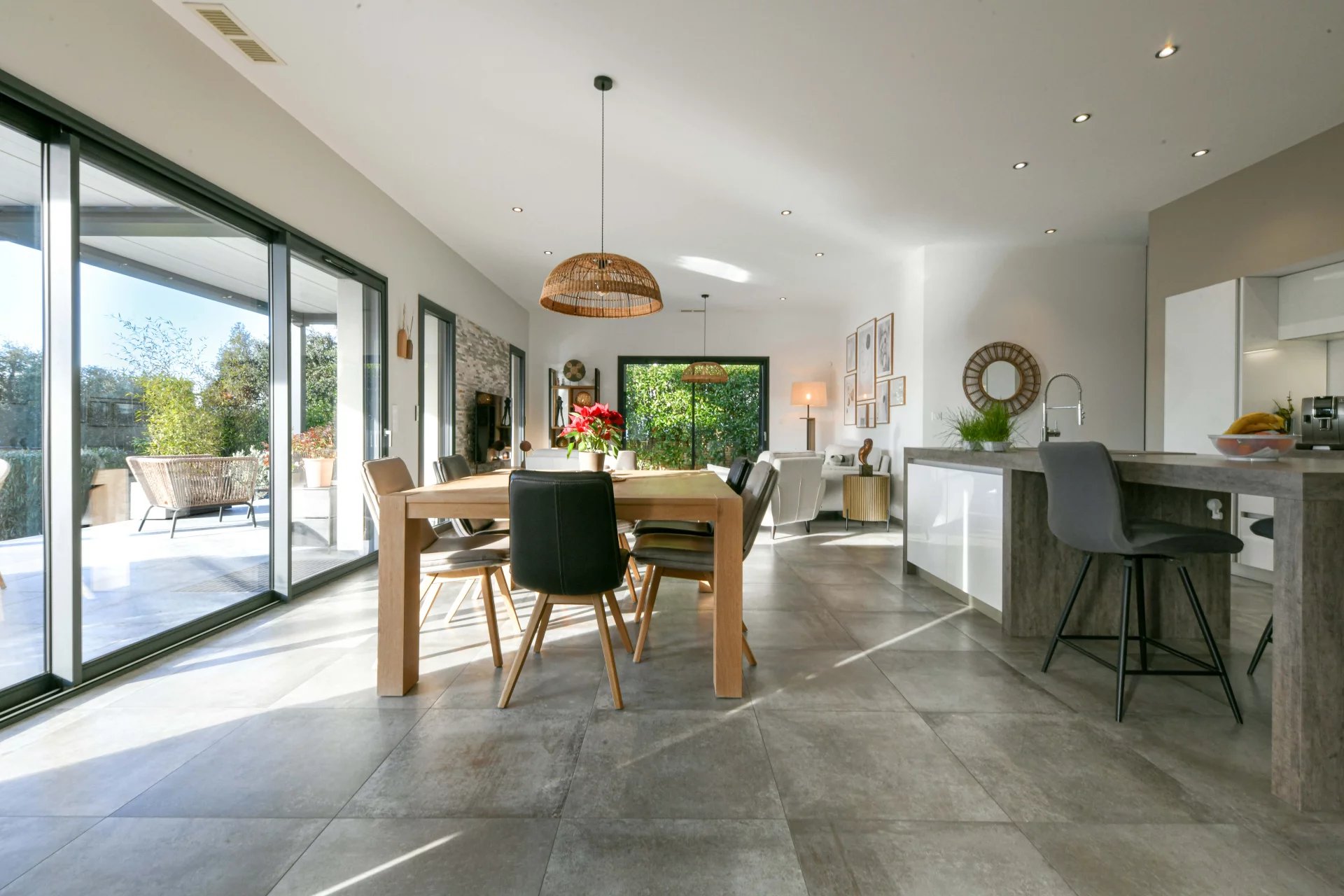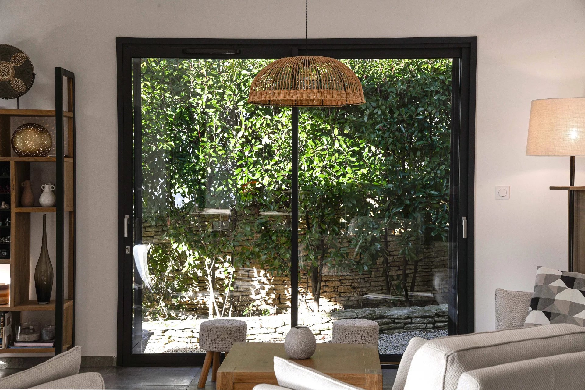 From the entrance hall, you enter a spacious living room that opens onto the garden. The large sliding glass doors provide a harmonious and natural transition between indoors and outdoors.