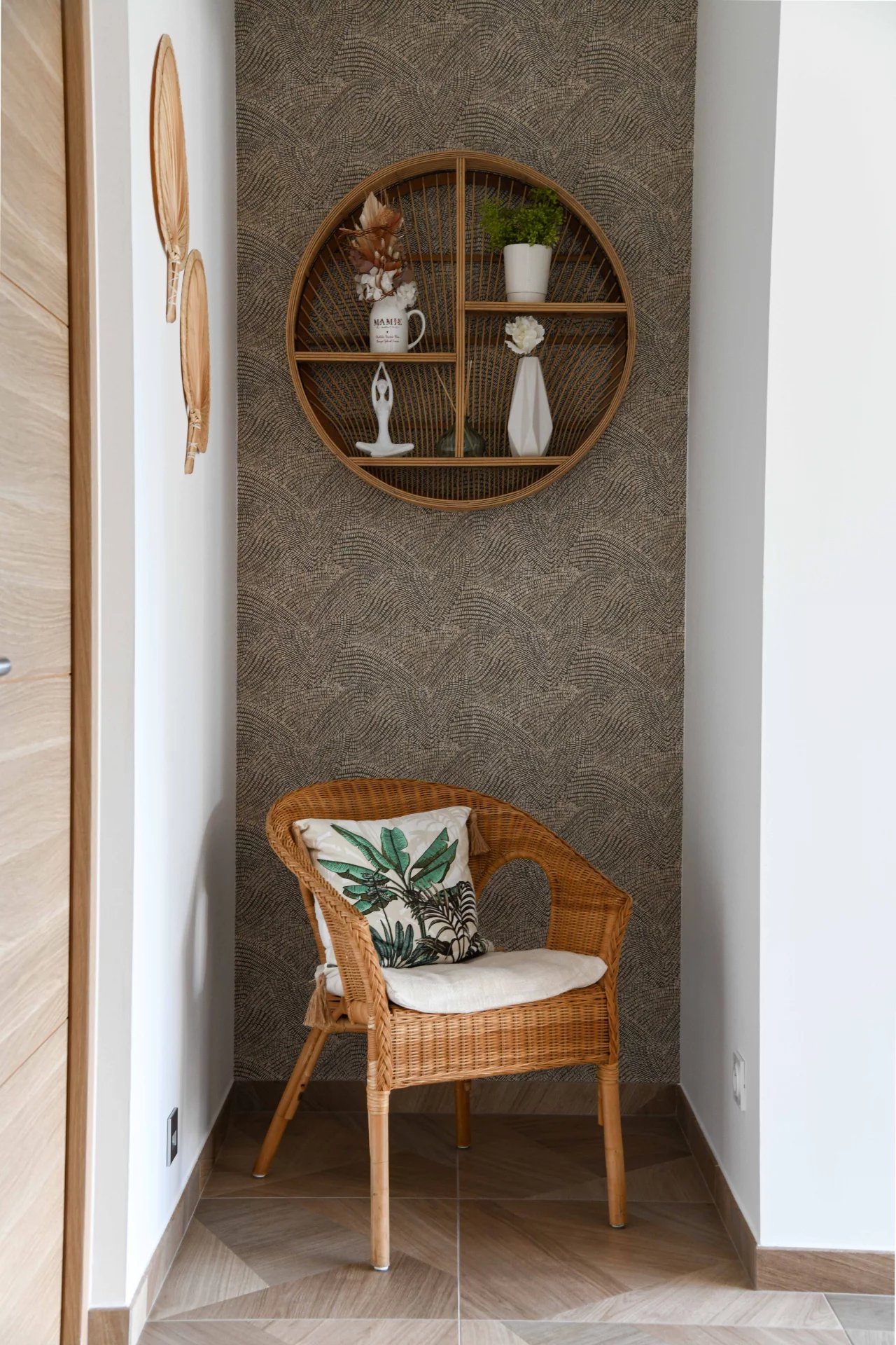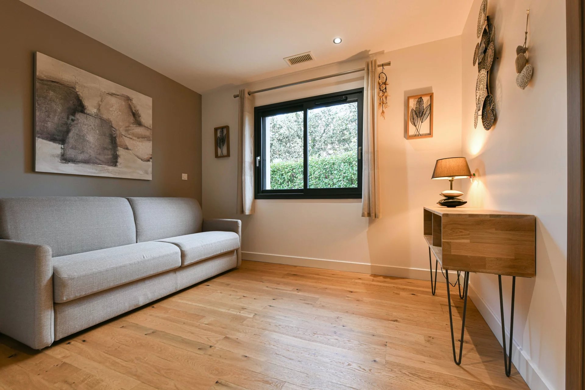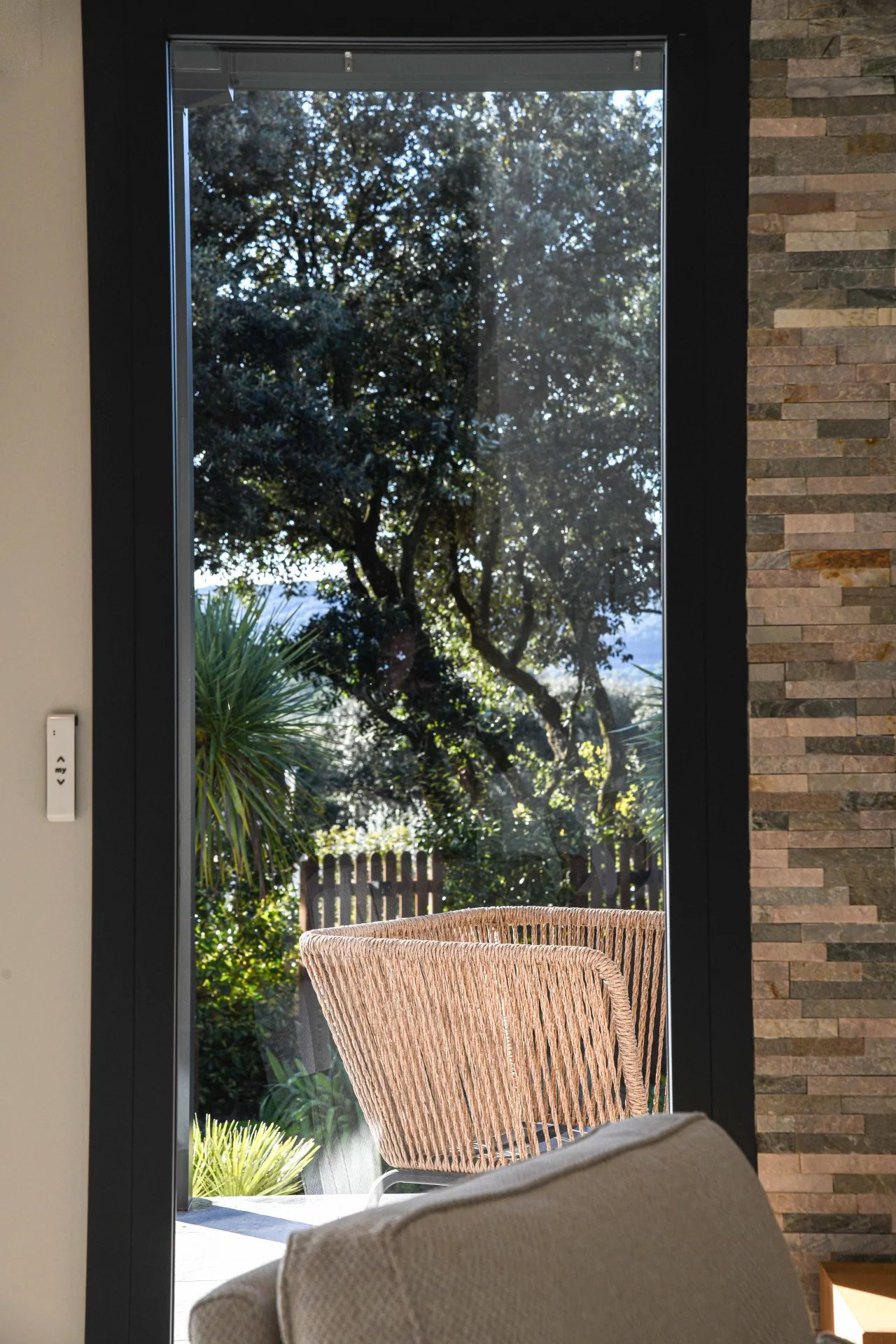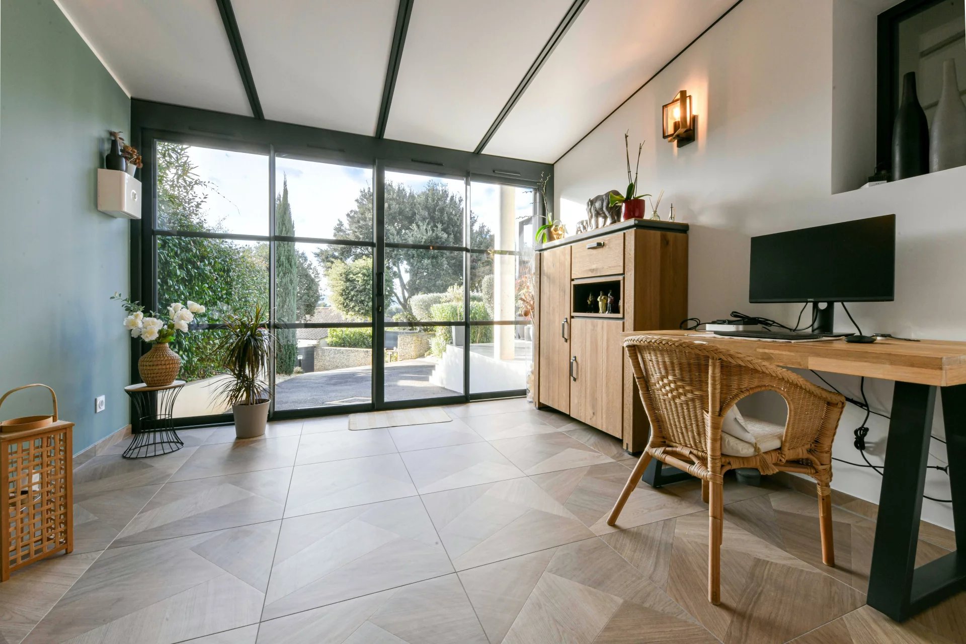 From the entrance hall, you enter a spacious living room that opens onto the garden. The large sliding glass doors provide a harmonious and natural transition between indoors and outdoors.