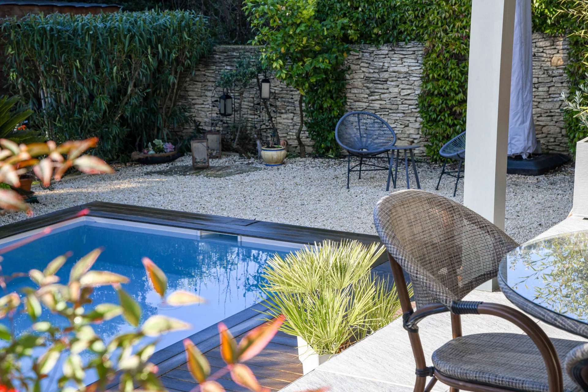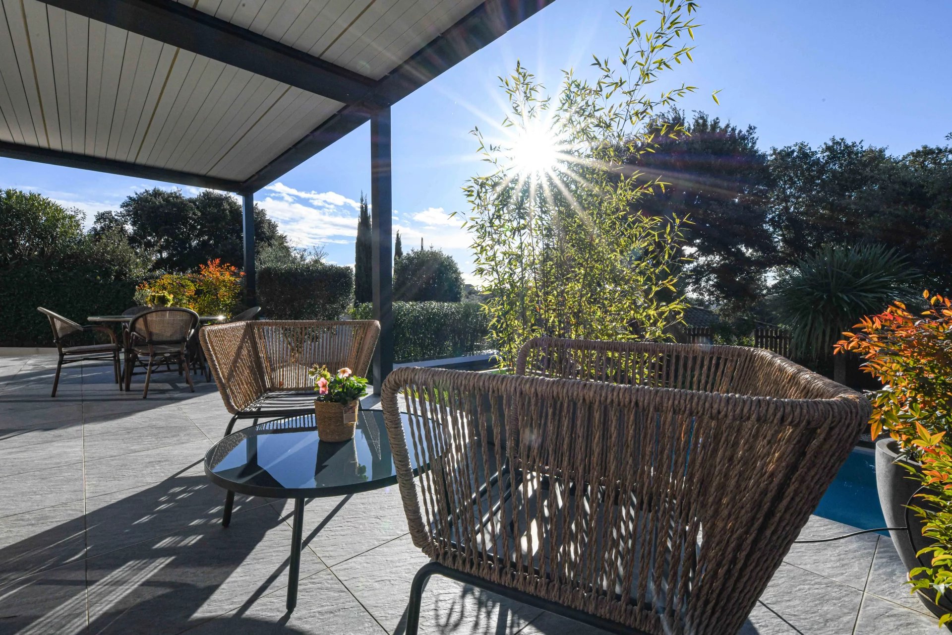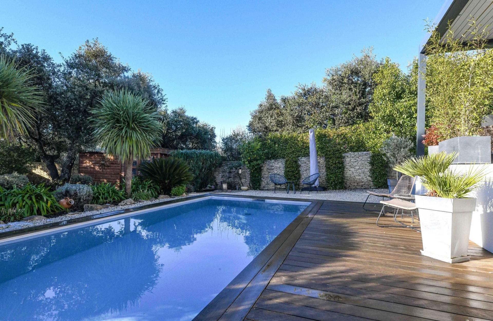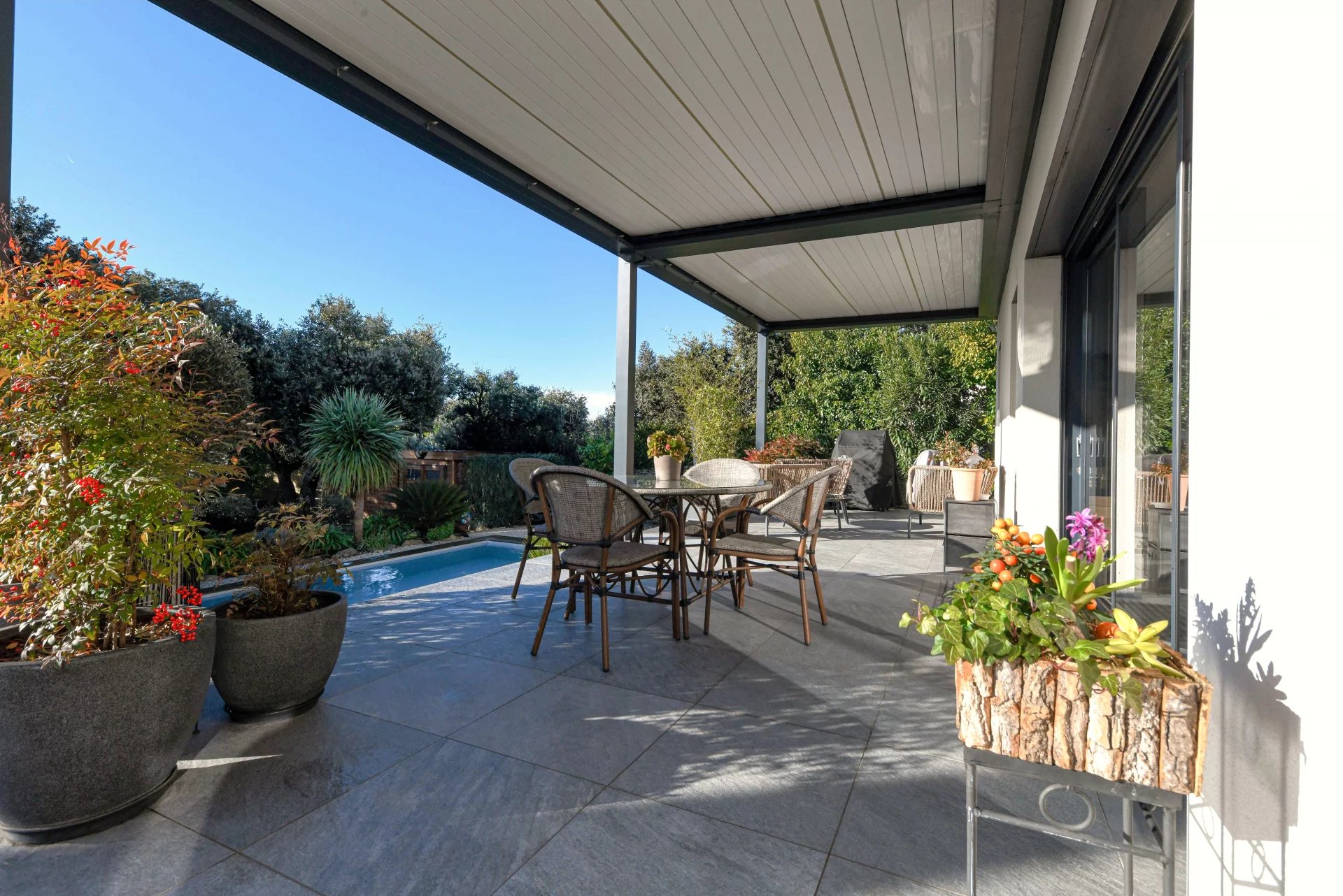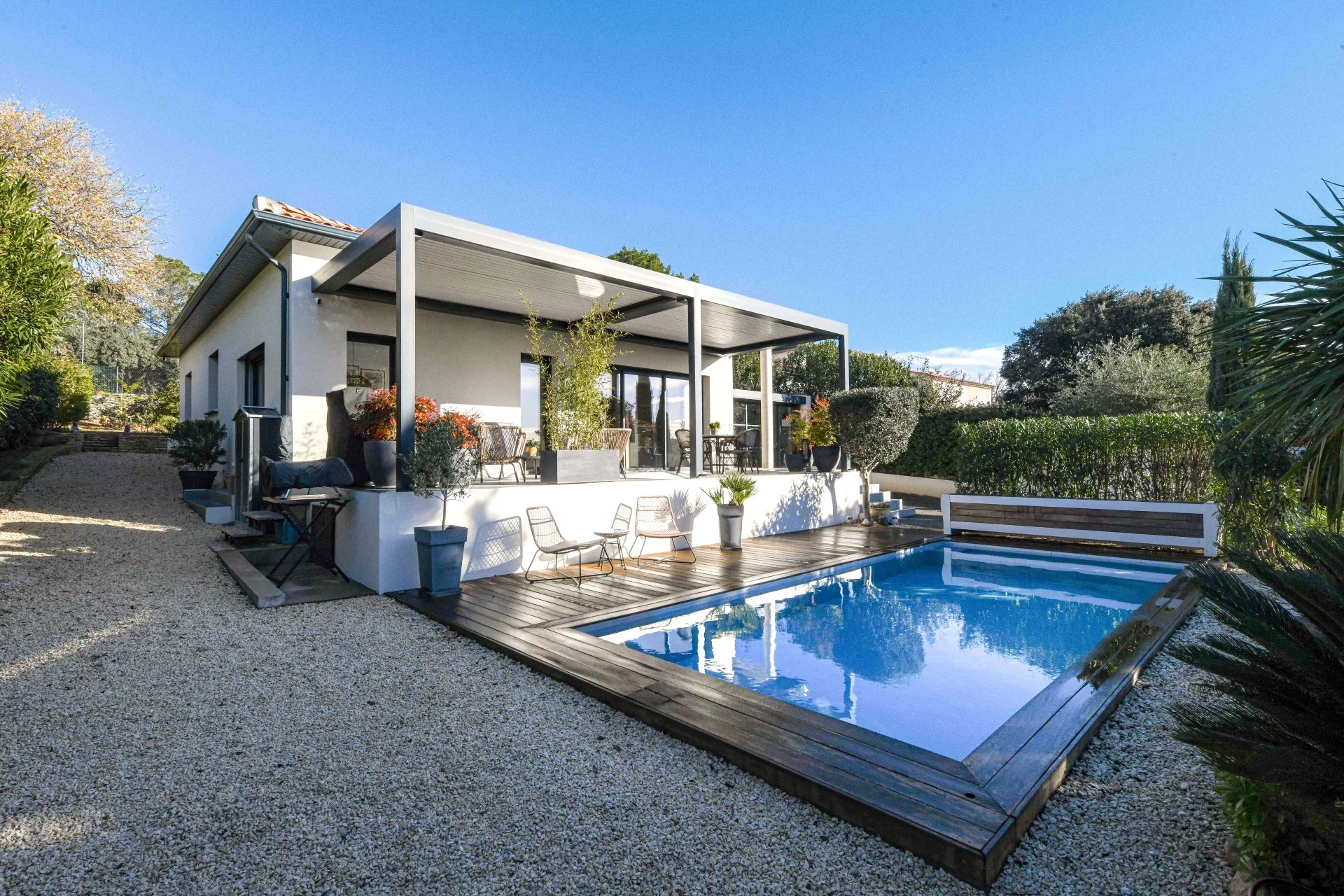 The exterior has been designed as a true extension of the house. The terrace, protected by a bioclimatic pergola, features a summer living/dining area overlooking the saltwater pool (7m x 3m), equipped with an electric cover. A charming exotic wood deck creates a warm and modern atmosphere.