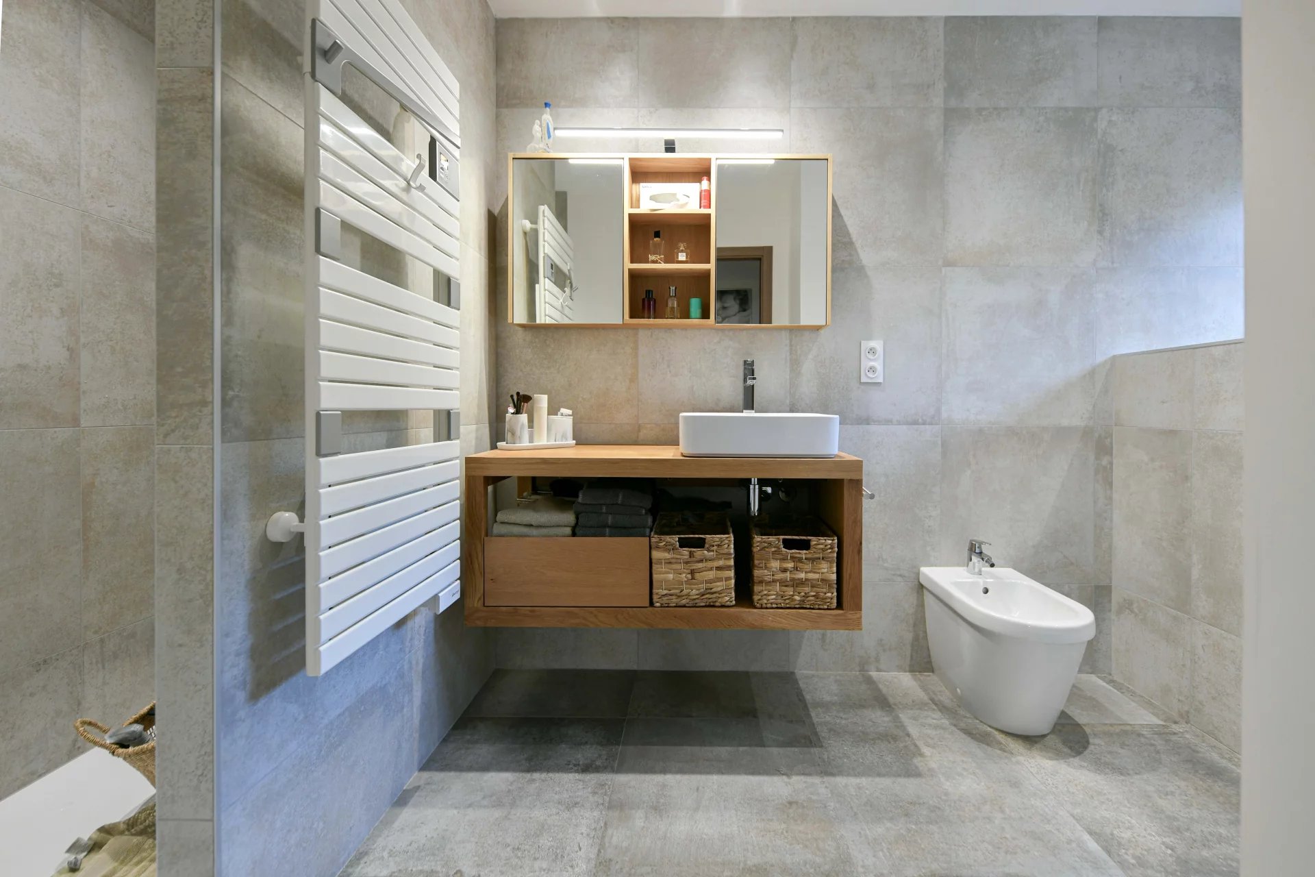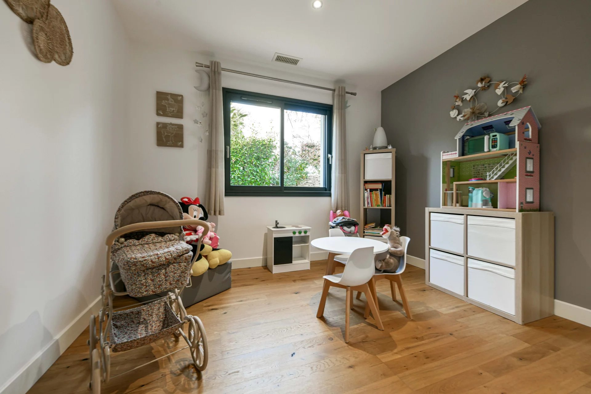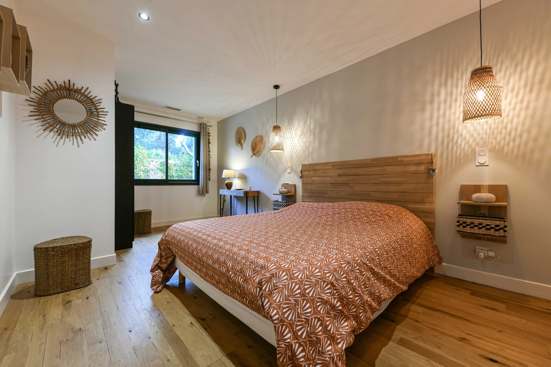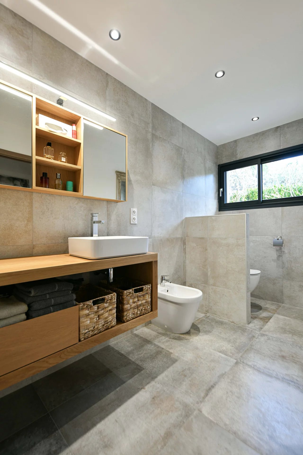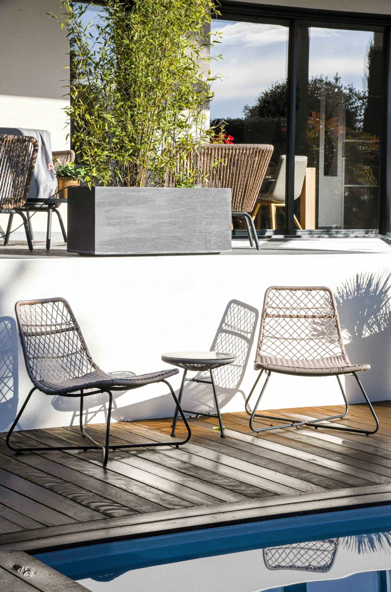 The exterior has been designed as a true extension of the house. The terrace, protected by a bioclimatic pergola, features a summer living/dining area overlooking the saltwater pool (7m x 3m), equipped with an electric cover. A charming exotic wood deck creates a warm and modern atmosphere.