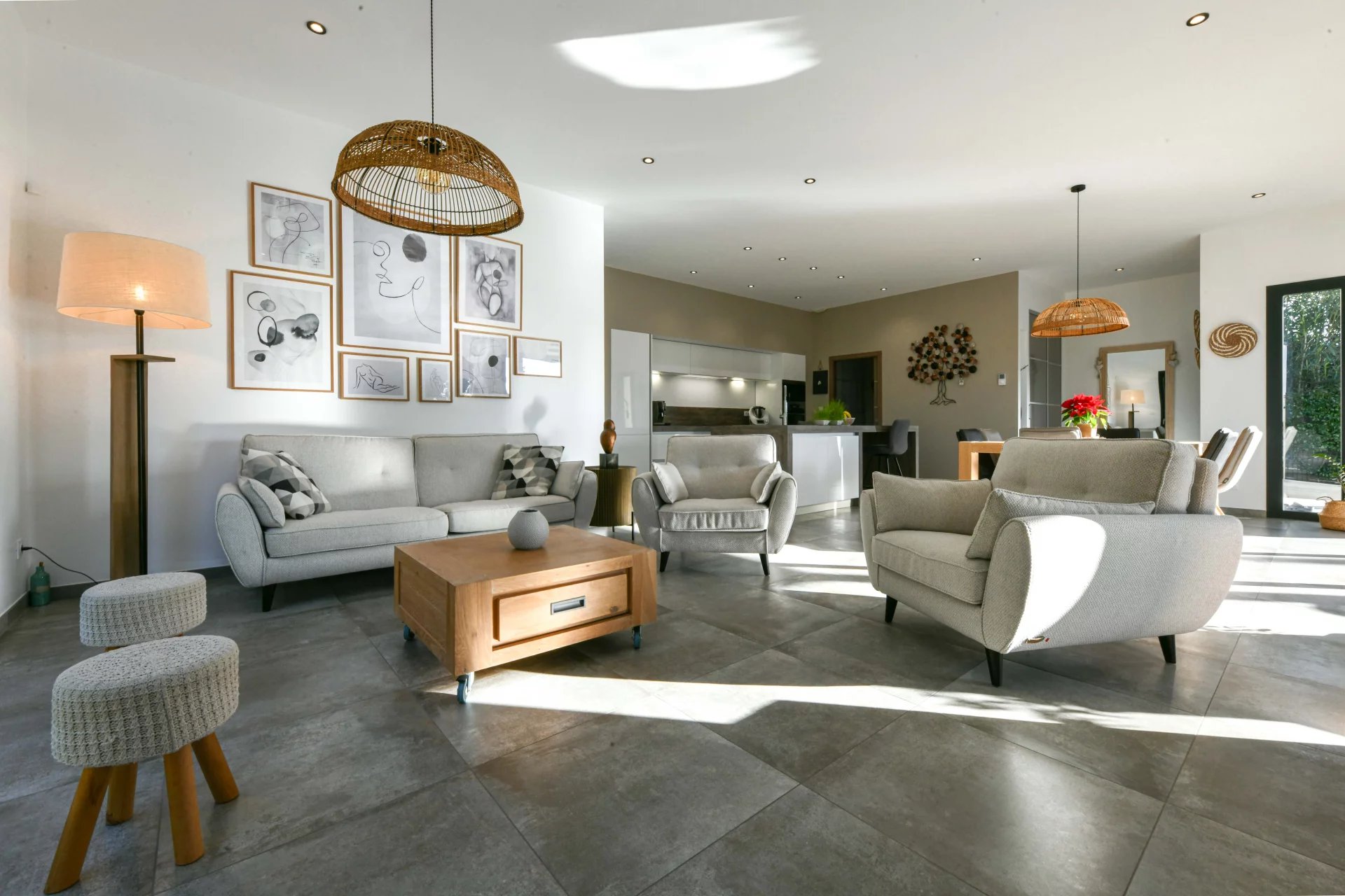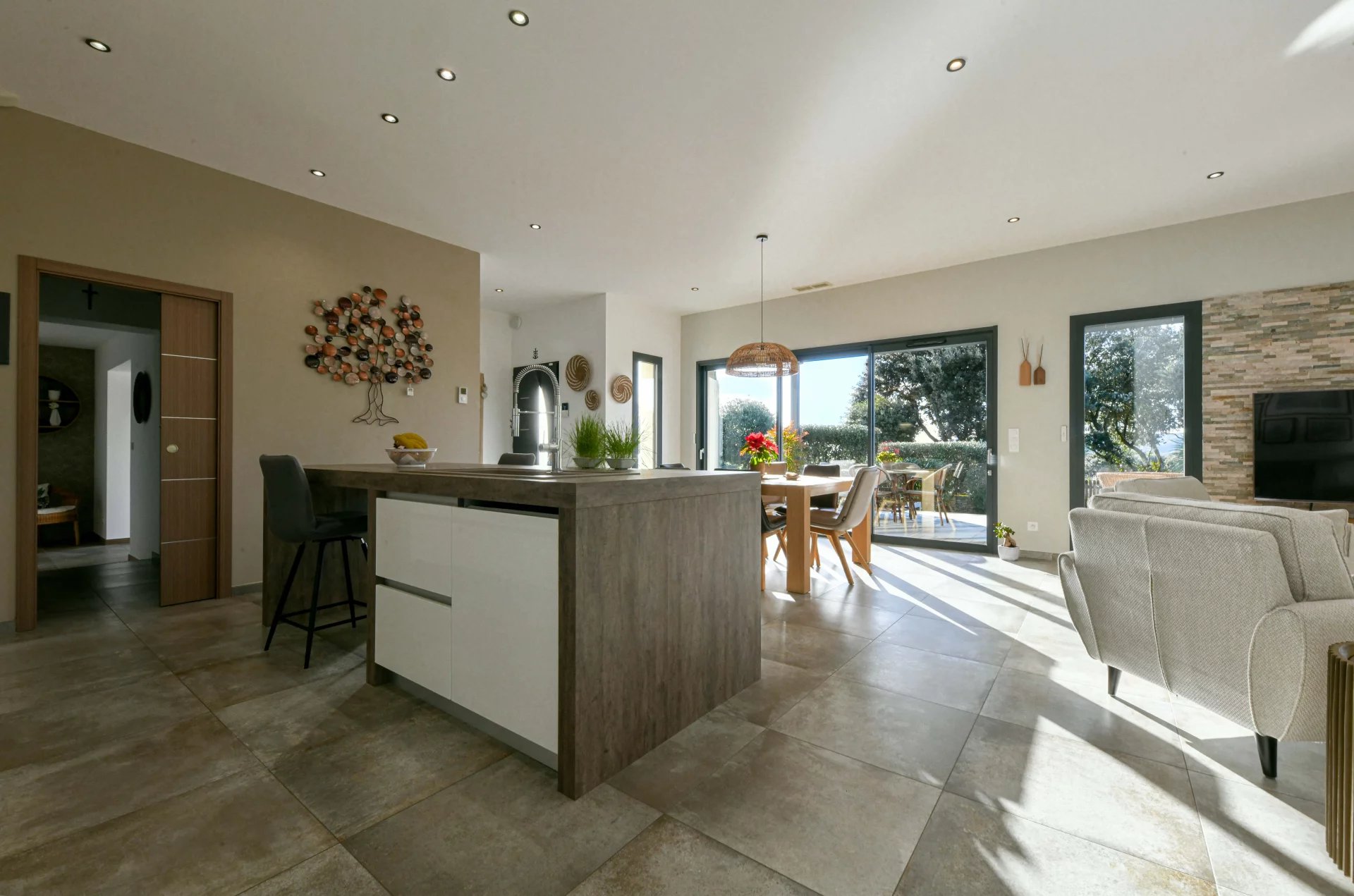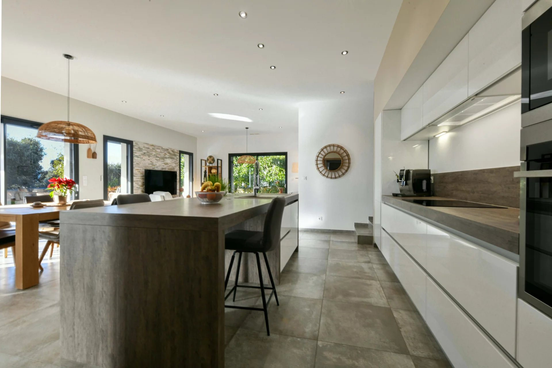 The open-plan kitchen, perfectly equipped with a central island, adds a modern and elegant touch.
