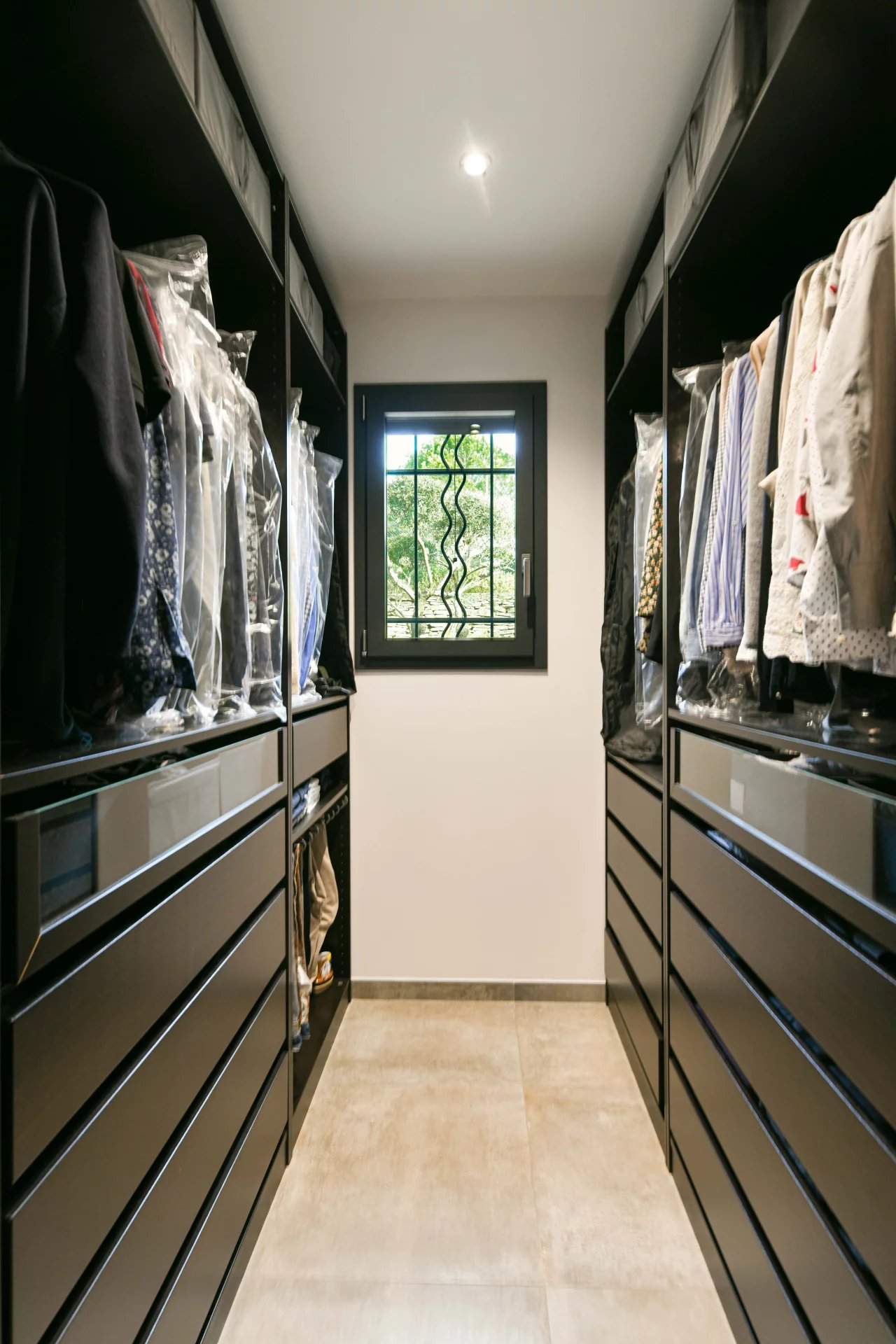 A few steps lead to the ideally arranged sleeping area. On one side, there are two bedrooms with fitted wardrobes and a bathroom, and on the other, a master bedroom, a dressing room, and a spacious bathroom.