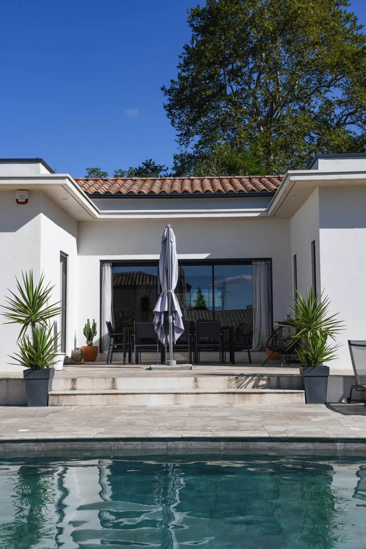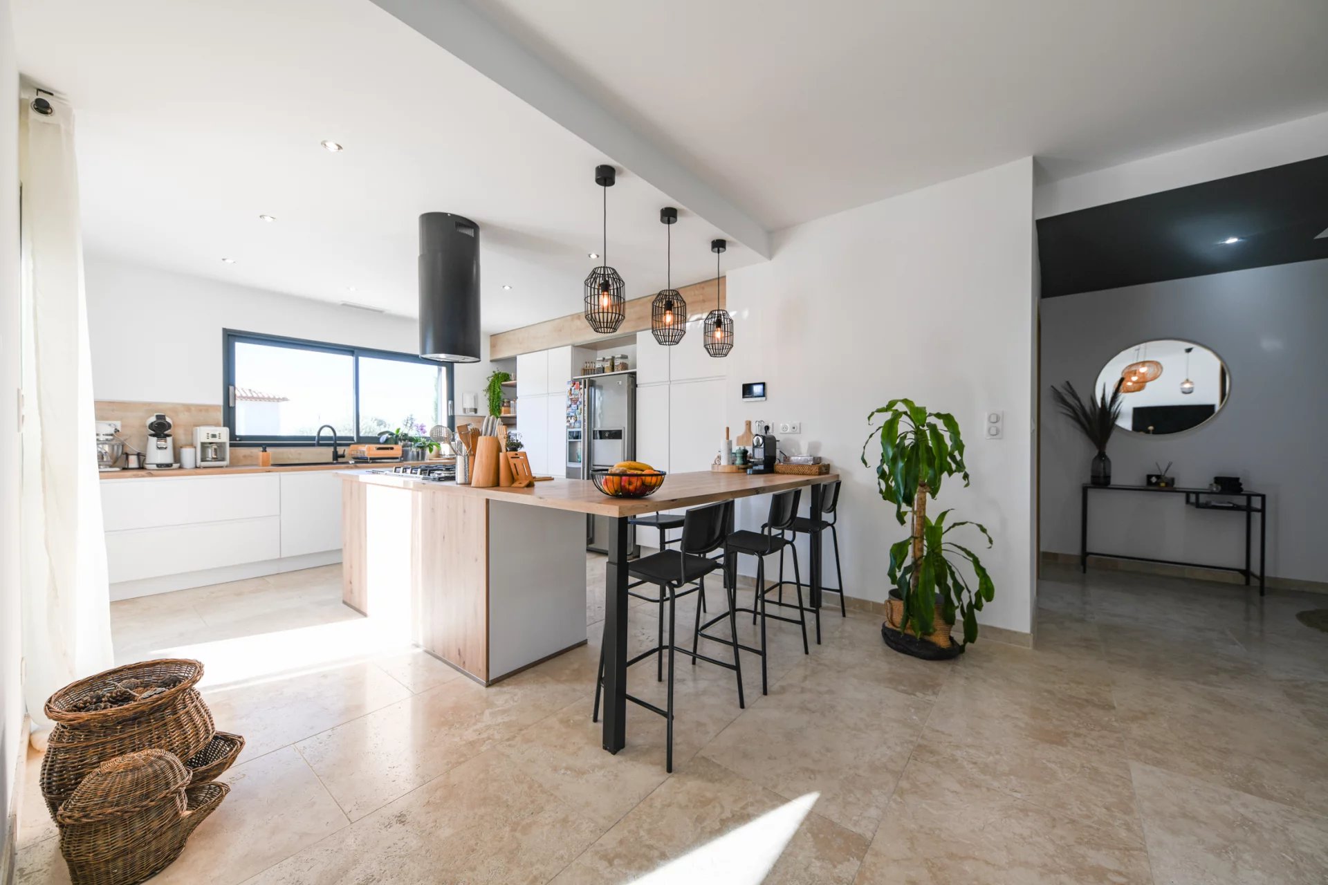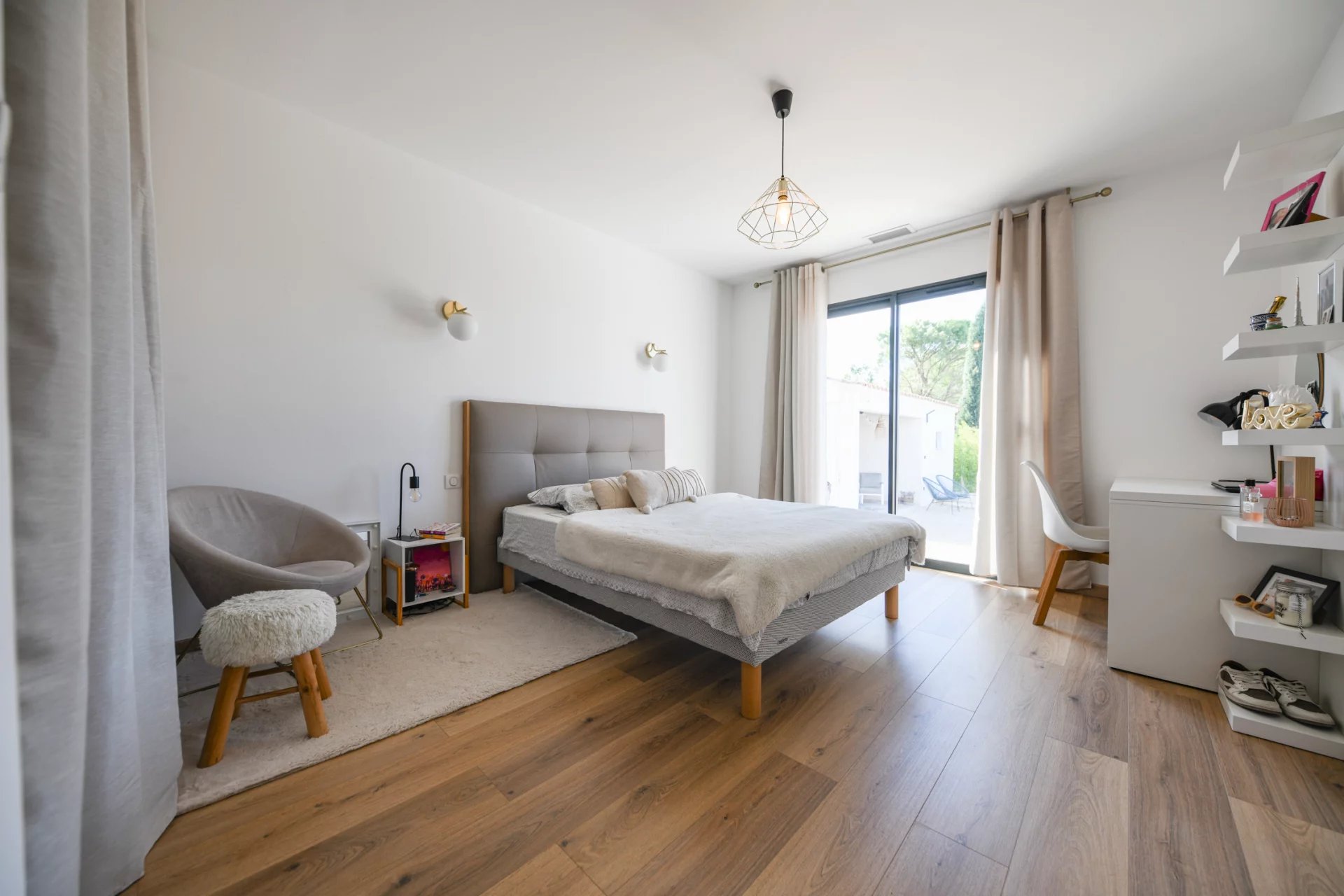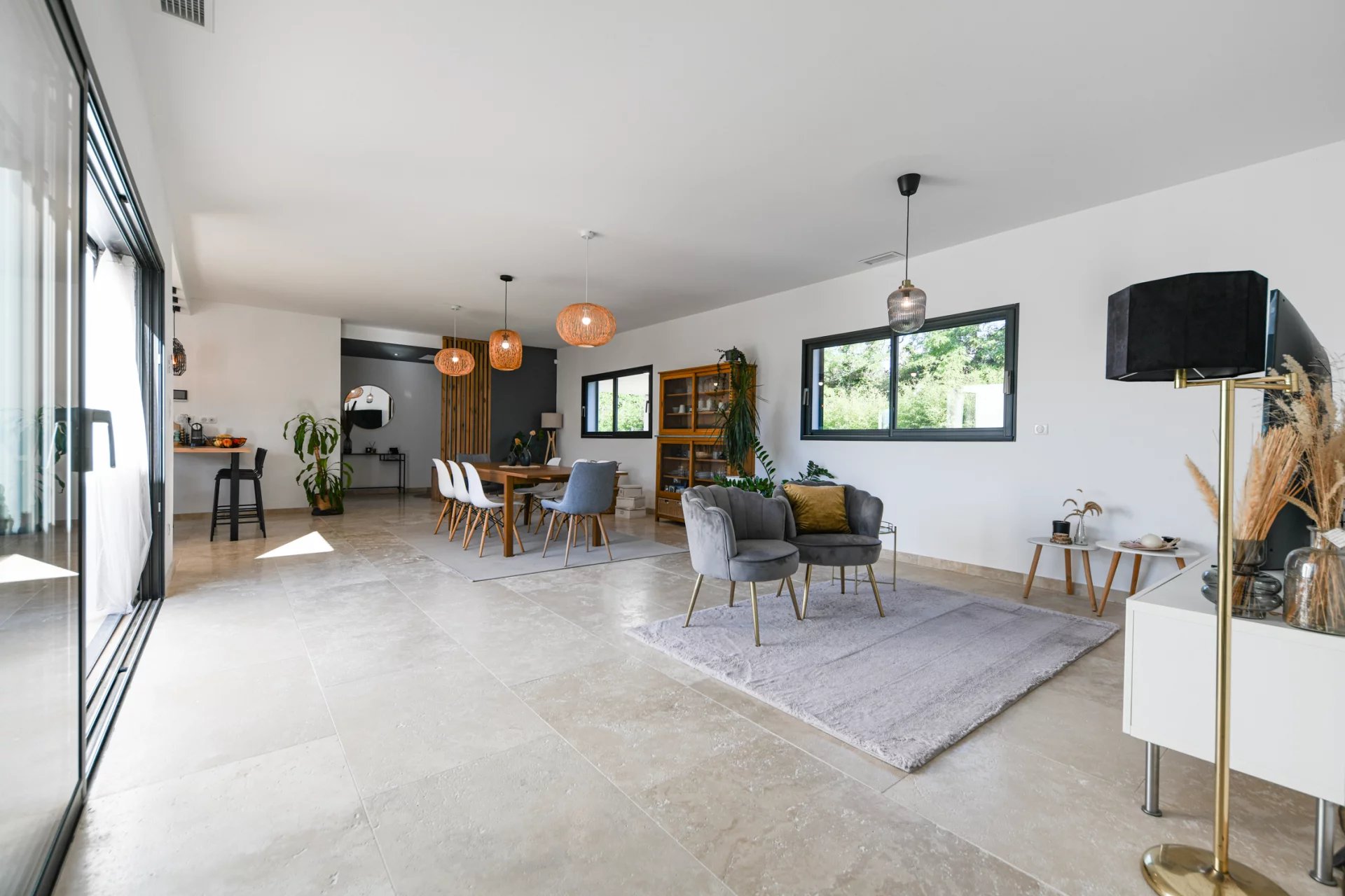 Built in 2021, this property consists of an entrance serving a double living room of 70 m2 traversing and bright overlooking the terrace and pool, a kitchen, three spacious bedrooms, one en suite, separate toilet and additional bathroom, Cellar, laundry room and spacious “garage” of 32 m2 (heated and insulated) offering the possibility of creating a fourth bedroom or workplace.
