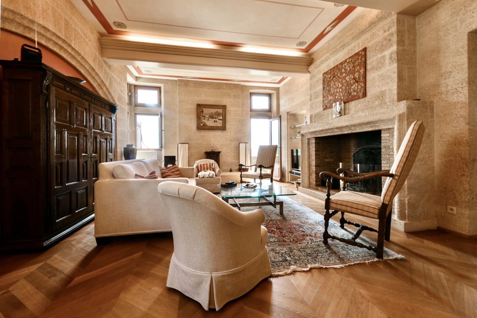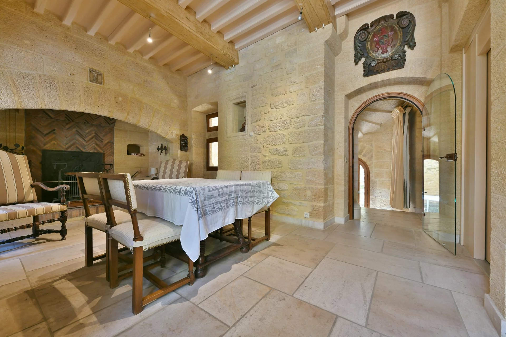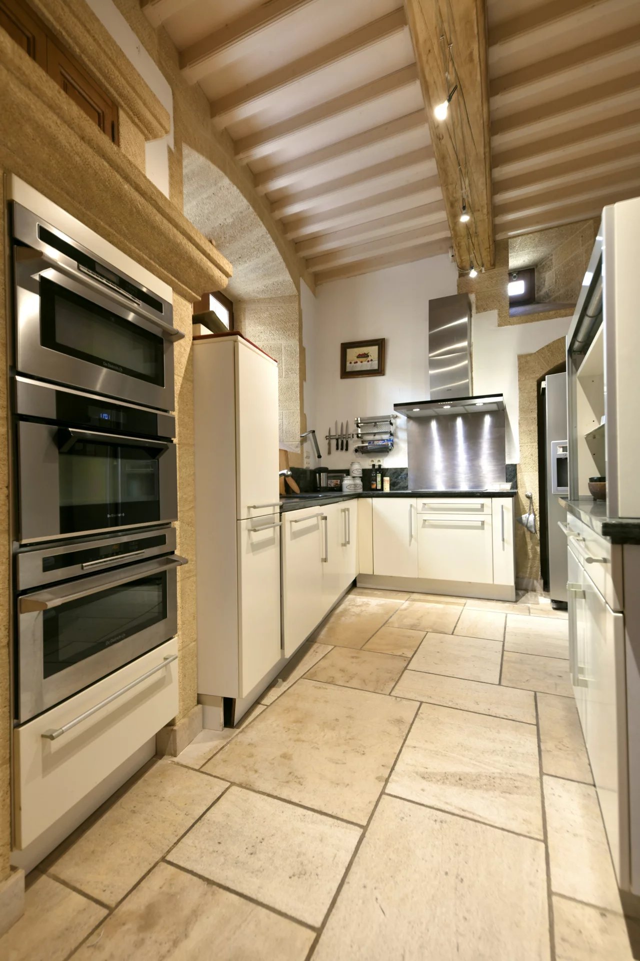 From the entrance, the first living area offers generous volumes and opens onto a landscaped courtyard. A 37 m² kitchen/dining room with a monumental fireplace and access to the lift. Also on this level, a hallway gives access to a guest toilet and a 10 m2 storeroom/laundry room.