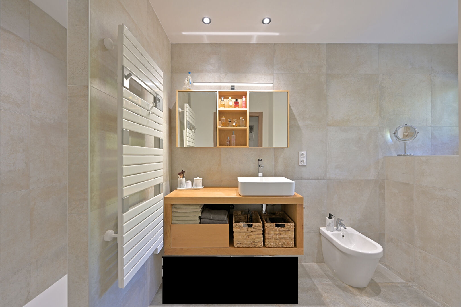 A bioclimatic pergola extends the terrace and creates an outdoor living space ideal for all seasons, a true open-air living room where light and softness meet. The sleeping area, like the rest of the house, exudes calm and tranquility: a master suite with dressing room and shower room opens onto the back garden, while two bedrooms with fitted wardrobes share a second, refined shower room.