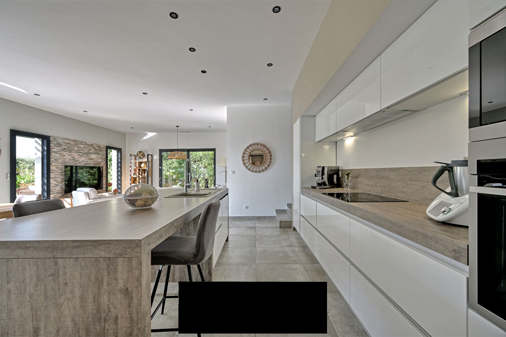 From the entrance, the light imposes itself, gliding over the volumes and revealing the generosity of the living room. At the heart of this space, the open kitchen, simple and refined, exudes conviviality: a place of sharing, directly connected to the living room. Through the large bay windows, the gaze escapes to the landscaped garden, its sparkling swimming pool and its Mediterranean species.