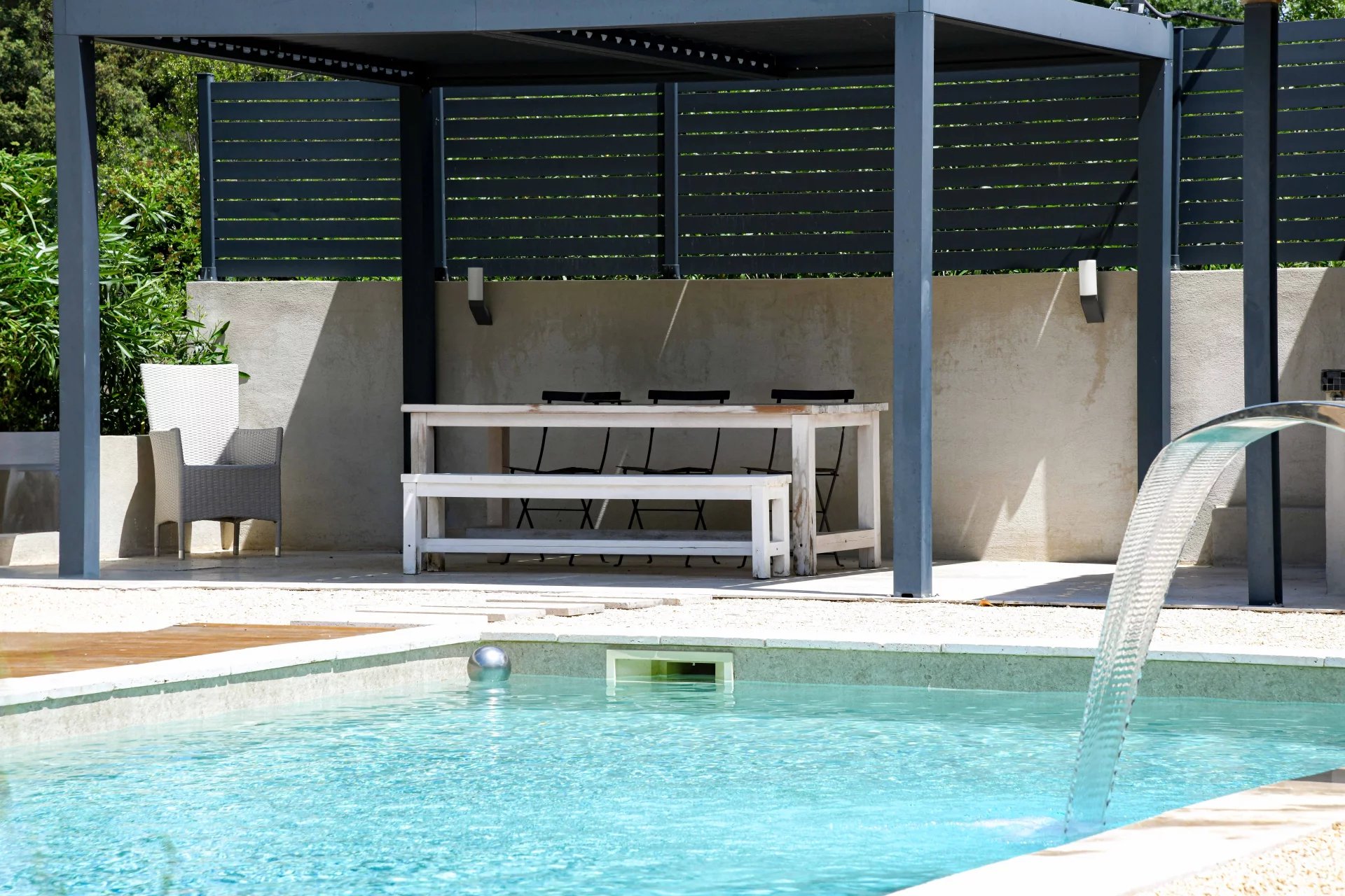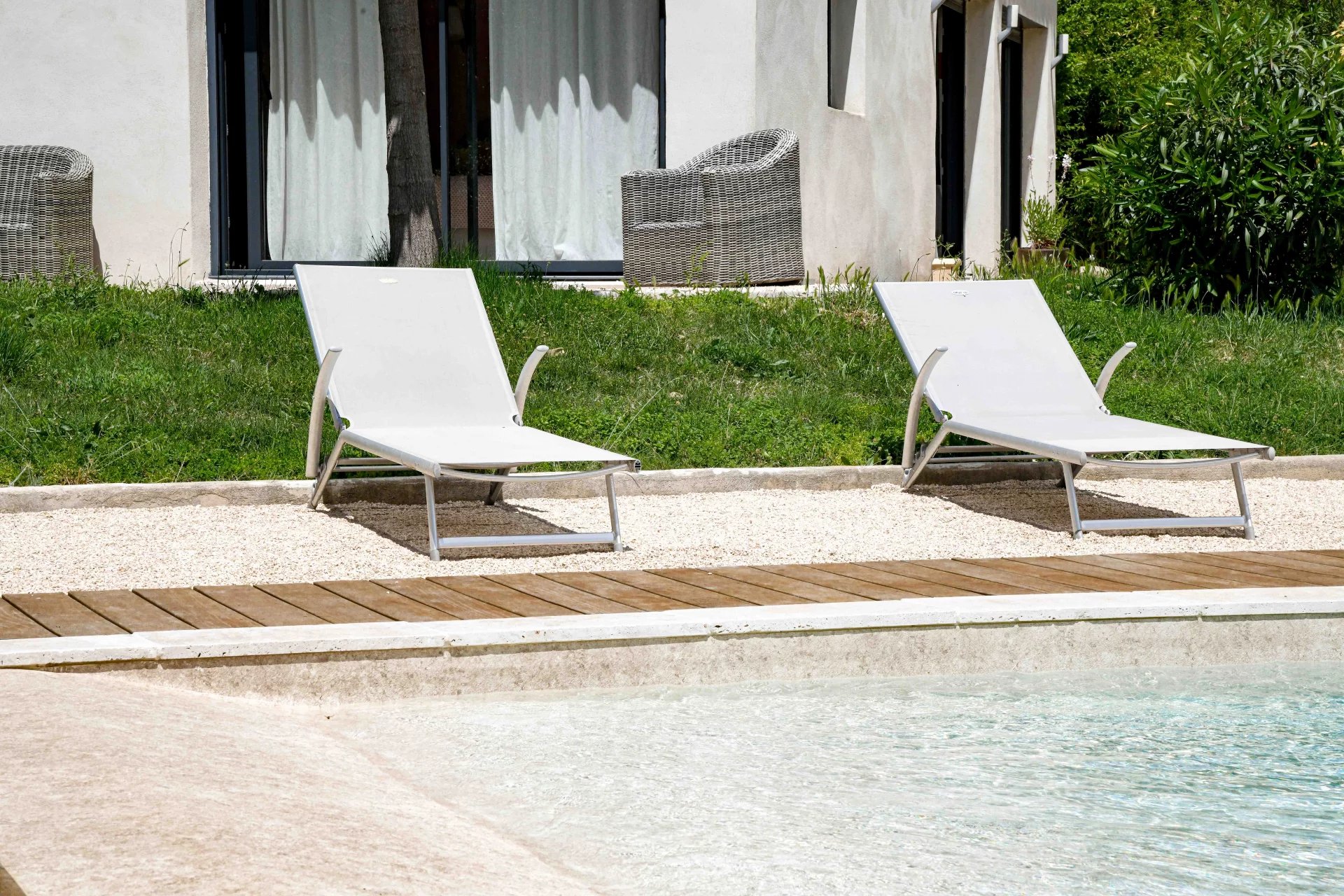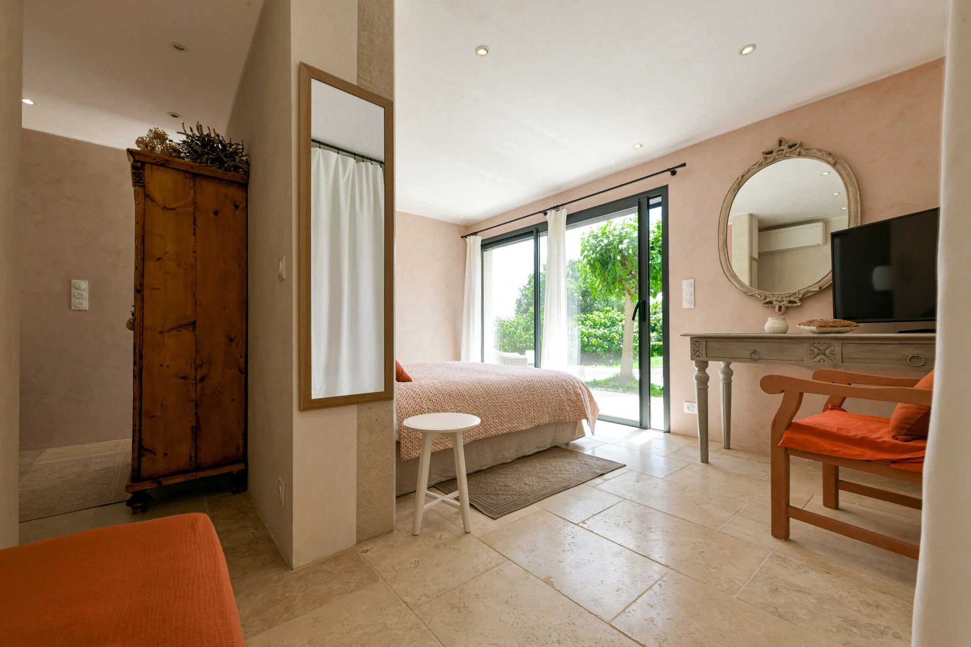 Entirely on one level, the sleeping area comprises three comfortable suites of 22, 22 and 30 m2, each with a good-sized bedroom, bathroom, dressing room and separate toilet. Each bedroom opens onto a terrace, the garden and the swimming pool.