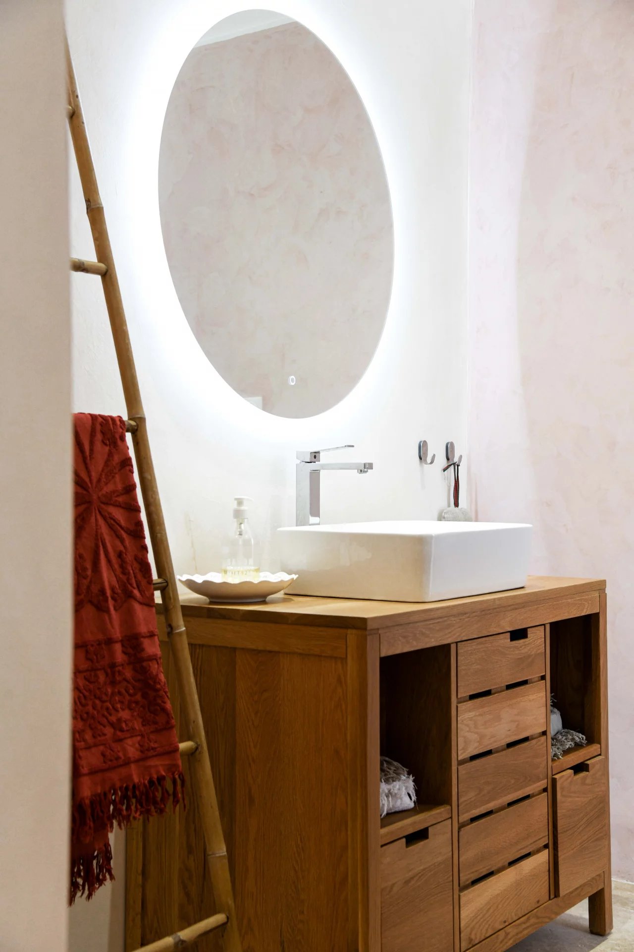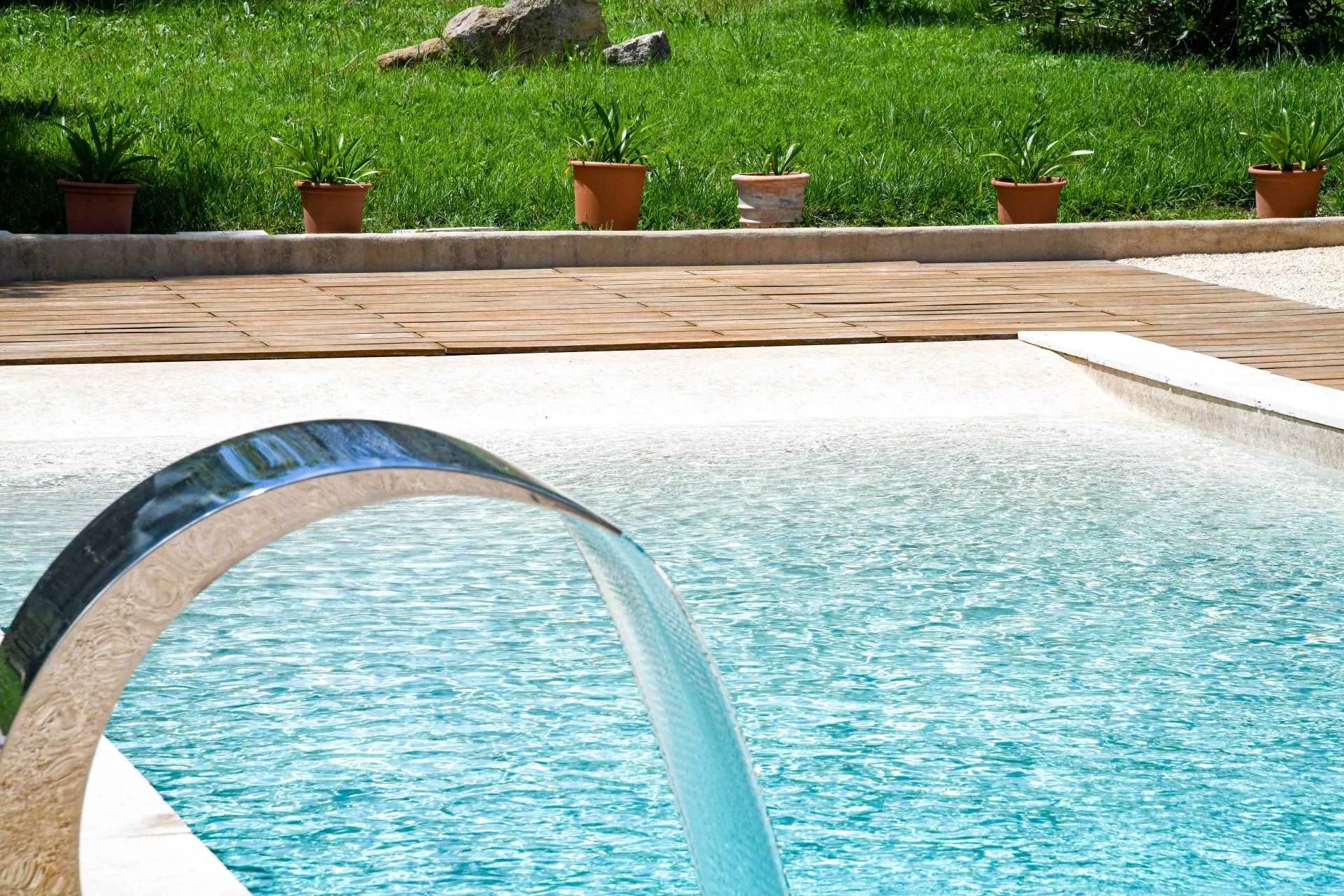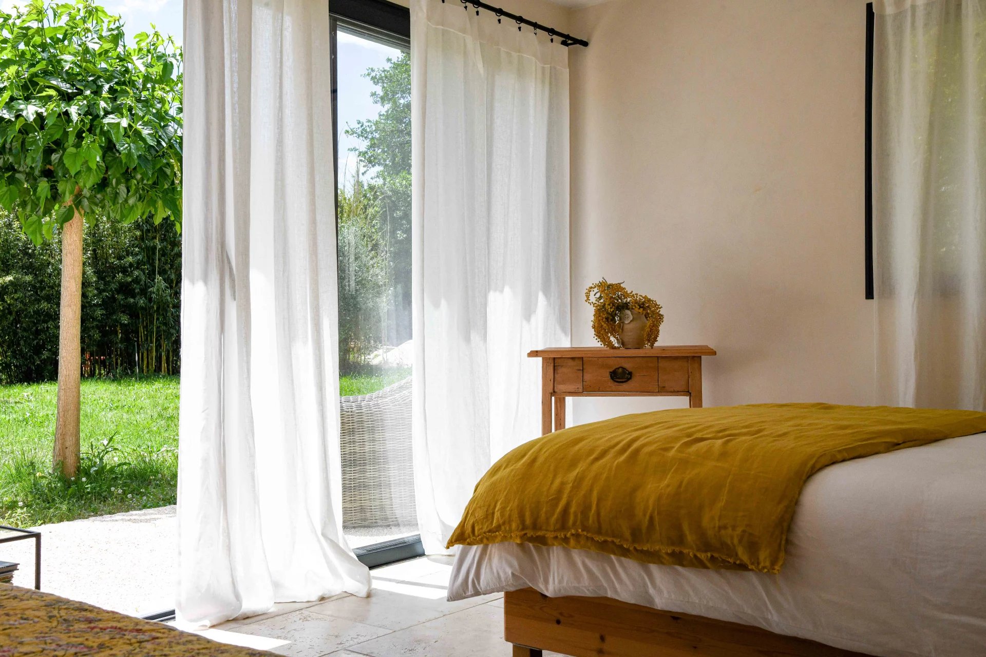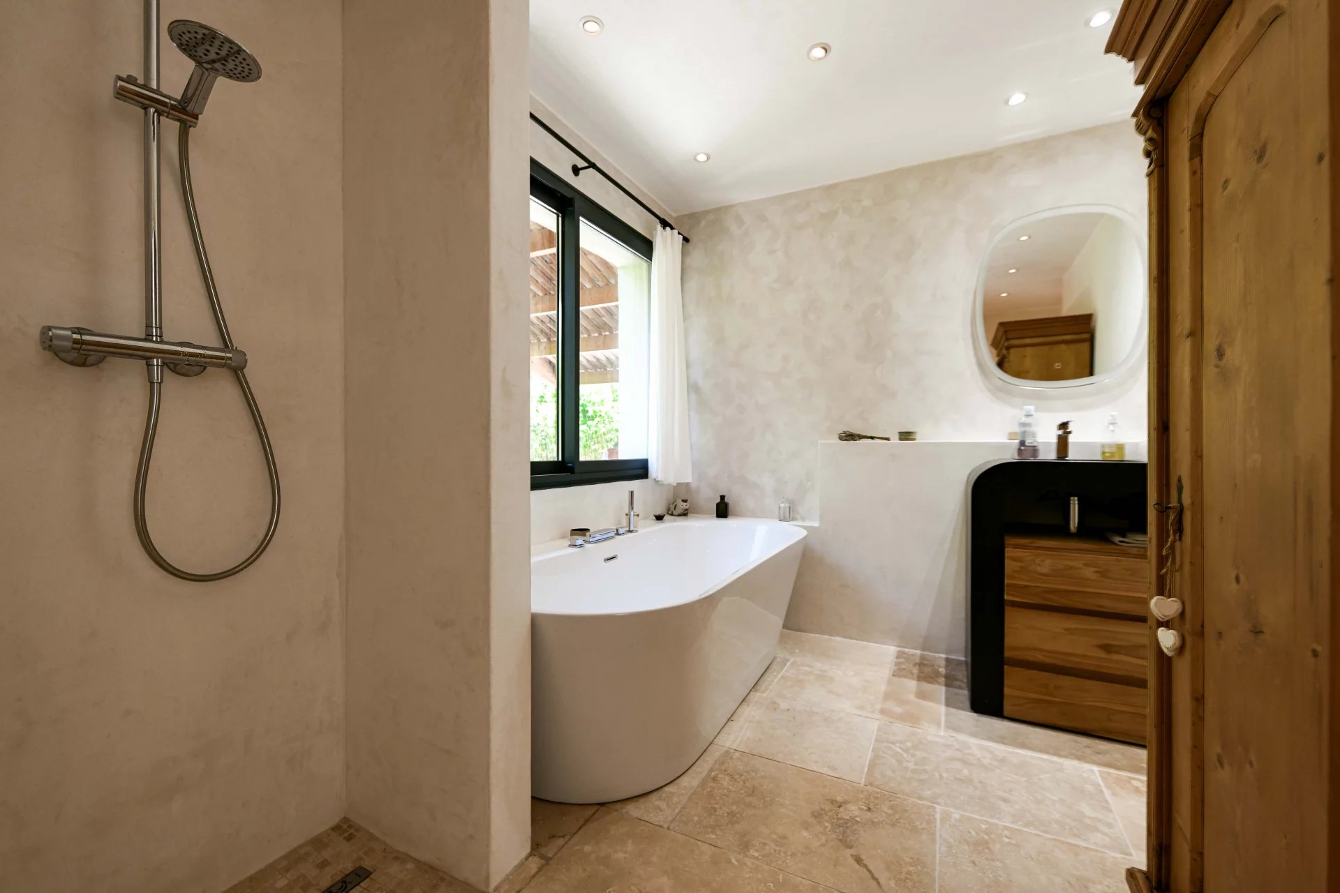 Entirely on one level, the sleeping area comprises three comfortable suites of 22, 22 and 30 m2, each with a good-sized bedroom, bathroom, dressing room and separate toilet. Each bedroom opens onto a terrace, the garden and the swimming pool.