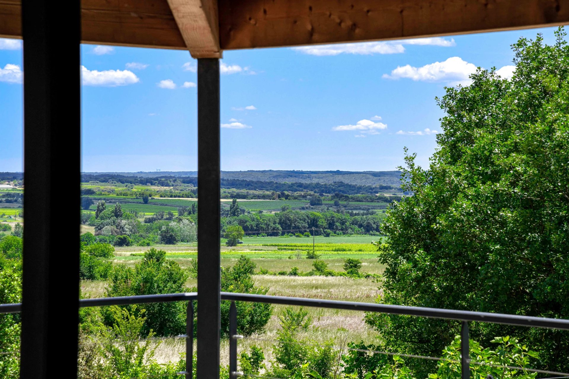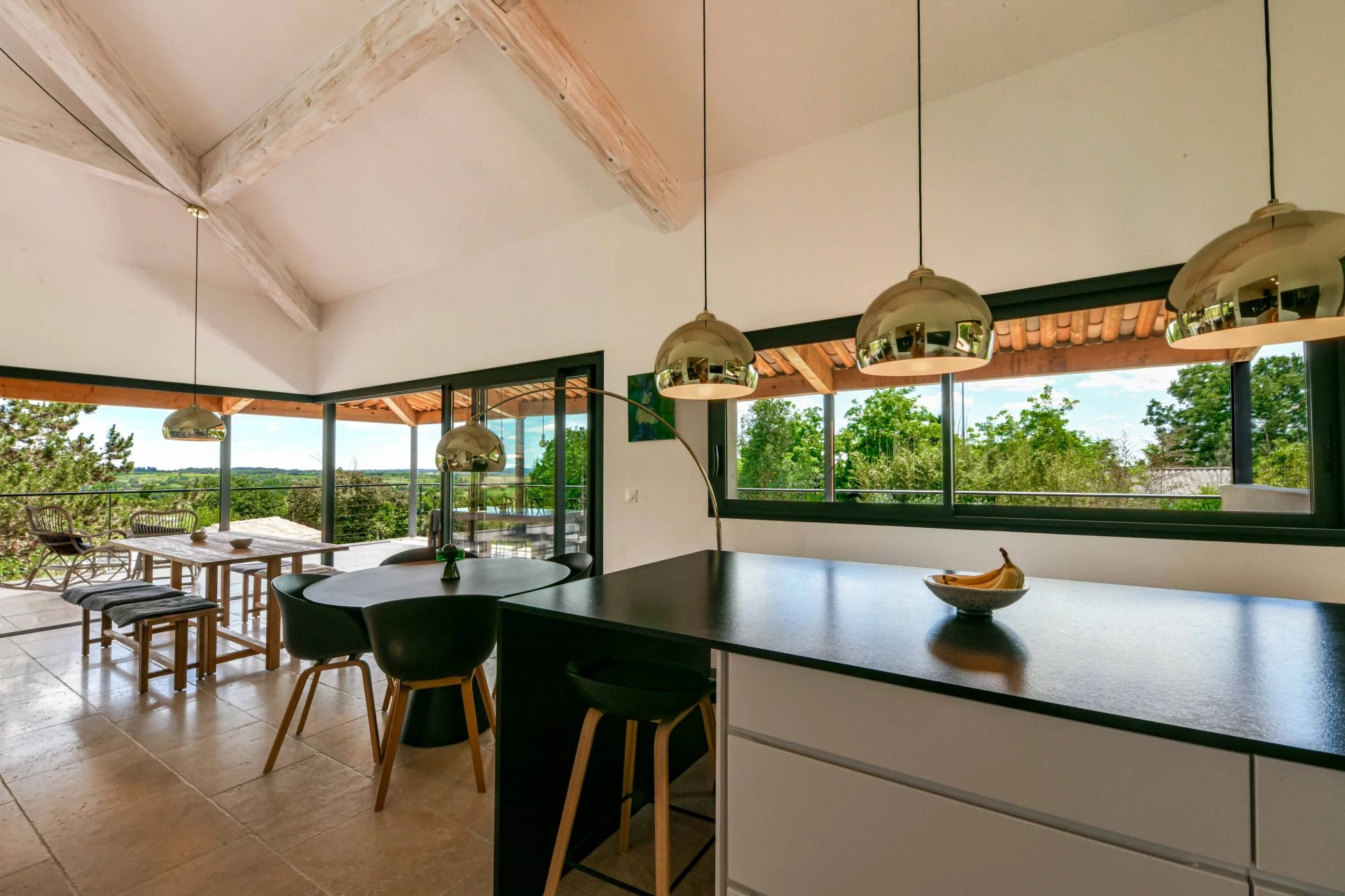 The suspended staircase in the entrance hall gives access to the reception area, comprising a lounge, a dining room and a fully fitted and equipped kitchen. This space opens via large sliding glass doors onto a covered terrace of more than 53 m2, providing an extension of the reception area and a very pleasant and serene indoor/outdoor feel. From inside or from the terrace, the panoramic views are breathtaking, with the surrounding countryside as a backdrop.
