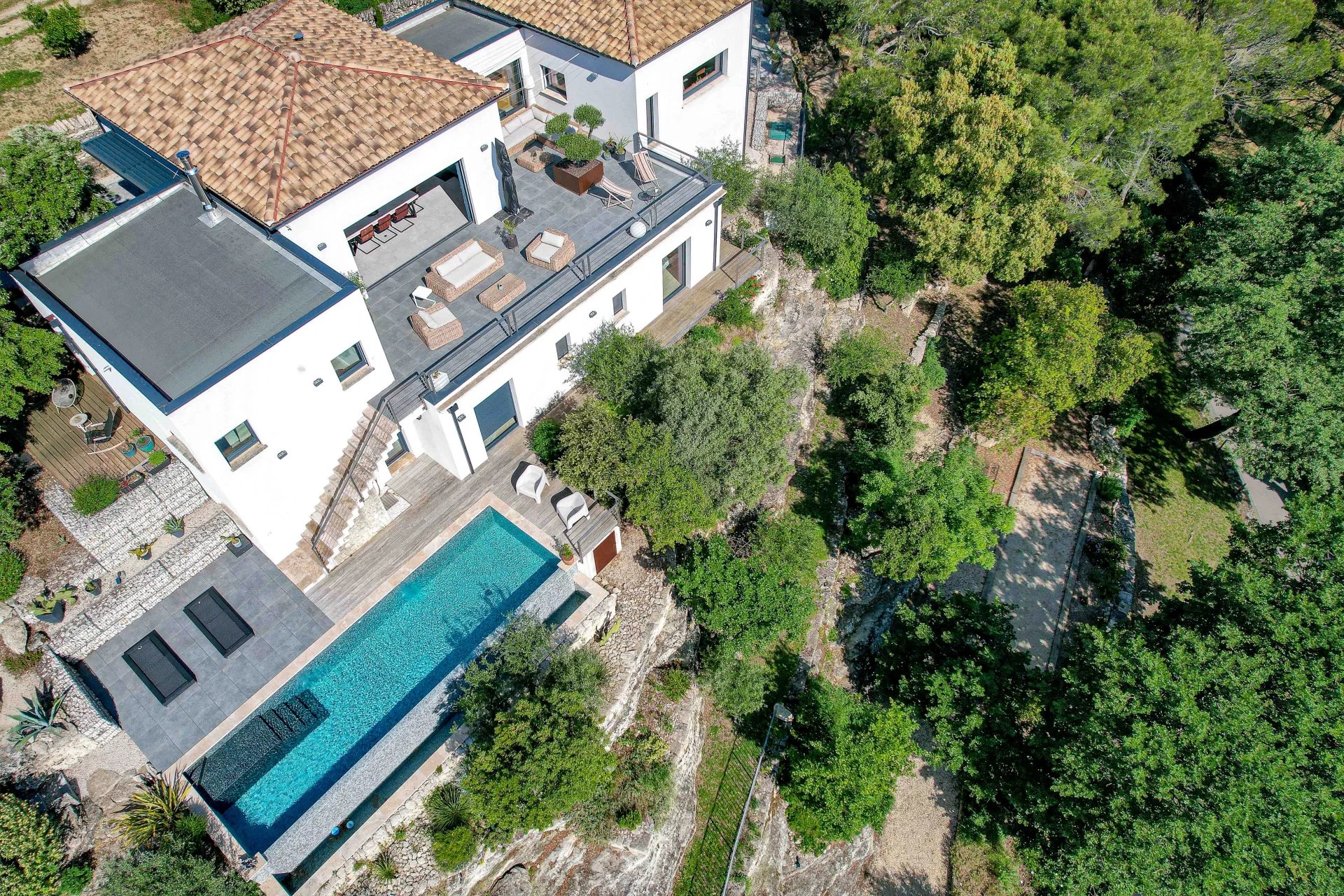 The fully enclosed garden is meticulously planted with various Mediterranean species. It features several intimate spaces, including a modern vegetable garden, a pizza oven with workshop, as well as a terrace, a boules court, and a large paved courtyard.