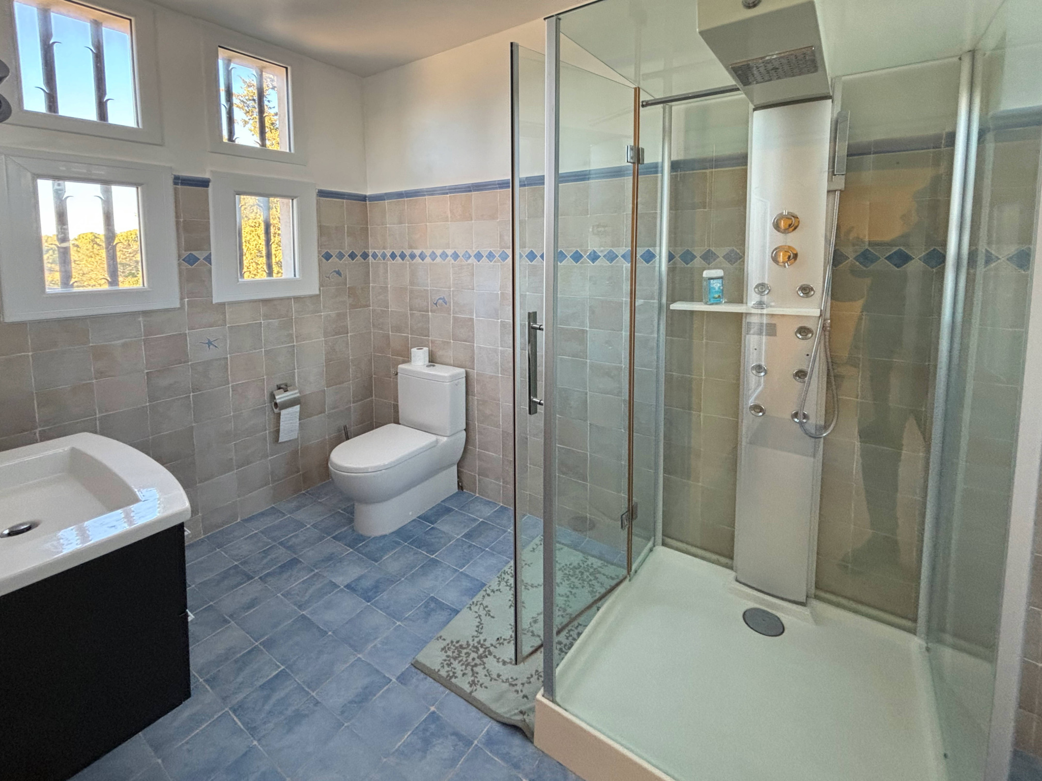 The sleeping area consists of four bedrooms, three of which are on the ground floor and share a bathroom, and a suite upstairs with its own shower room and a private terrace with an unobstructed view.
