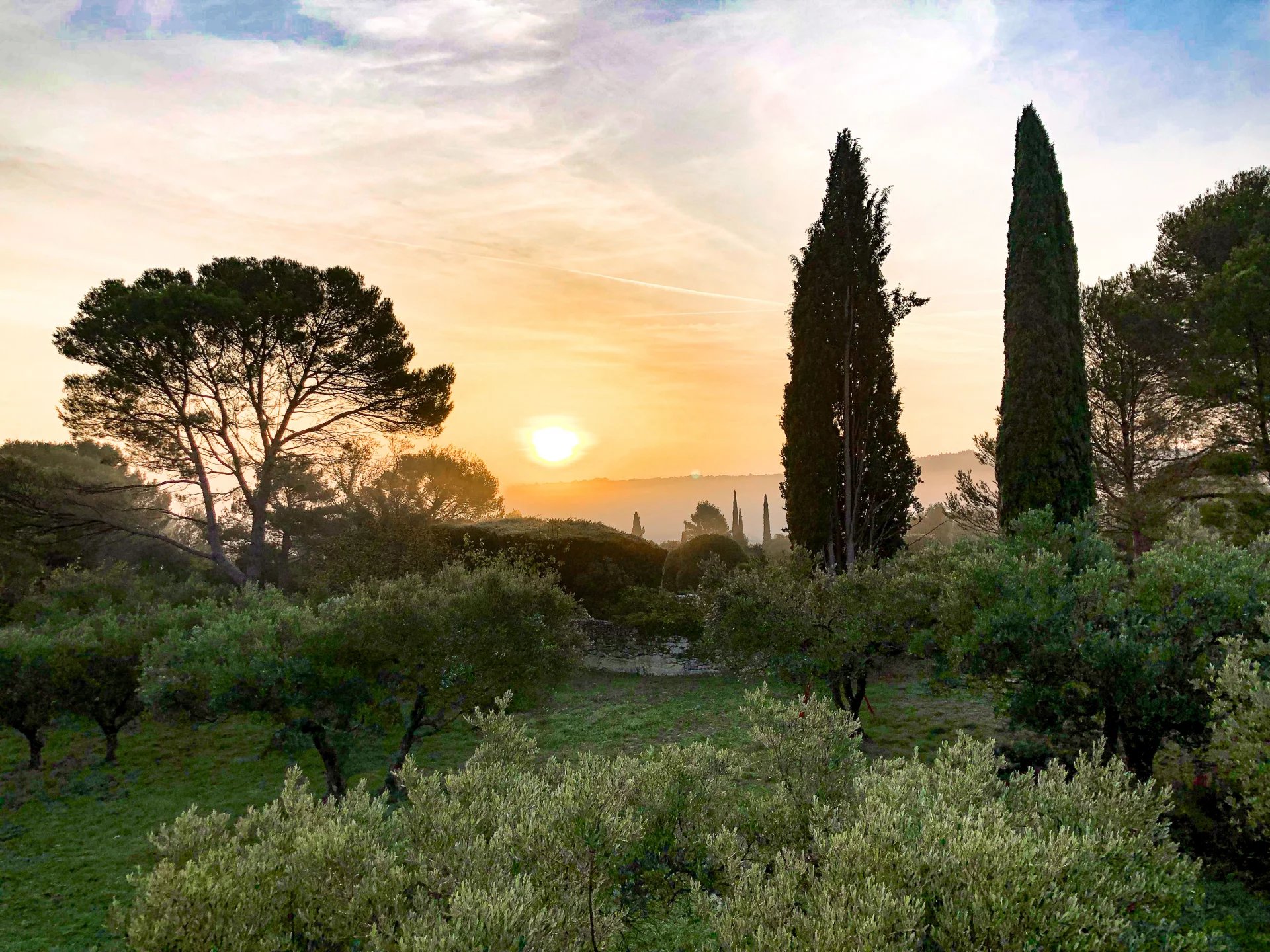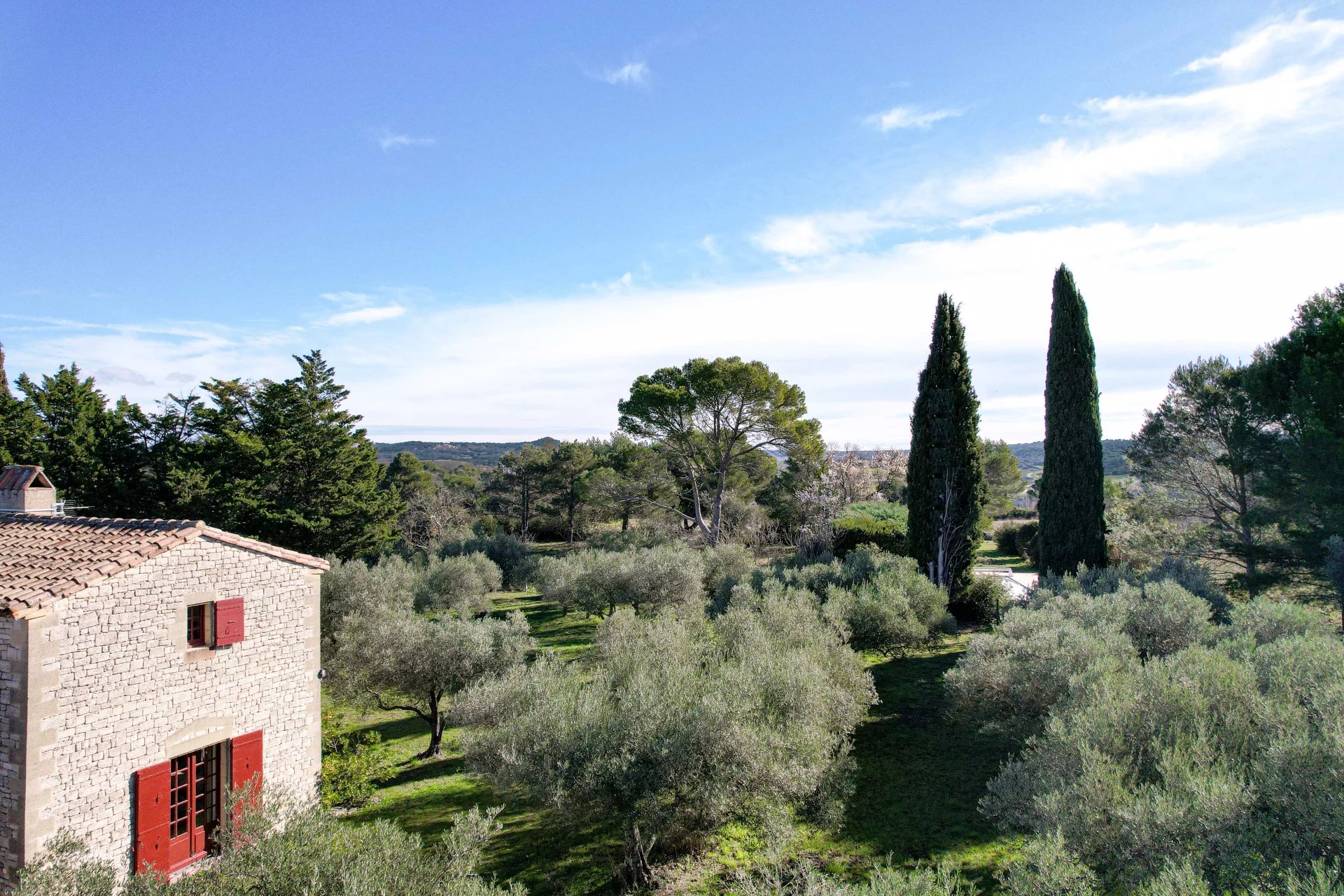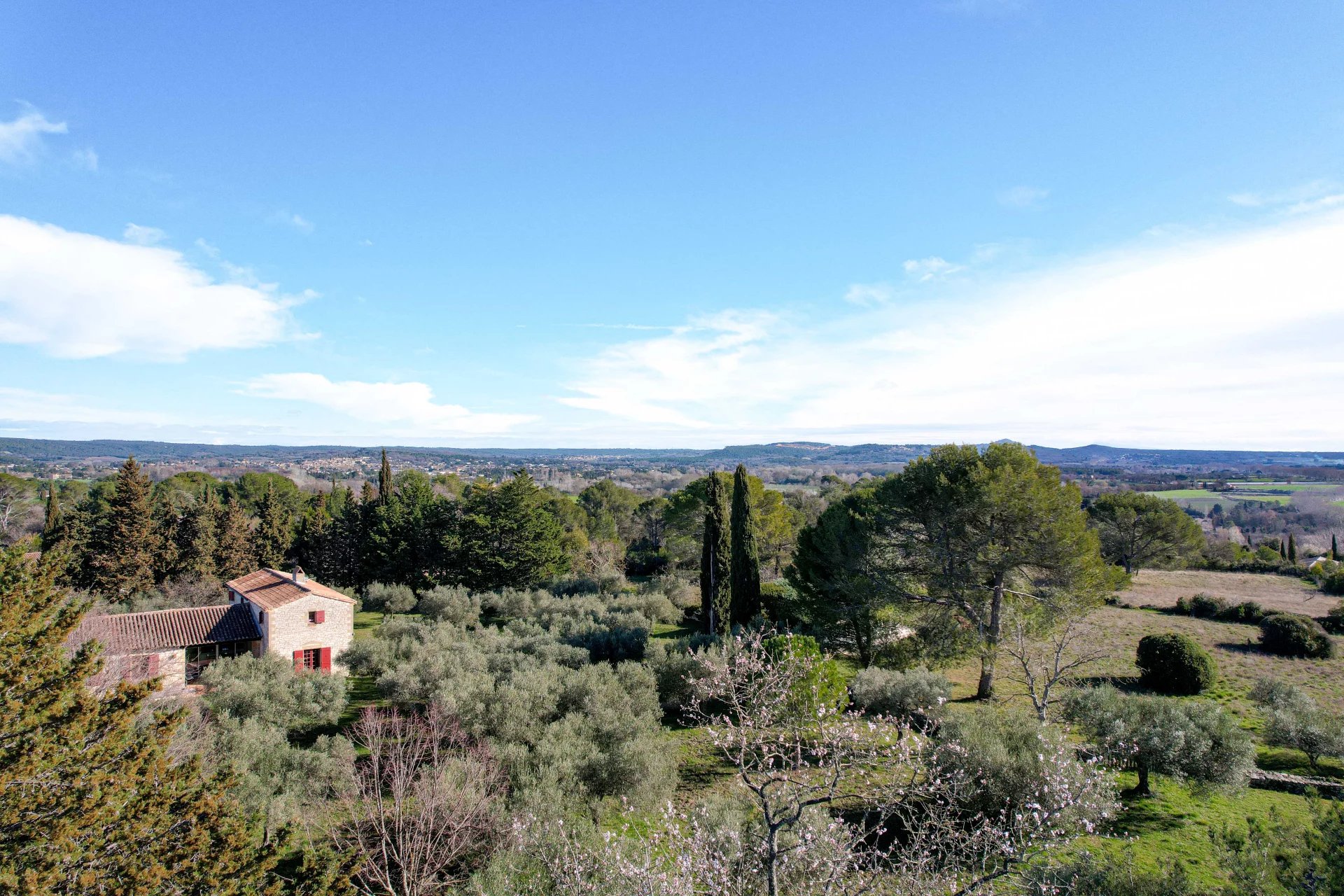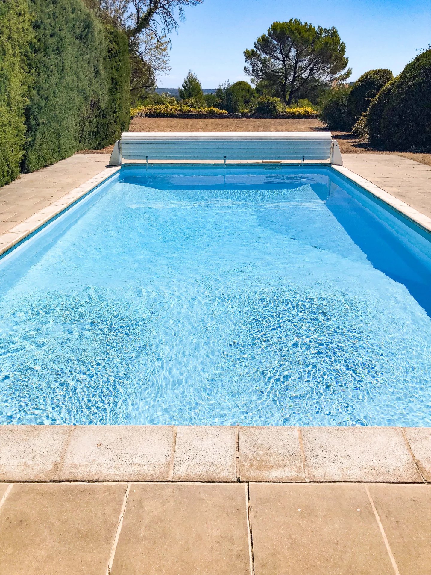 As soon as you go through the gates, you discover a park planted with major trees, interspersed with around a hundred olive trees. There are various areas bordered by attractive stone walls. There are lawn areas, areas with major trees such as umbrella pines or cypresses and a swimming pool area (10 x 5 with chlorine filtration) as well as several terraces.