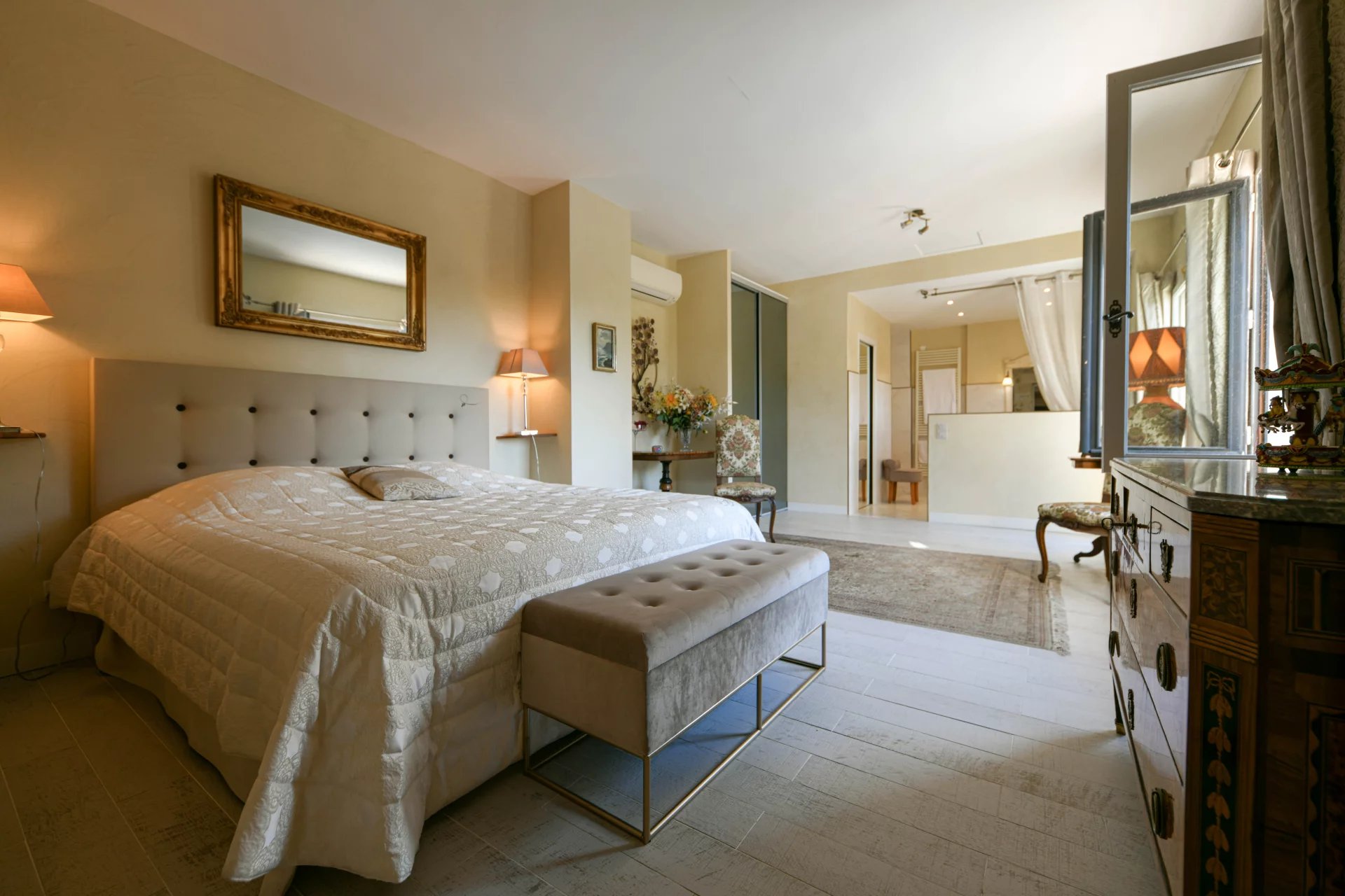 From the entrance hall, a staircase leads up to a large, light-filled master suite (33 m2), with an intimate relaxation area (TV lounge) and plenty of storage space. A delightful private terrace overlooks the garden. A second independent suite on the same level, accessed from the living room via an outside staircase, totals 35 m2 and also boasts a lovely, light-filled space with access to the south-facing terrace.