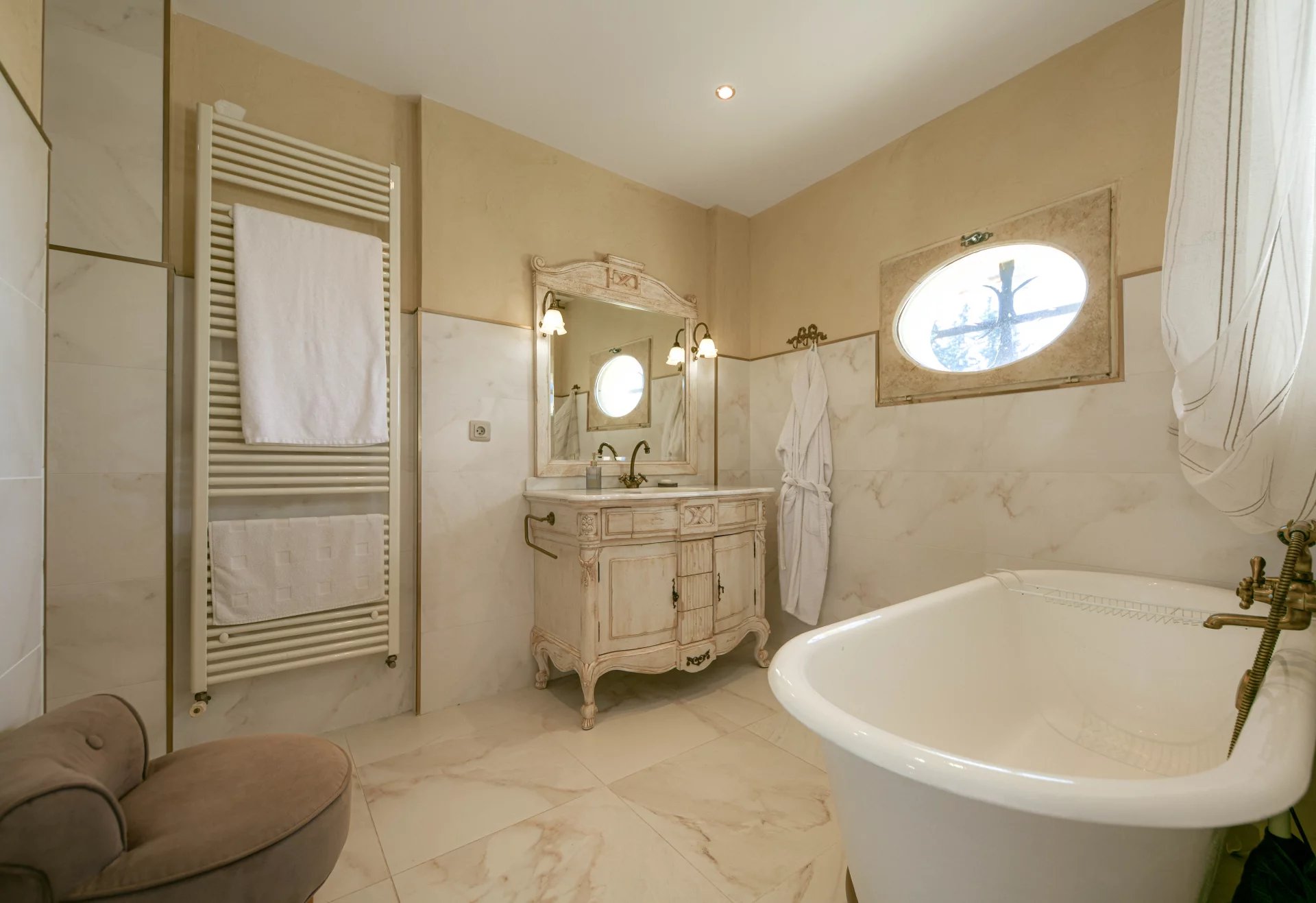 Gas-fired central heating and reversible air conditioning in each suite, double glazing, outbuildings, Jacuzzi.