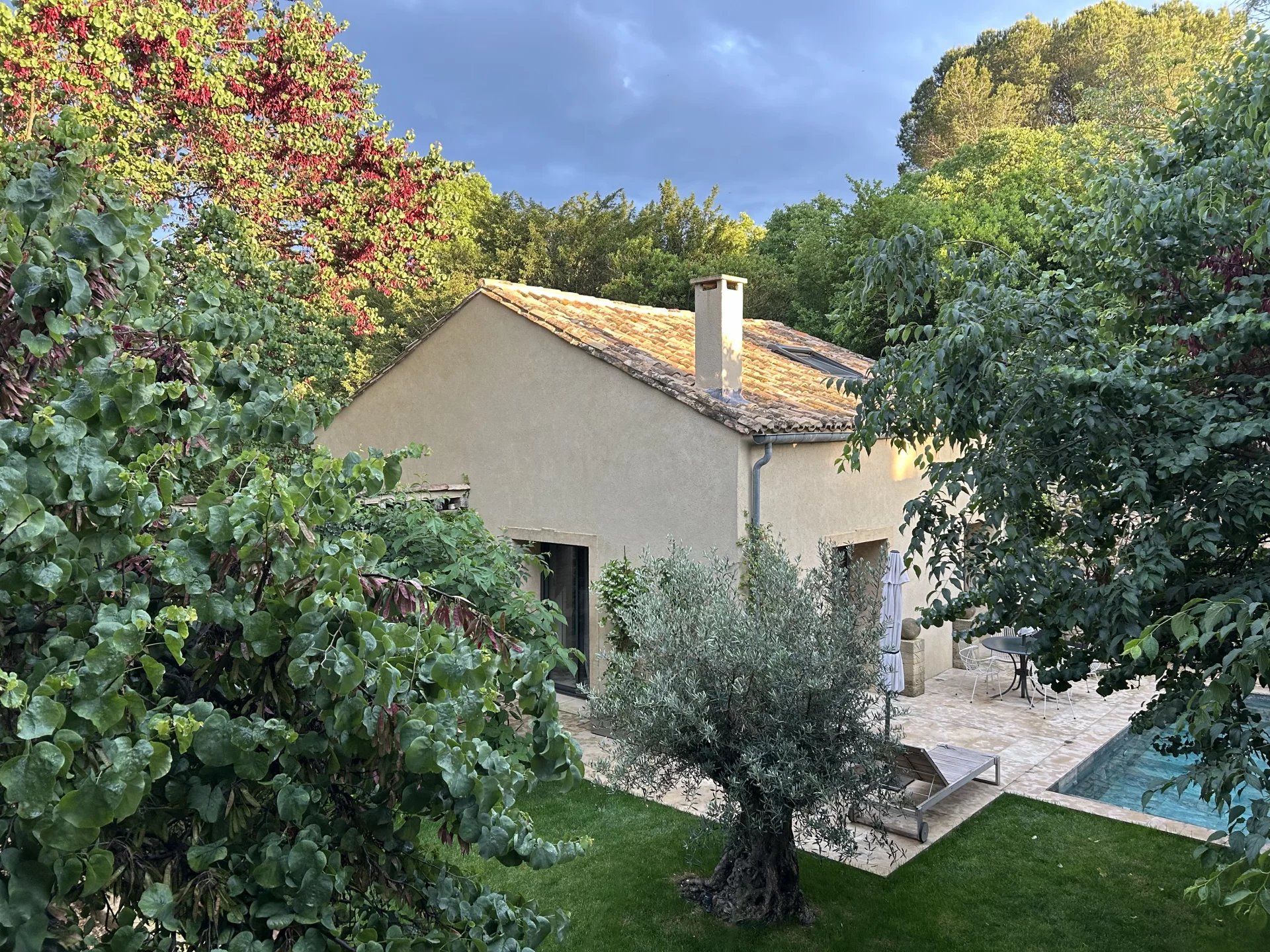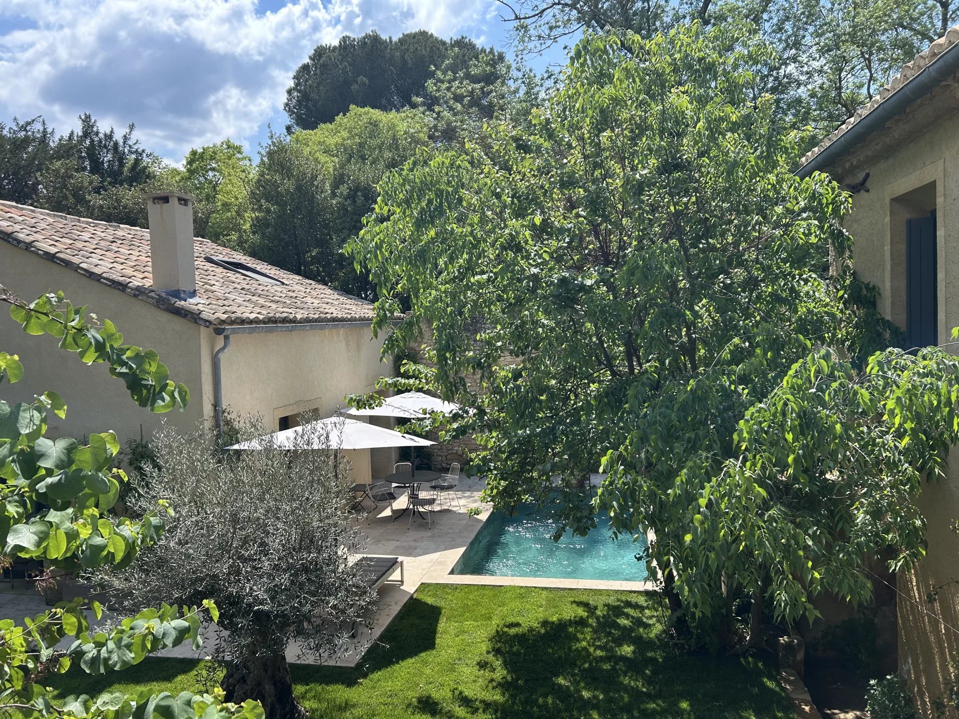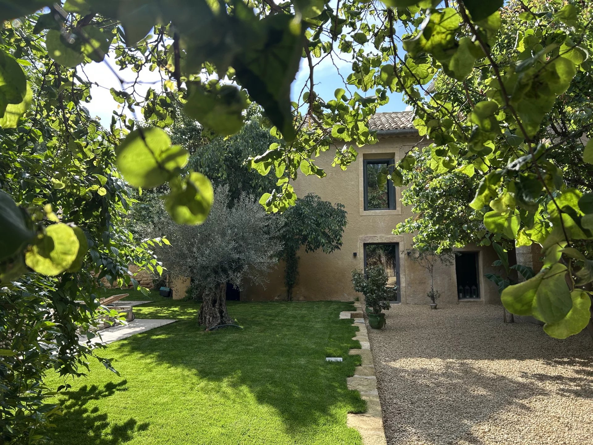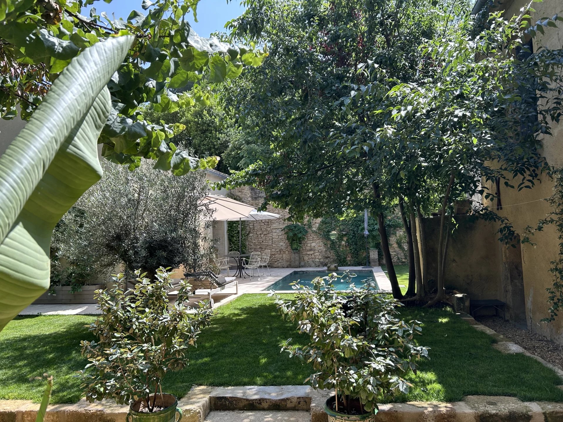 The swimming pool, ideally located on the grounds, faces the building and is fitted on the side of the guest house. It is surrounded by the garden, and its dry stone walls blend in beautifully with the southern vegetation. A second sheltered summer lounge is conveniently located next to the guest house, offering privacy for guests.