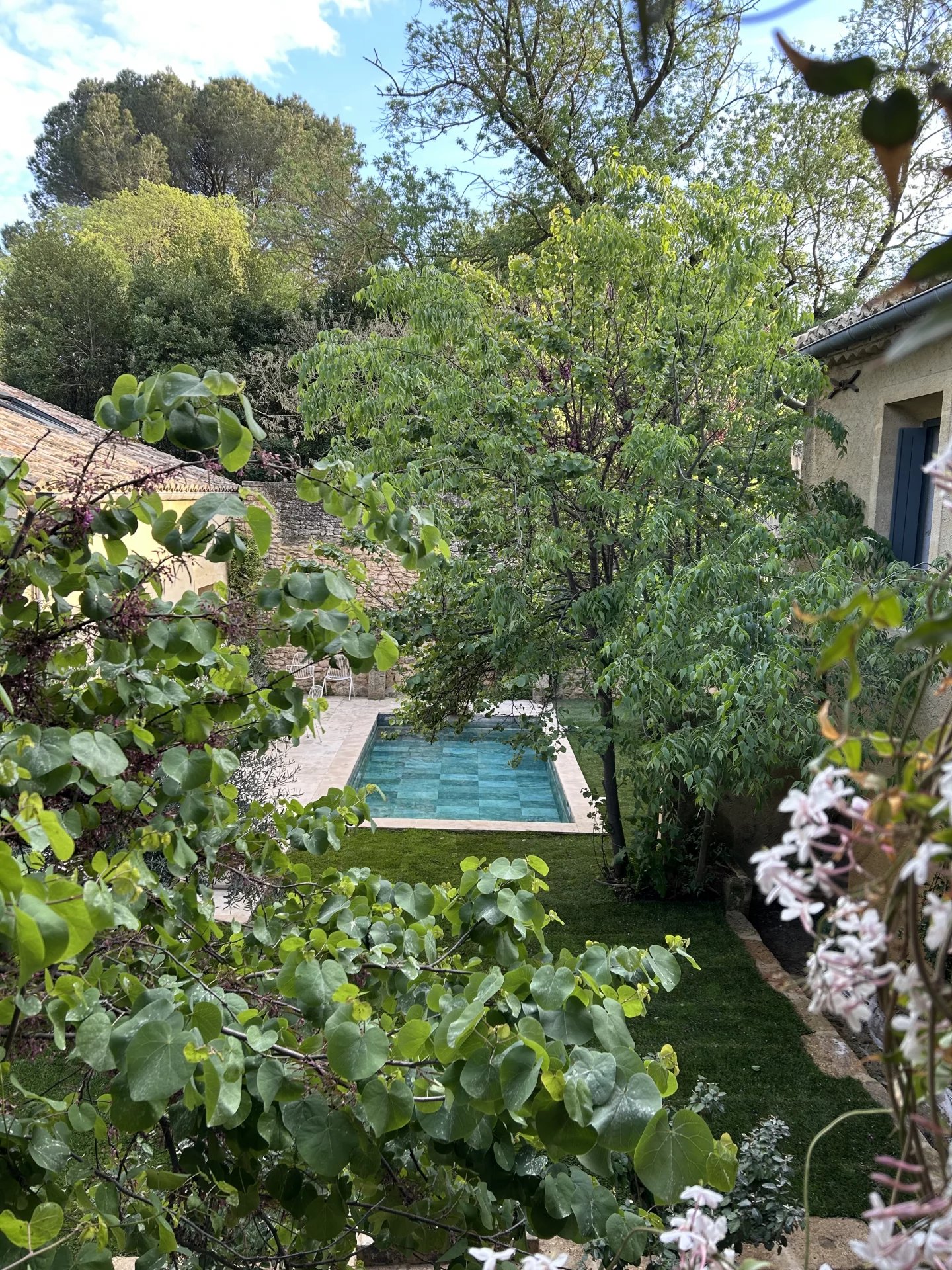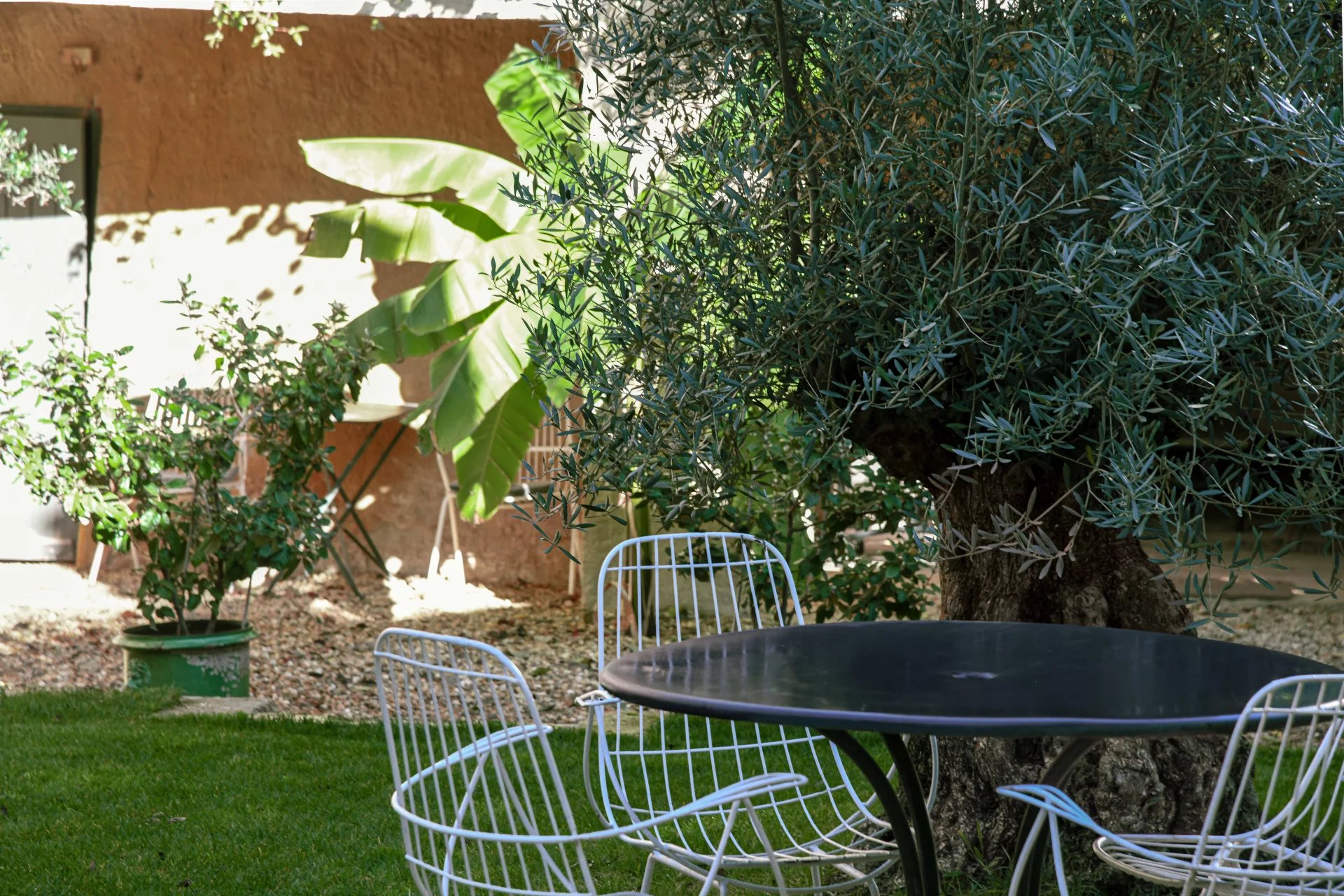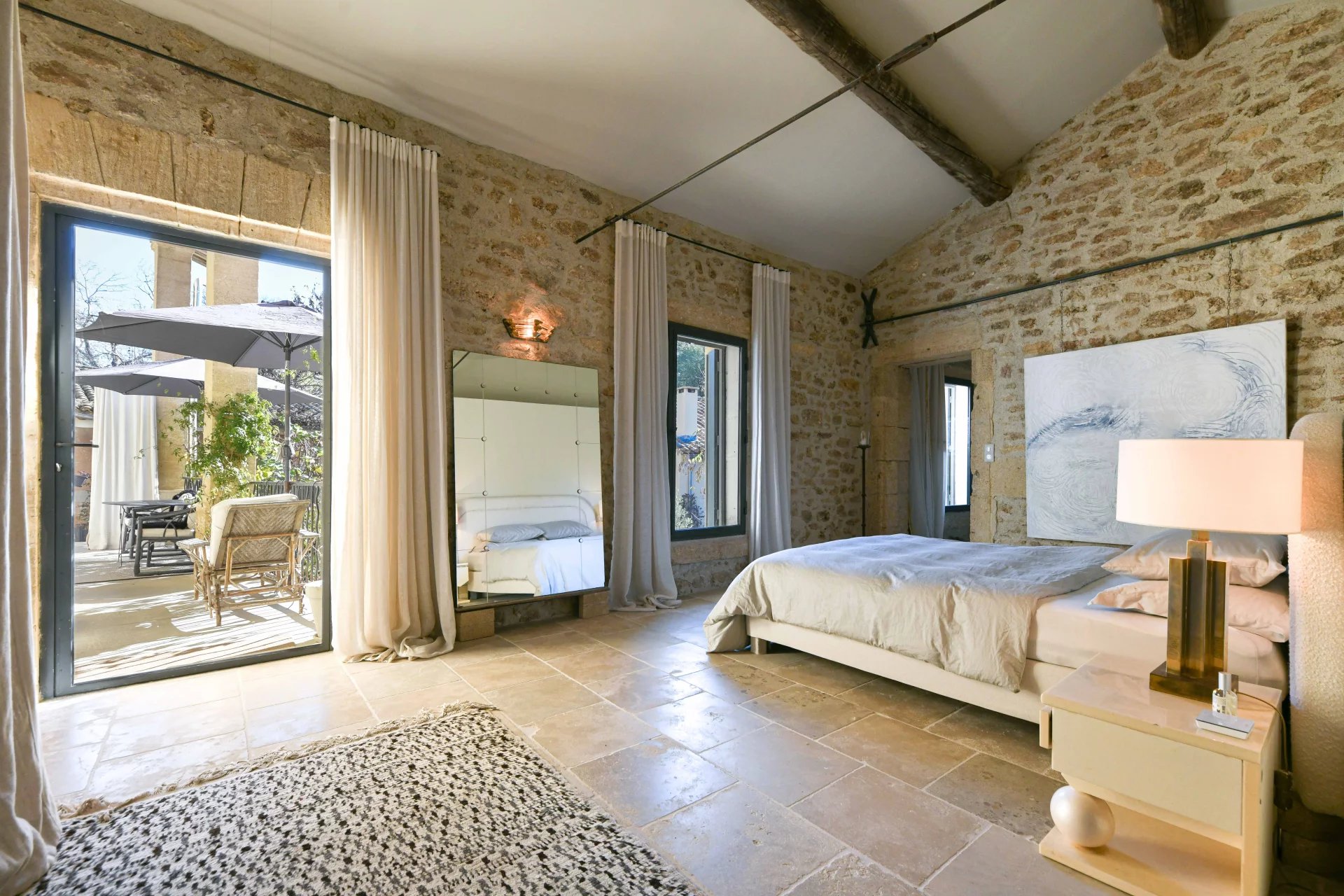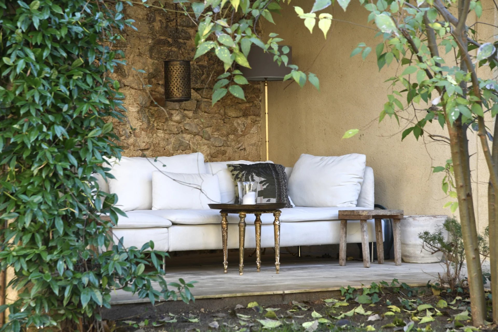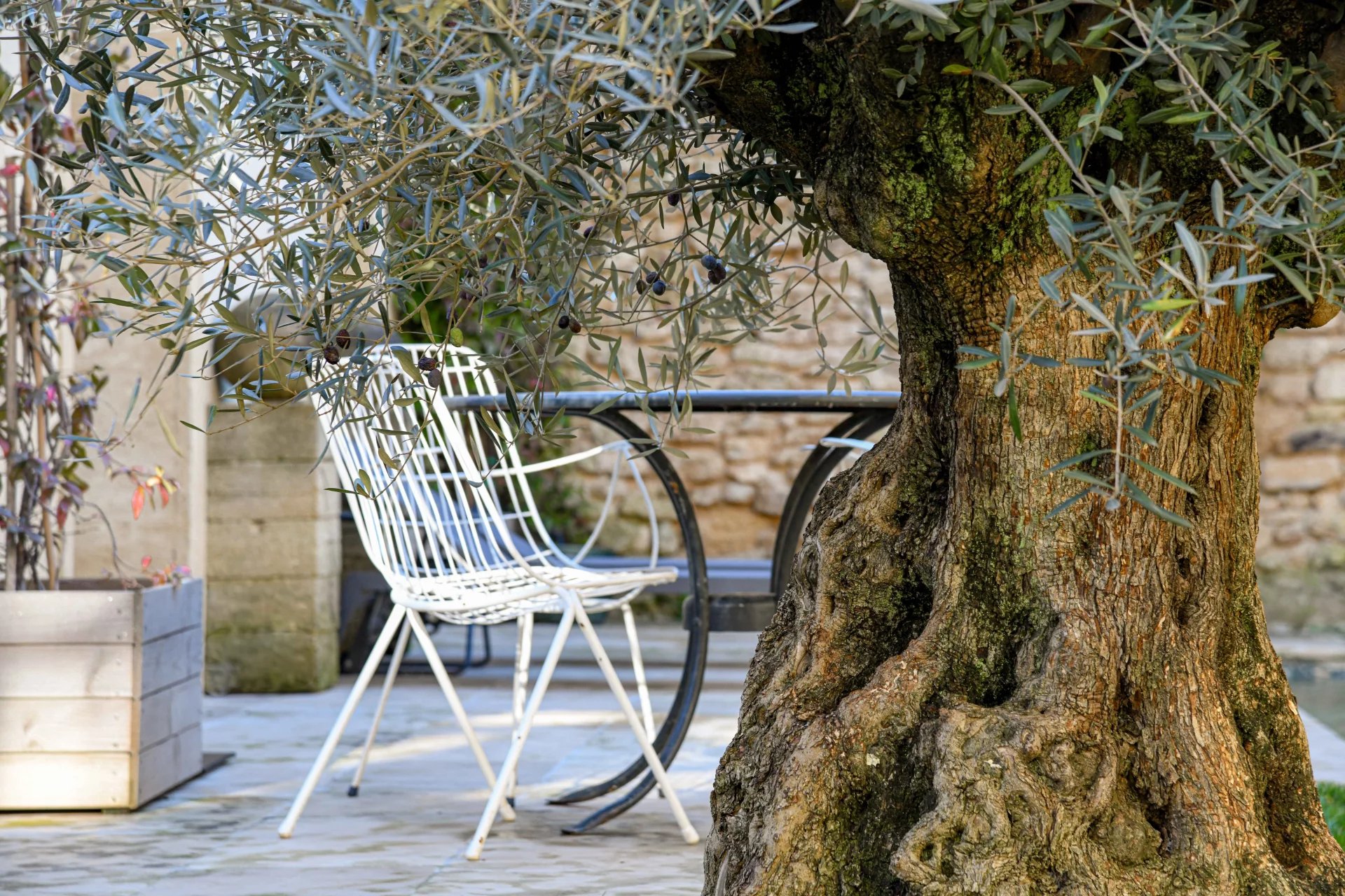 The swimming pool, ideally located on the grounds, faces the building and is fitted on the side of the guest house. It is surrounded by the garden, and its dry stone walls blend in beautifully with the southern vegetation. A second sheltered summer lounge is conveniently located next to the guest house, offering privacy for guests.
