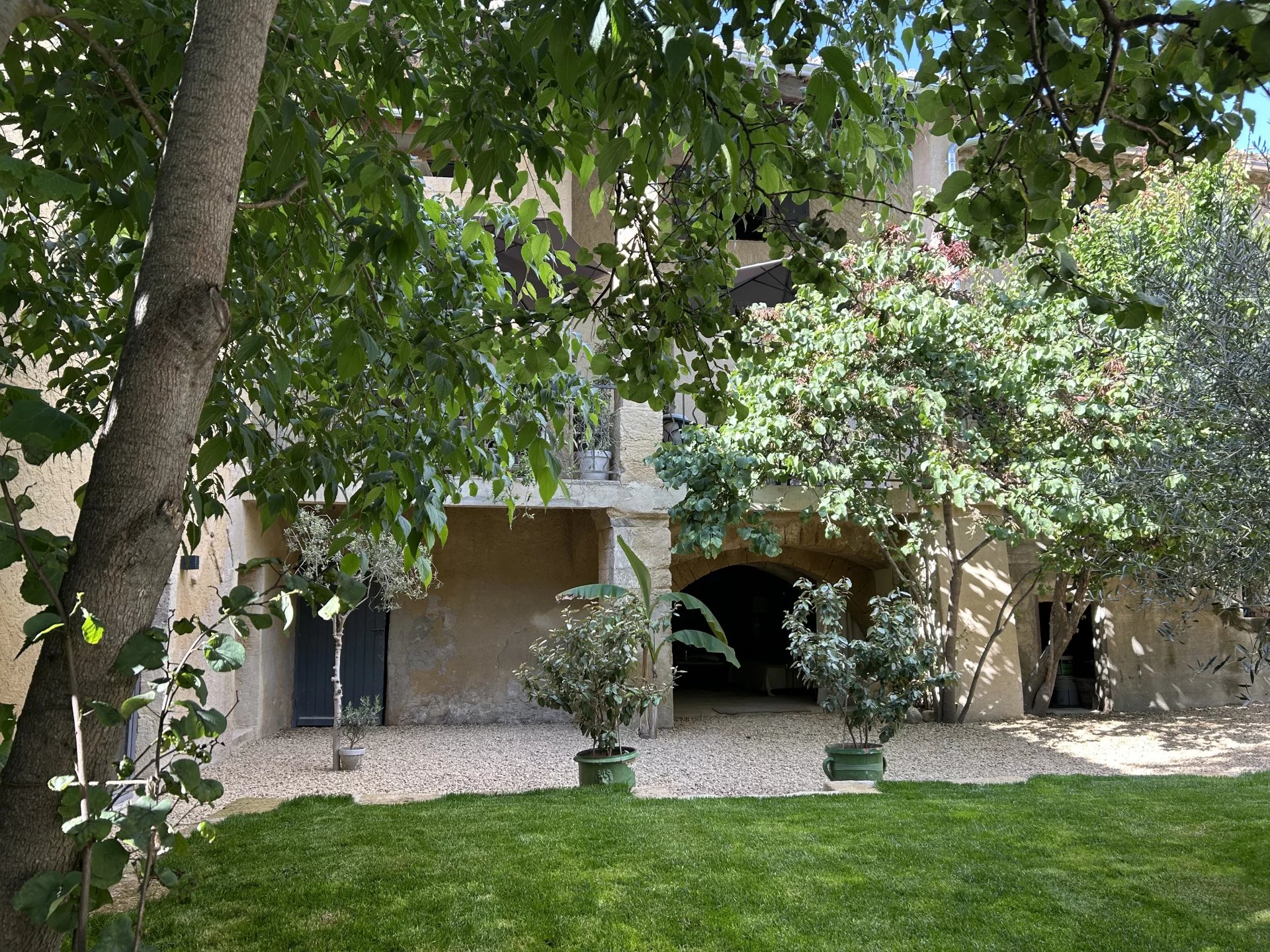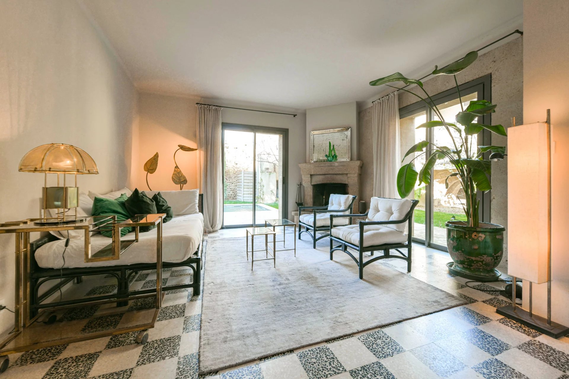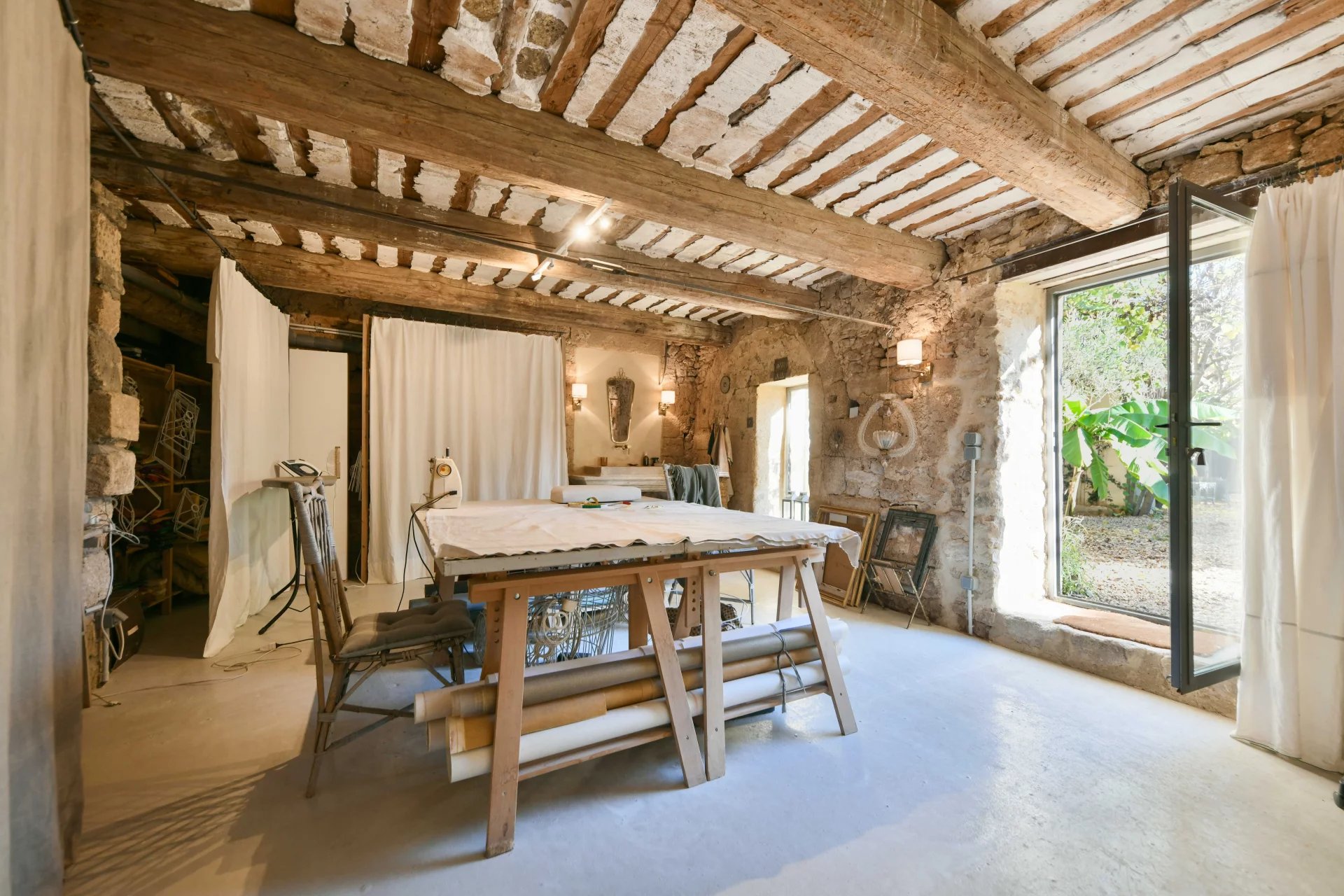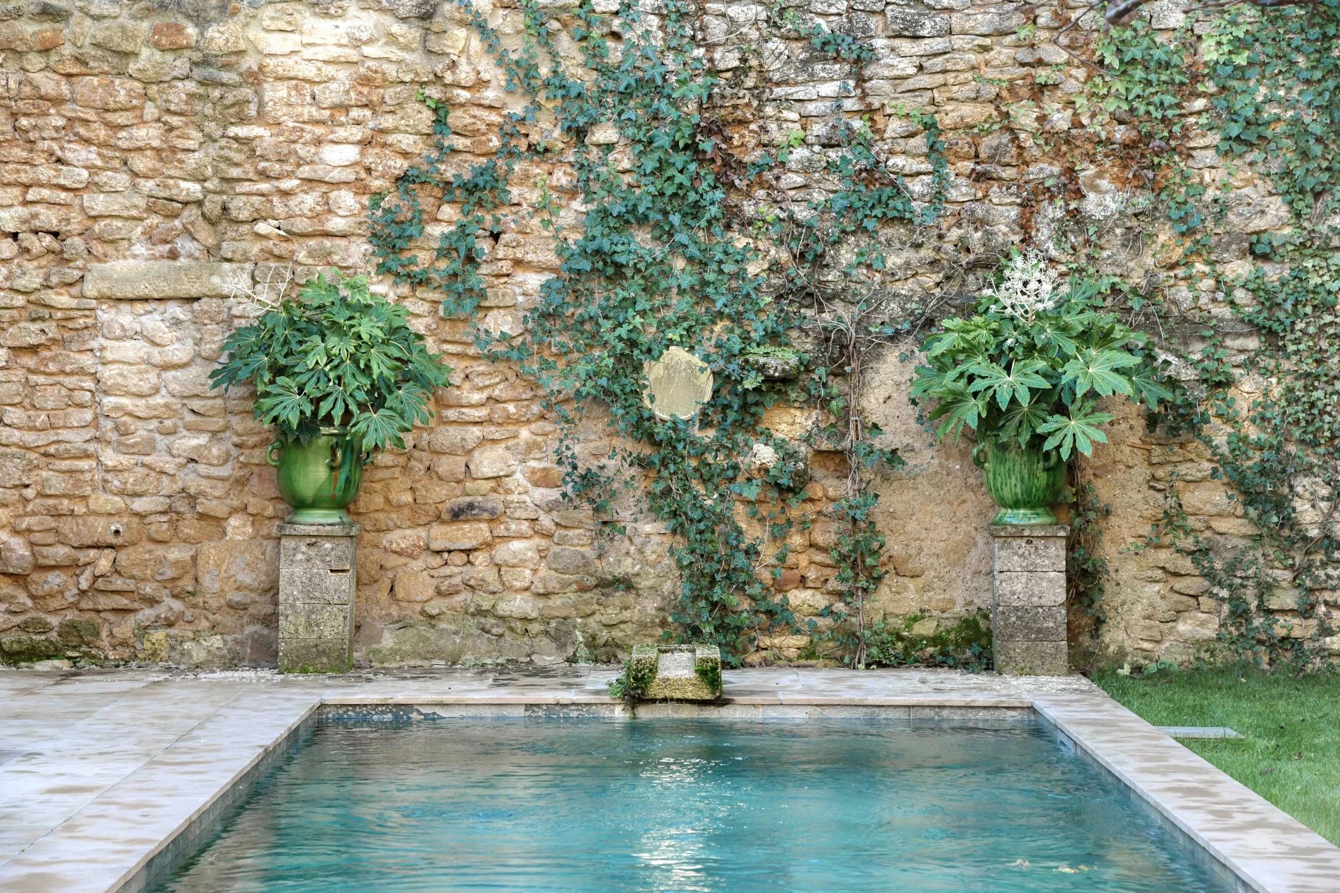 The swimming pool, ideally located on the grounds, faces the building and is fitted on the side of the guest house. It is surrounded by the garden, and its dry stone walls blend in beautifully with the southern vegetation. A second sheltered summer lounge is conveniently located next to the guest house, offering privacy for guests.