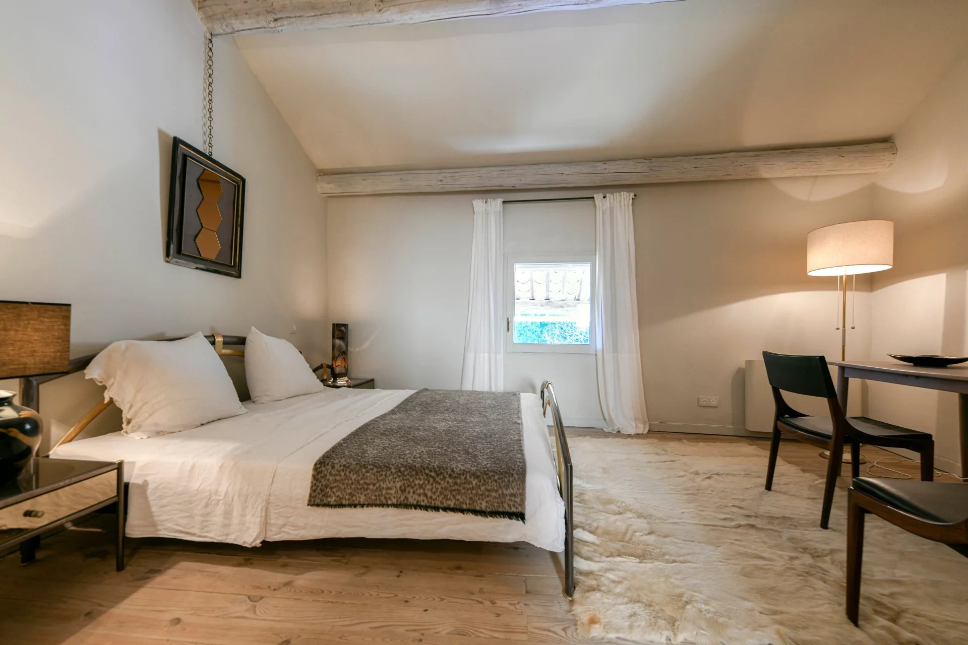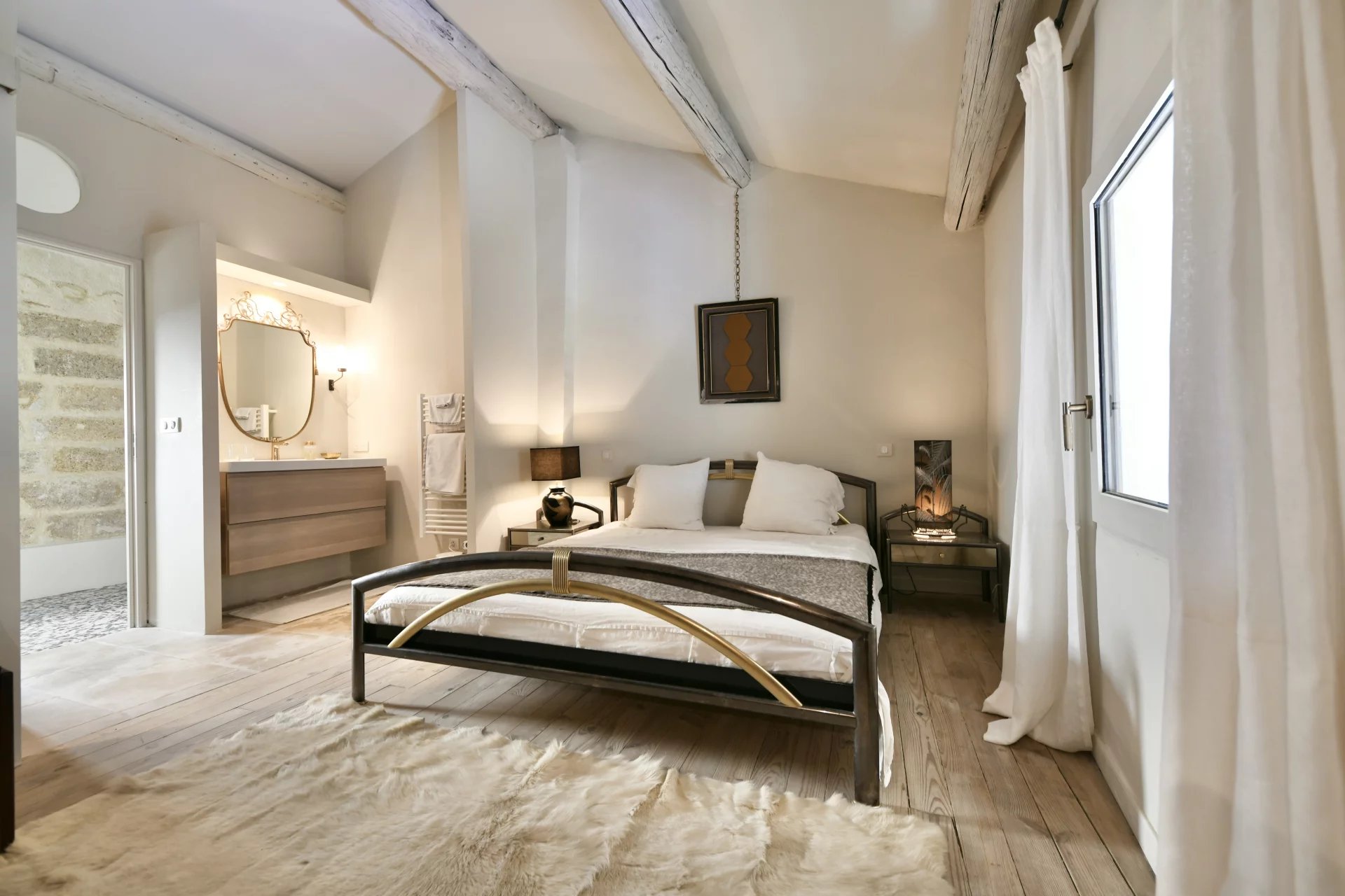 The main suite of the property (37 m2), accessible from the TV lounge, benefits from double-height ceilings, giving it an extraordinary volume. The bedroom is complemented by a bathroom (walk-in shower, washbasin, and separate toilet, as well as a second bathroom with a very elegant bathtub). This suite also has access to the terrace.