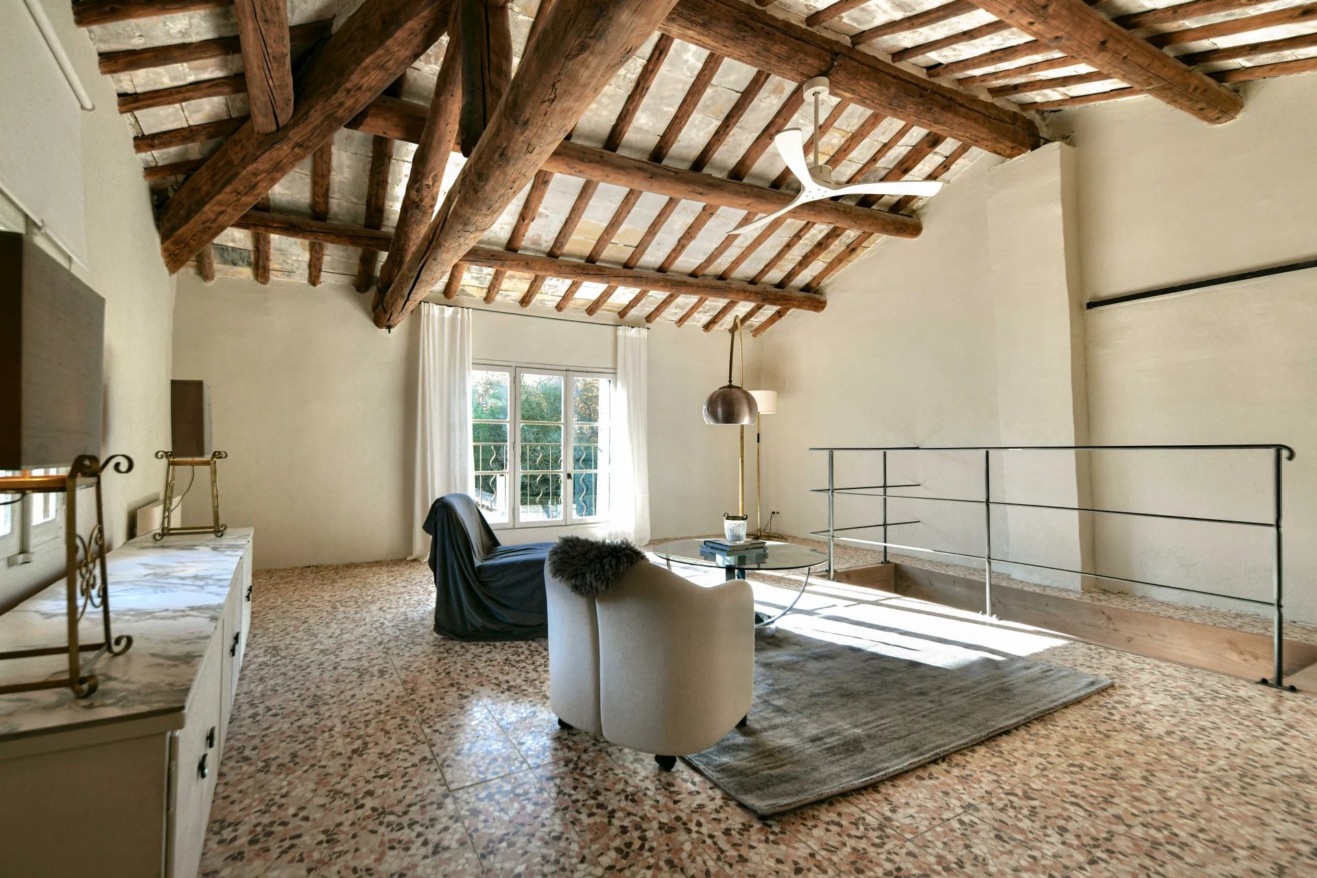 In the living rooms, accessed via a staircase leading to the terrace running along the entire reception area, the large living room offers a most appealing atmosphere: the central fireplace provides an ideal layout for the living room (28 m²); it echoes the superb wooden ceilings. Adjacent to this is the fitted kitchen (23.60 m2), which connects to the dining room (22.60 m2) and the office/TV lounge (24.30 m2). This 98 m2 living quarters area opens onto the south-facing terrace and offers exceptional light.