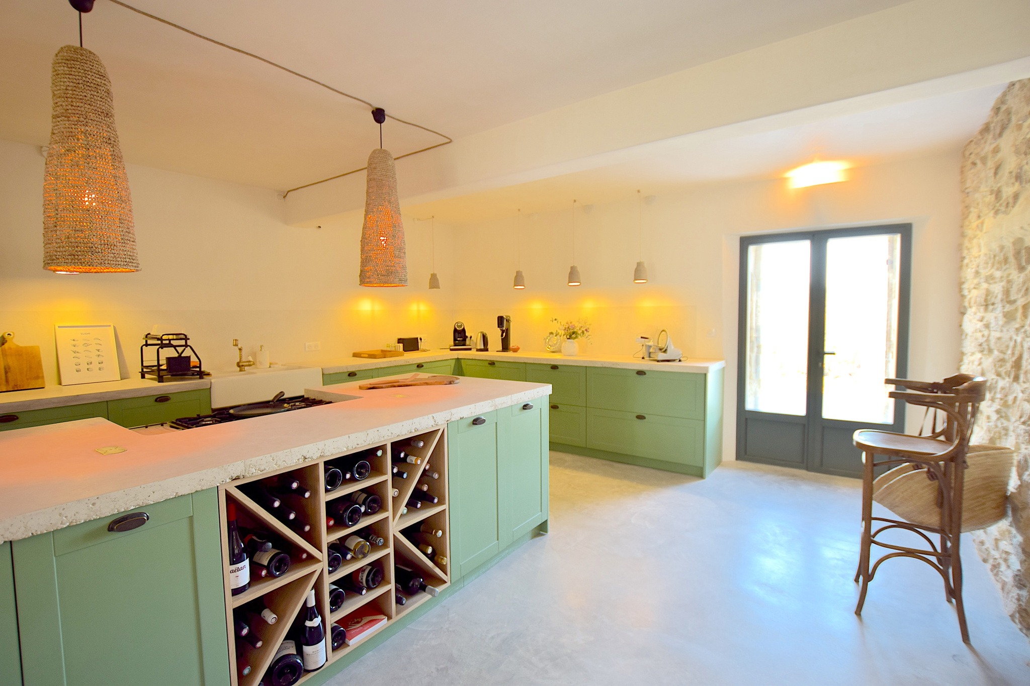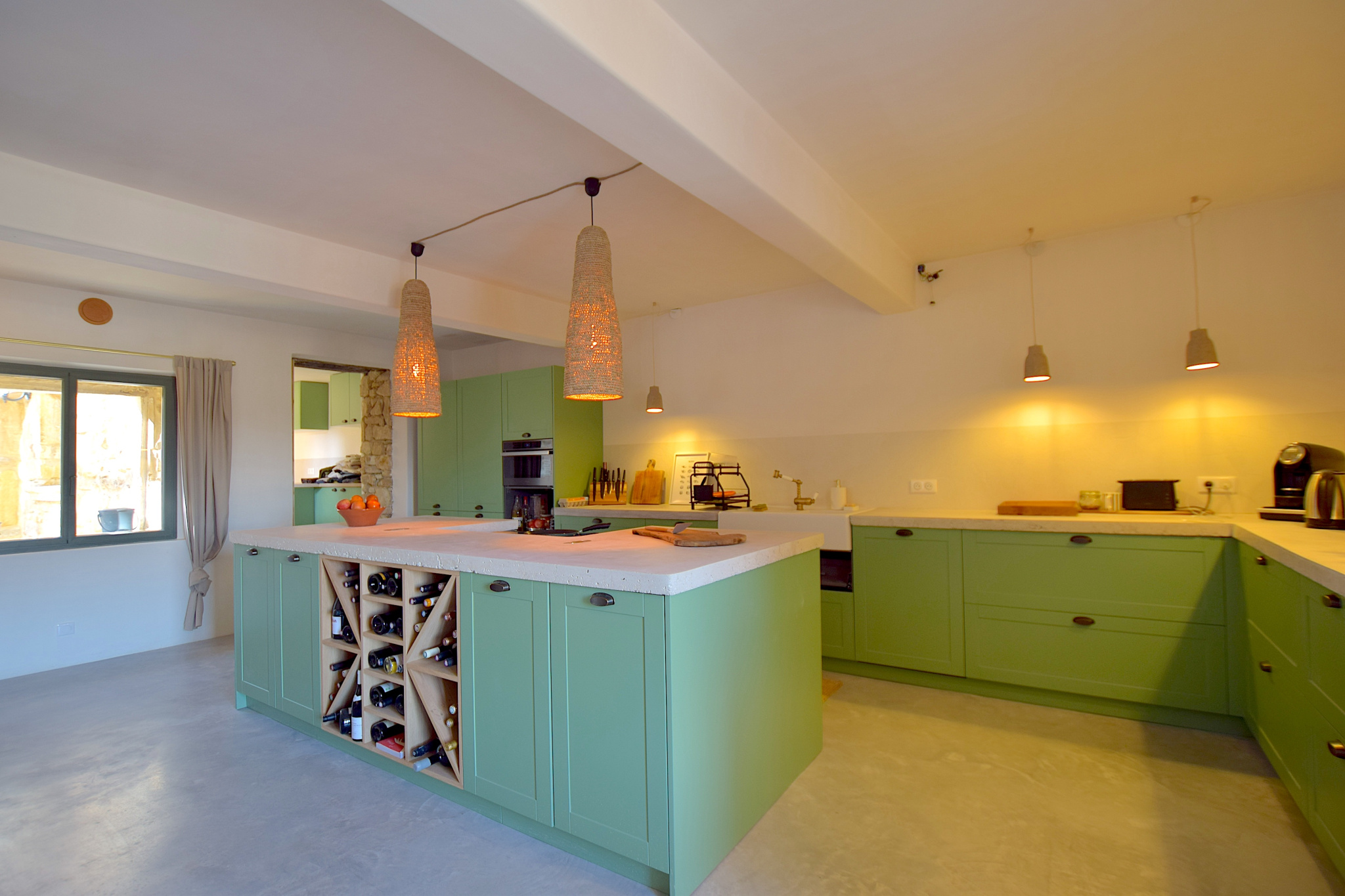 Spanning 200 m2, the main house features an open-plan living area on the ground floor comprising a spacious fitted kitchen with concrete worktops, and an adjoining utility room/storeroom. The centrally-located dining room and adjoining lounge benefit from large bay windows on either side, bringing light into the living areas, with high ceilings adding to the feeling of space. Courtesy WC. Wine cellar.