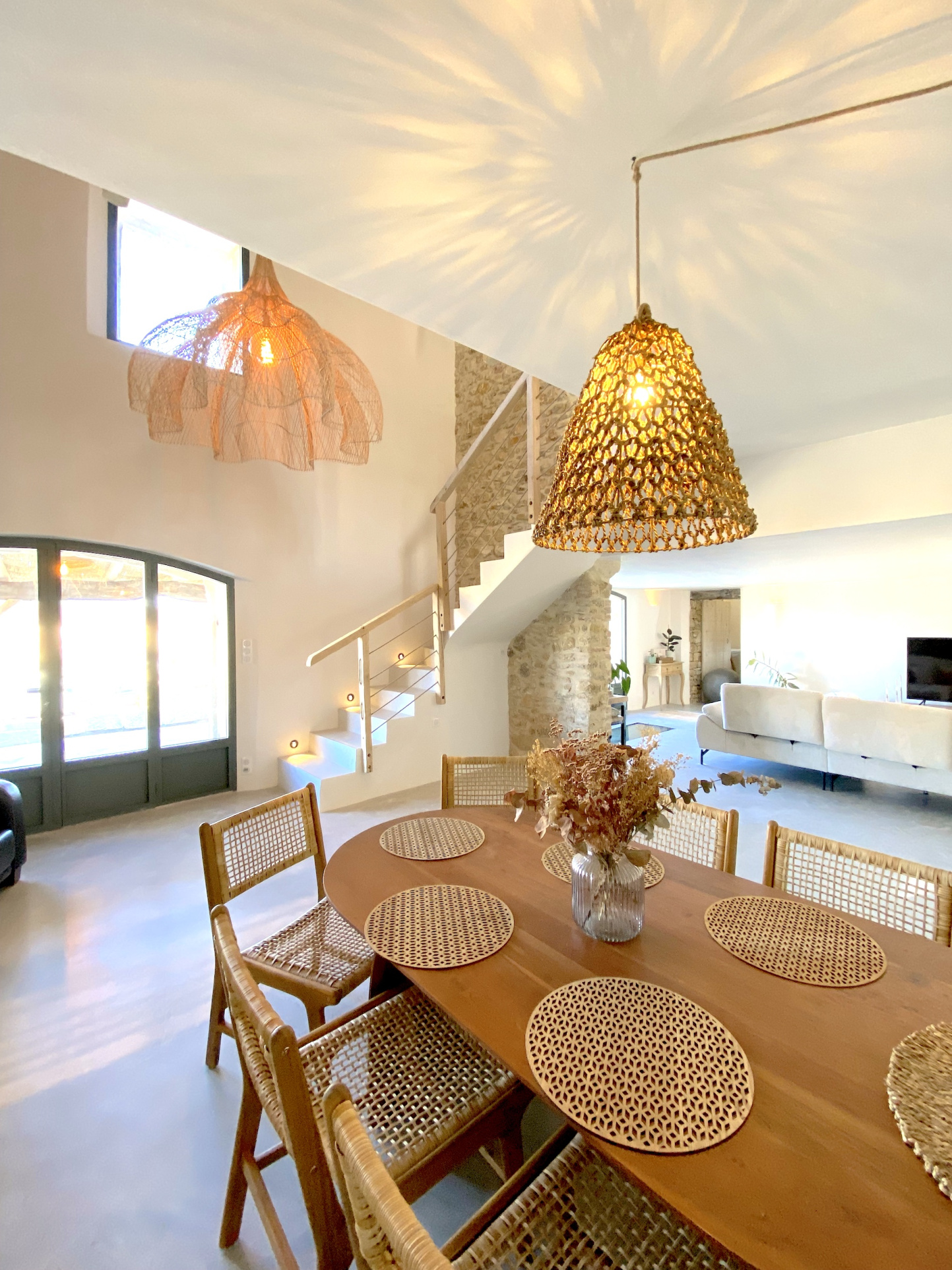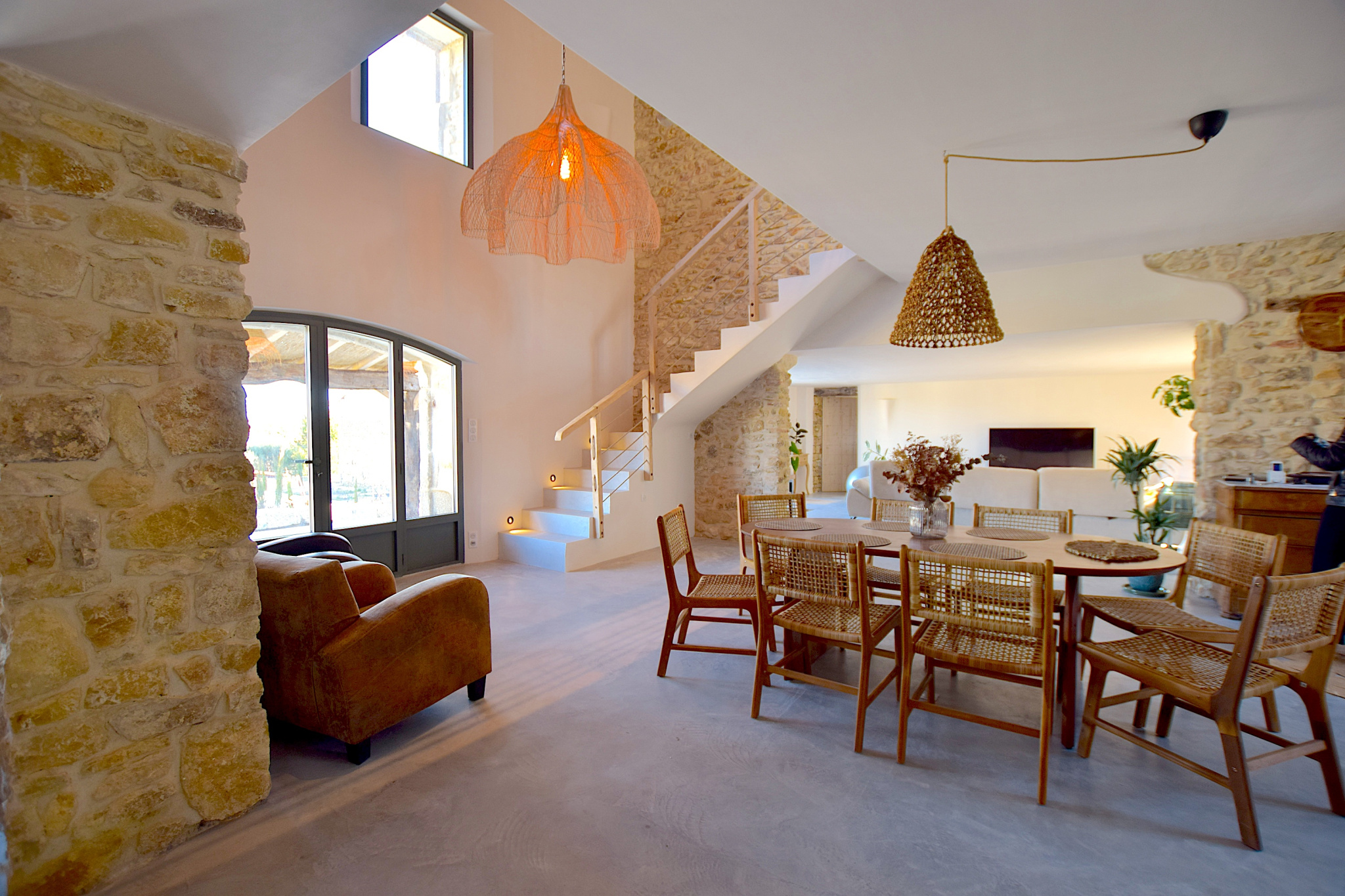 Entirely renovated to open up the spaces and create a warm, uncluttered atmosphere, using simple yet refined materials: exposed stone, untreated wood, plastered walls with a waxed concrete floor heated and cooled by a heat pump, giving it an excellent A/A energy rating.